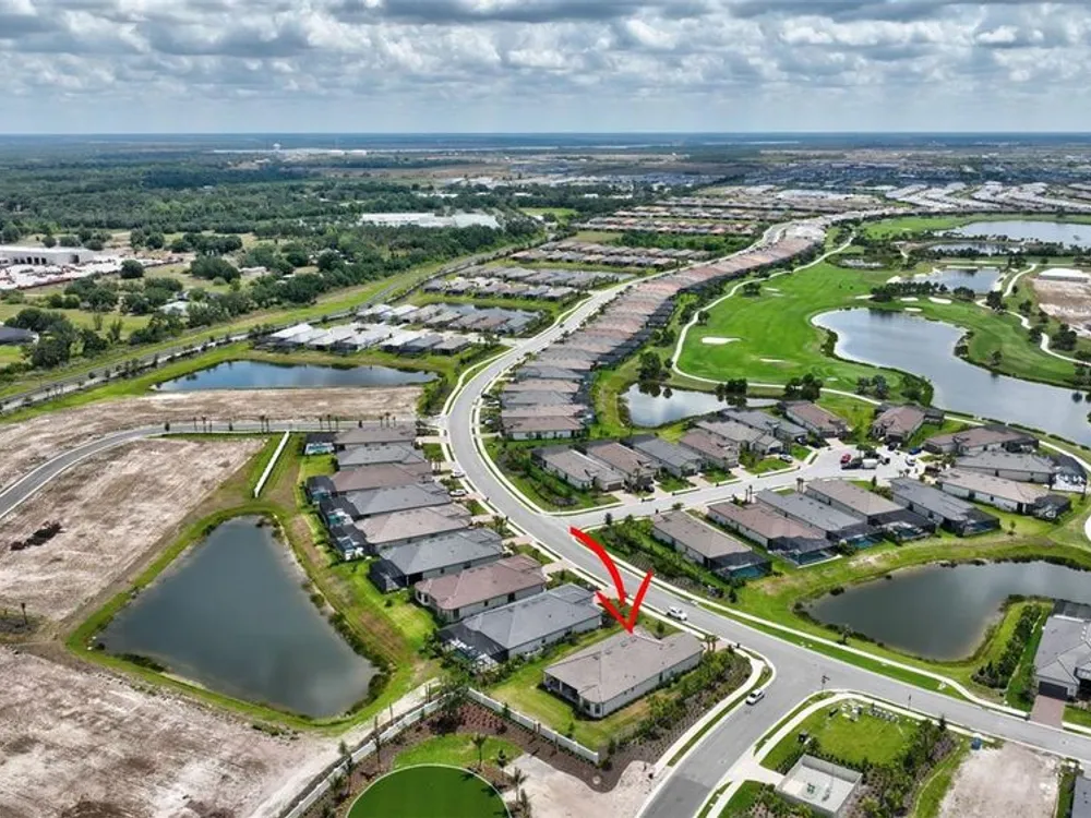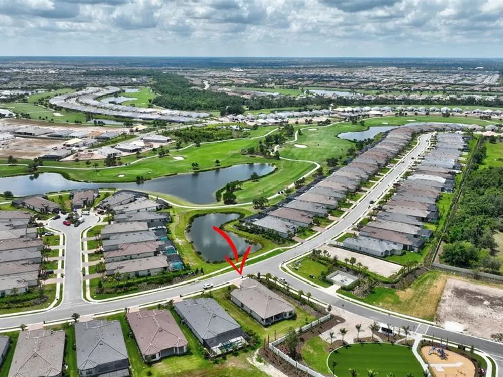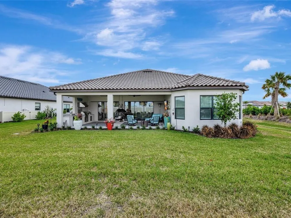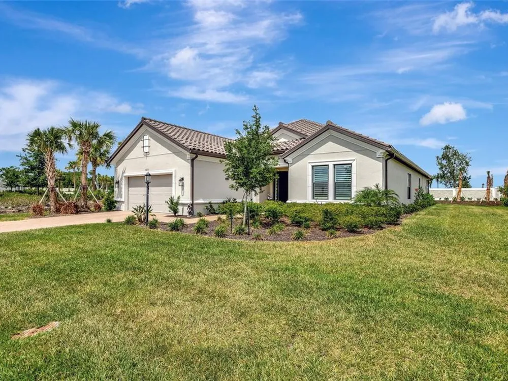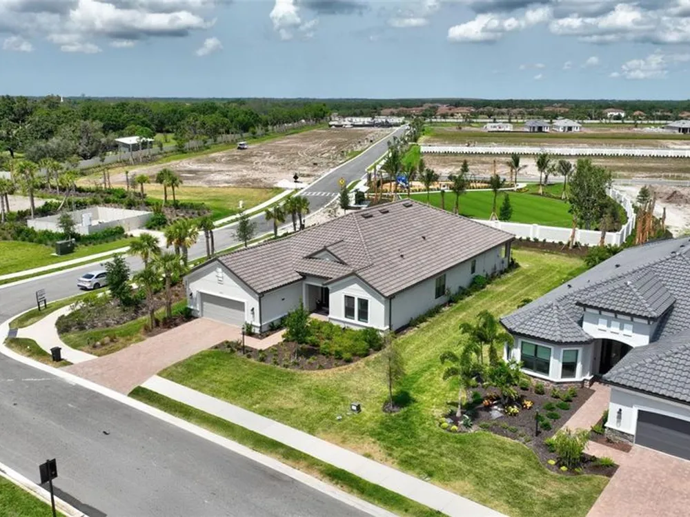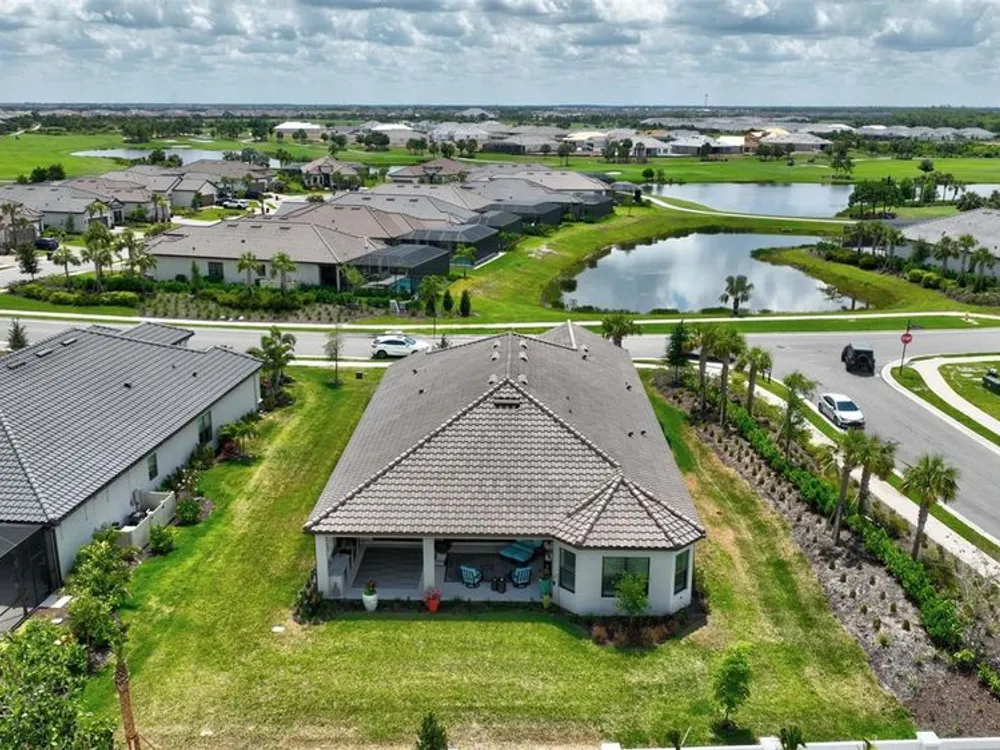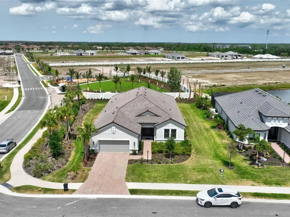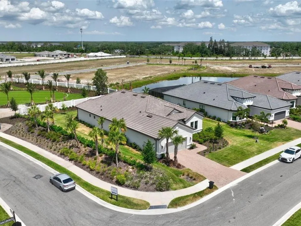 Built in June 2024, this is a rare opportunity, as there are no more non-golf lots available to build a Pallazio model in Esplanade at Azario. ANNUAL GOLF PASSES ARE AVAILABLE (CONTACT THE PRO SHOP FOR MORE INFORMATION AND FEE) The pool is the only virtually staged photo. This beautifully upgraded Pallazio model is situated on a premium corner lot with a water view in the front, a tranquil lanai view, and an easement between you and your only neighbor. 3,084 square feet. Offering 3 large bedrooms, 3 full bathrooms, an office, and a tandem 3-car garage, this home was thoughtfully designed for both luxury and comfort. Light gray wood plank tile runs throughout the living spaces, complemented by 8-foot doors and plantation shutters. The open concept living area features a tray ceiling, two sets of sliders, and a striking feature wall in the great room with lighted shelves, a sculptured three-sided fireplace, and a floating porcelain hearth. The extended gourmet kitchen boasts upgraded white shaker cabinetry with soft close doors/drawers, slide outs, a light gray oversized island, striking premium quartz countertops, custom organized pantry shelving, and GE Gourmet kitchen appliances. A private office/den with custom built-ins and double pocket doors offers a functional and quiet workspace. The oversized primary suite includes a cozy bay window sitting area, a custom walk-in closet with built-in shelving and drawers, gliding shoe rack and a luxurious spa-like bathroom with a large walk-in shower. Two additional spacious bedrooms each have their own full bathrooms for guests' comfort. Step outside to the extended lanai, designed for entertaining, featuring an extended outdoor kitchen with a Delta Heat gas grill, separate griddle, refrigerator, sink, and built-in storage. There is plenty of space to design your dream pool and spa, with pre-wiring already in place. Pool photos have been virtually staged. Additional highlights include a three-car tandem garage with epoxy flooring, motorized overhead storage, and a tankless water heater. Located in the highly desirable Esplanade at Azario, residents enjoy access to resort-style amenities including 2 pools, Bahama Bar, Culinary Center, golf course, fitness center, spa, dog park, pickle ball, tennis, bocce ball, community garden and more. This is a non-golf deeded house, so you don’t have the added expense of owning a golf lot but all the opportunity to golf! (Golf fees currently $50 per round, HOA fees are $280.00 less per month than owning a golf deeded house. This home is move-in ready waiting for you to enjoy the luxurious Florida lifestyle! Seller is flexible on closing date. Pool photos are the only photos virtually staged.