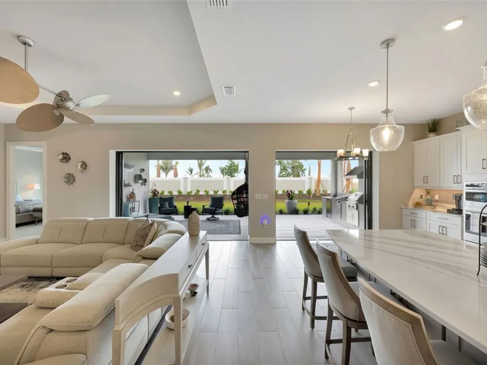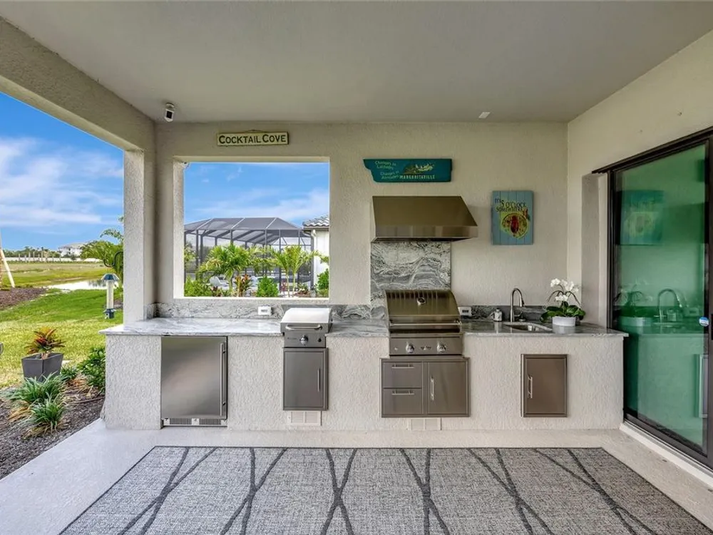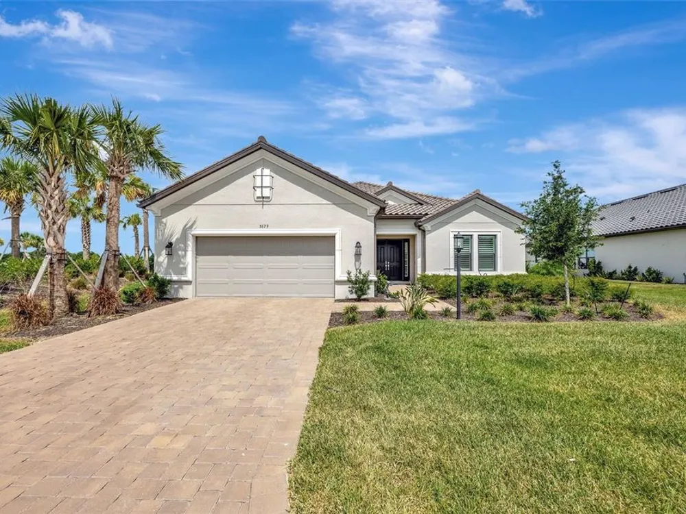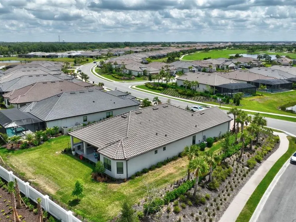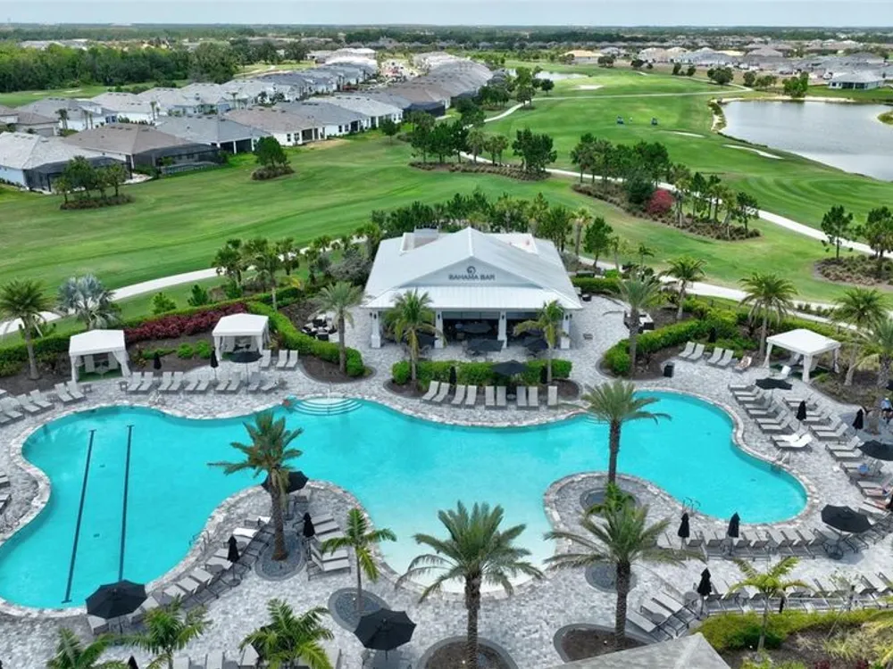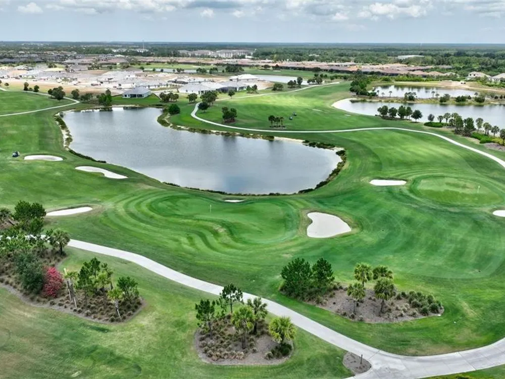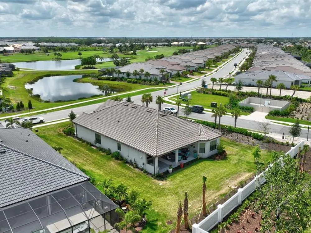 Built in June 2024, this is a rare opportunity, as there are no more non-golf lots available to build a Pallazio model in Esplanade at Azario. ANNUAL GOLF PASSES ARE AVAILABLE (CONTACT THE PRO SHOP FOR MORE INFORMATION AND FEE) The pool is the only virtually staged photo. This beautifully upgraded Pallazio model is situated on a premium corner lot with a water view in the front, a tranquil lanai view, and an easement between you and your only neighbor. 3,084 square feet. Offering 3 large bedrooms, 3 full bathrooms, an office, and a tandem 3-car garage, this home was thoughtfully designed for both luxury and comfort. Light gray wood plank tile runs throughout the living spaces, complemented by 8-foot doors and plantation shutters. The open concept living area features a tray ceiling, two sets of sliders, and a striking feature wall in the great room with lighted shelves, a sculptured three-sided fireplace, and a floating porcelain hearth. The extended gourmet kitchen boasts upgraded white shaker cabinetry with soft close doors/drawers, slide outs, a light gray oversized island, striking premium quartz countertops, custom organized pantry shelving, and GE Gourmet kitchen appliances. A private office/den with custom built-ins and double pocket doors offers a functional and quiet workspace. The oversized primary suite includes a cozy bay window sitting area, a custom walk-in closet with built-in shelving and drawers, gliding shoe rack and a luxurious spa-like bathroom with a large walk-in shower. Two additional spacious bedrooms each have their own full bathrooms for guests' comfort. Step outside to the extended lanai, designed for entertaining, featuring an extended outdoor kitchen with a Delta Heat gas grill, separate griddle, refrigerator, sink, and built-in storage. There is plenty of space to design your dream pool and spa, with pre-wiring already in place. Pool photos have been virtually staged. Additional highlights include a three-car tandem garage with epoxy flooring, motorized overhead storage, and a tankless water heater. Located in the highly desirable Esplanade at Azario, residents enjoy access to resort-style amenities including 2 pools, Bahama Bar, Culinary Center, golf course, fitness center, spa, dog park, pickle ball, tennis, bocce ball, community garden and more. This is a non-golf deeded house, so you don’t have the added expense of owning a golf lot but all the opportunity to golf! (Golf fees currently $50 per round, HOA fees are $280.00 less per month than owning a golf deeded house. This home is move-in ready waiting for you to enjoy the luxurious Florida lifestyle! Seller is flexible on closing date. Pool photos are the only photos virtually staged.