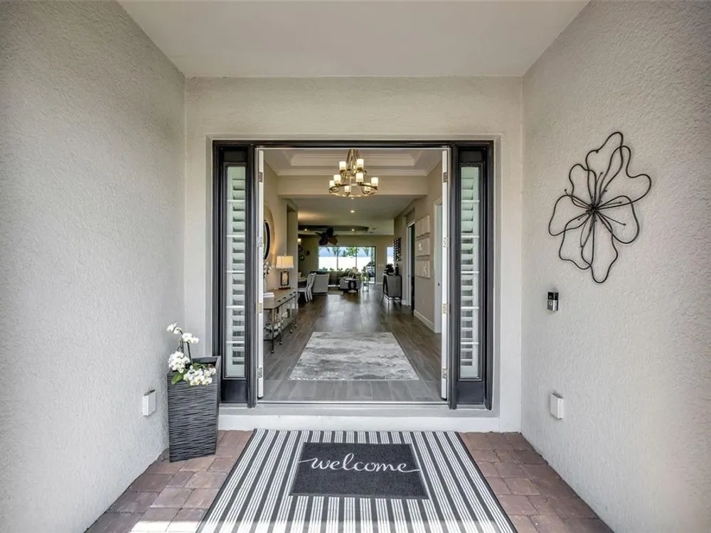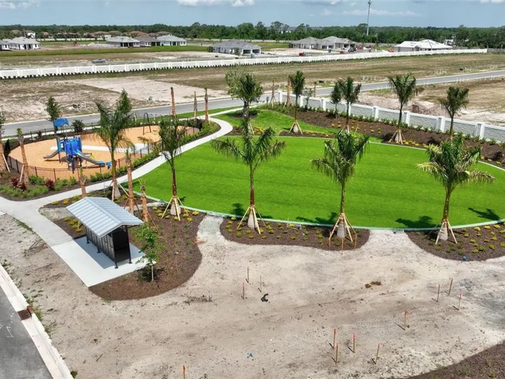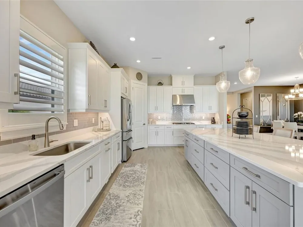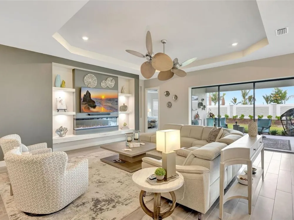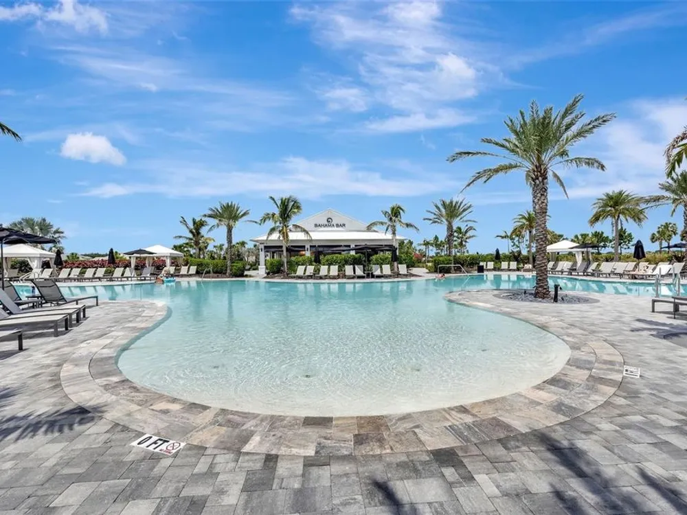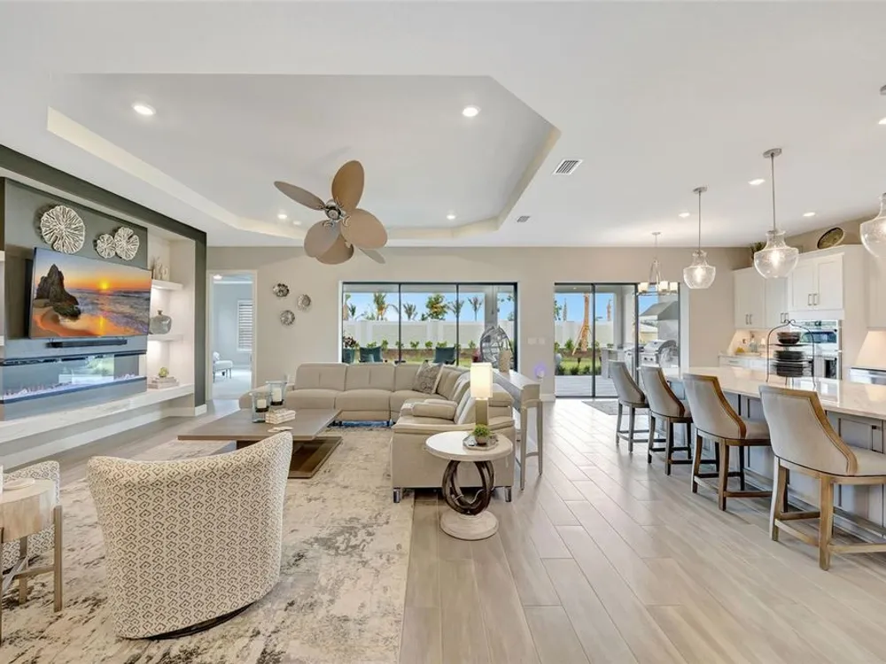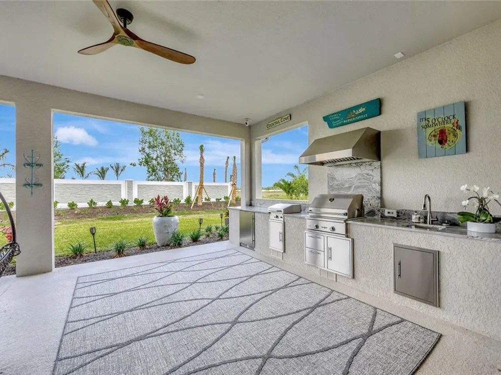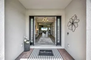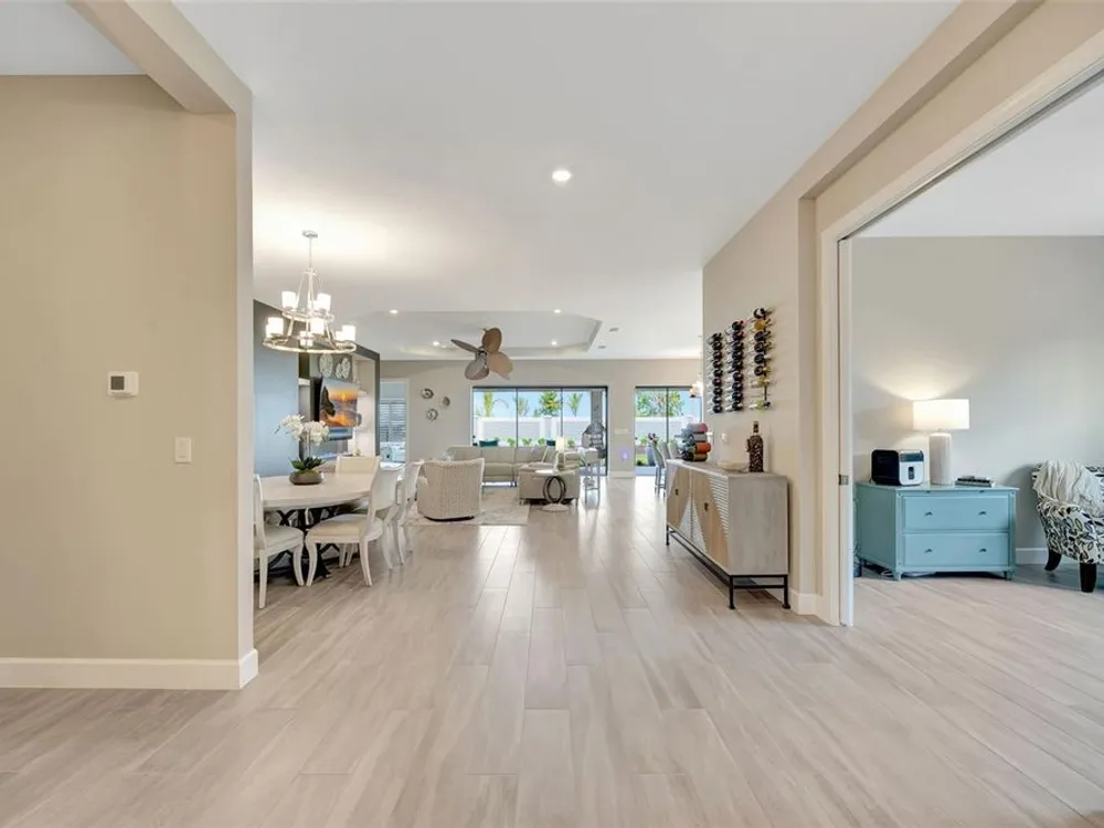 Built in June 2024, this is a rare opportunity, as there are no more non-golf lots available to build a Pallazio model in Esplanade at Azario. ANNUAL GOLF PASSES ARE AVAILABLE (CONTACT THE PRO SHOP FOR MORE INFORMATION AND FEE) The pool is the only virtually staged photo. This beautifully upgraded Pallazio model is situated on a premium corner lot with a water view in the front, a tranquil lanai view, and an easement between you and your only neighbor. 3,084 square feet. Offering 3 large bedrooms, 3 full bathrooms, an office, and a tandem 3-car garage, this home was thoughtfully designed for both luxury and comfort. Light gray wood plank tile runs throughout the living spaces, complemented by 8-foot doors and plantation shutters. The open concept living area features a tray ceiling, two sets of sliders, and a striking feature wall in the great room with lighted shelves, a sculptured three-sided fireplace, and a floating porcelain hearth. The extended gourmet kitchen boasts upgraded white shaker cabinetry with soft close doors/drawers, slide outs, a light gray oversized island, striking premium quartz countertops, custom organized pantry shelving, and GE Gourmet kitchen appliances. A private office/den with custom built-ins and double pocket doors offers a functional and quiet workspace. The oversized primary suite includes a cozy bay window sitting area, a custom walk-in closet with built-in shelving and drawers, gliding shoe rack and a luxurious spa-like bathroom with a large walk-in shower. Two additional spacious bedrooms each have their own full bathrooms for guests' comfort. Step outside to the extended lanai, designed for entertaining, featuring an extended outdoor kitchen with a Delta Heat gas grill, separate griddle, refrigerator, sink, and built-in storage. There is plenty of space to design your dream pool and spa, with pre-wiring already in place. Pool photos have been virtually staged. Additional highlights include a three-car tandem garage with epoxy flooring, motorized overhead storage, and a tankless water heater. Located in the highly desirable Esplanade at Azario, residents enjoy access to resort-style amenities including 2 pools, Bahama Bar, Culinary Center, golf course, fitness center, spa, dog park, pickle ball, tennis, bocce ball, community garden and more. This is a non-golf deeded house, so you don’t have the added expense of owning a golf lot but all the opportunity to golf! (Golf fees currently $50 per round, HOA fees are $280.00 less per month than owning a golf deeded house. This home is move-in ready waiting for you to enjoy the luxurious Florida lifestyle! Seller is flexible on closing date. Pool photos are the only photos virtually staged.