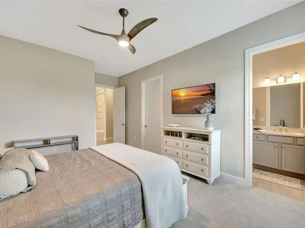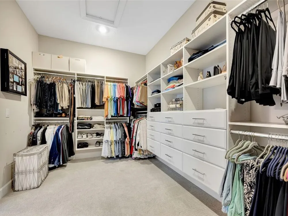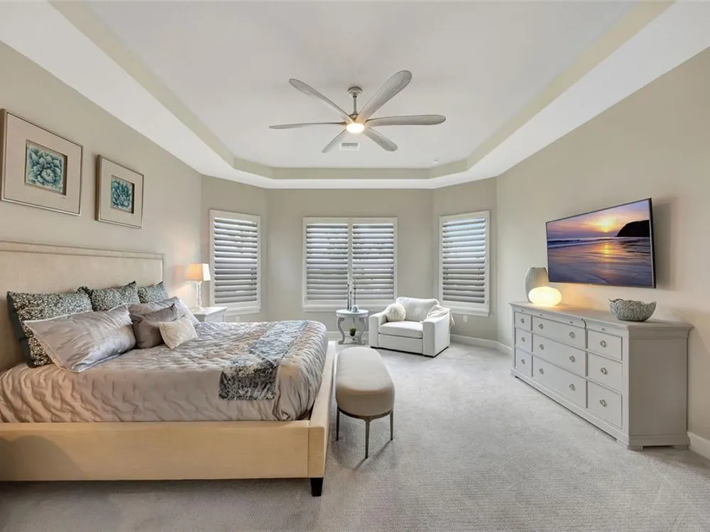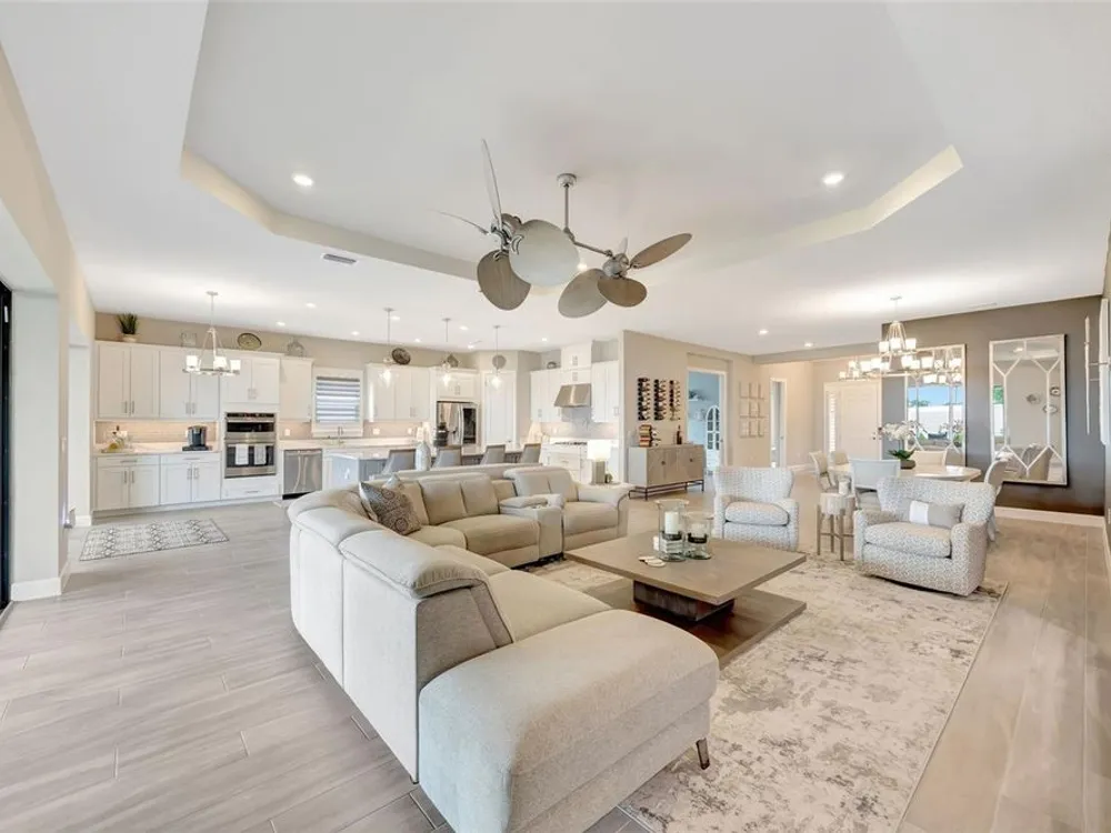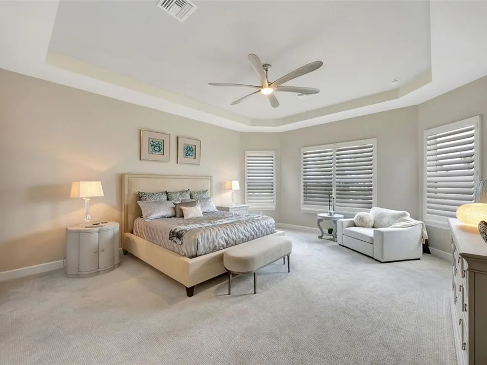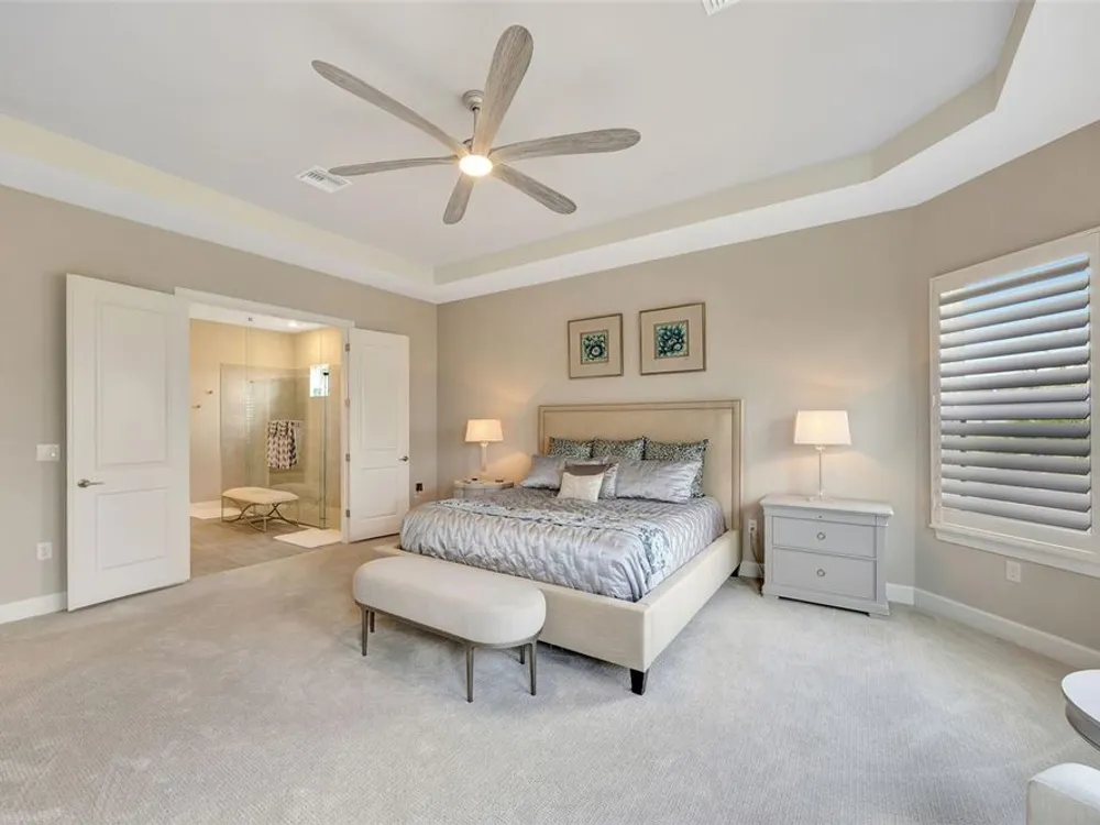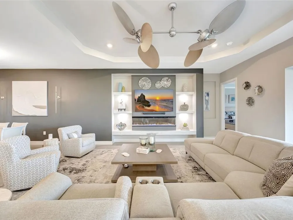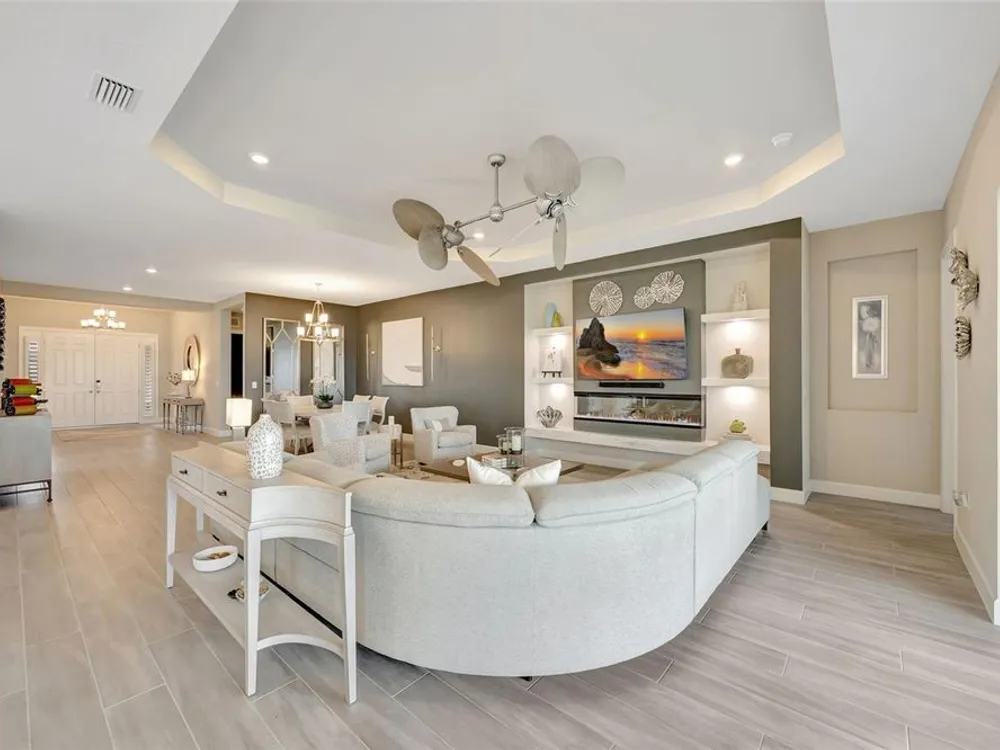 - Built-in Features, Ceiling Fan(s), Crown Molding, Eat-in Kitchen, Kitchen/Family Room Combo, Living/Dining Room, Open Floorplan, Main Level Primary, Solid Surface Counters, Tray Ceiling(s)