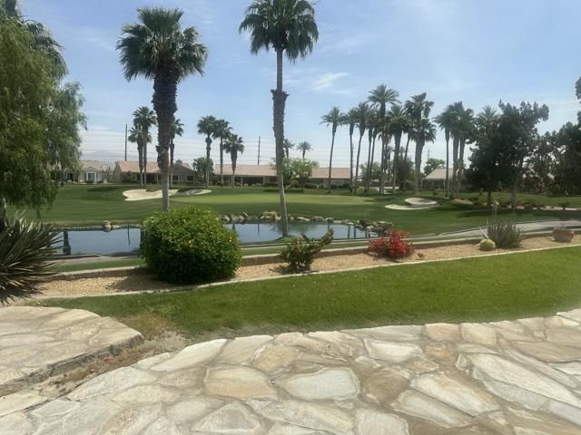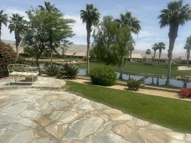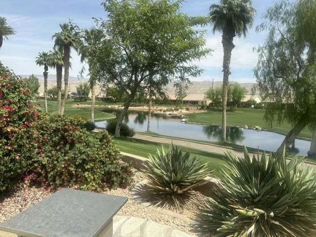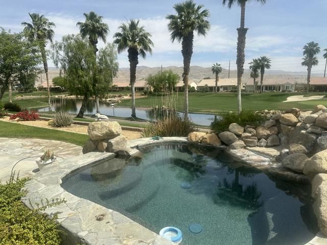 Sun City Palm Desert. OUTSTANDING GREAT ROOM PORTOFINO (2907 square feet)with the MOST INCREDIBLE VIEWS ...This beautiful home is next to the 17th green of the San Gorgonio golf course, on an elevated lot with views of a large lake front , fairway, and putting green with a lovely eastern exposure. To add to this wonderful experience , it offers an inviting in ground salt water pebble tec spa. The 25' long stainless BBQ ISLAND for entertaining is an added bonus to the patio. An automatic awning is also provided so you can sit in the shade to enjoy the spectacular views! This fabulous elevated lot is enhanced with a flagstone trimmed patio! The front entry has great curb appeal with beautiful landscaping, flagstone trimmed concrete, and gorgeous glass enhanced double doors!When entering the great room floor plan, you are greeted with walls of glass showcasing the spectacular views! The beautiful 18' tile flooring laid tastefully on the diagonal, is throughout the entire living space. The great room is very spacious with fireplace and plenty of recessed lighting with additional speakers in the ceiling. The kitchen has been remodeled with new Kenmore Elite stainless steel appliances with a 5 burner gas range, and a stainless steel french door refrigerator The conveniently located island has gorgeous quartz counters with contrasting cabinetry tones, and bead board molding . You will LOVE the all glass corner window at your kitchen sink to enjoy the incredible views. All three bedrooms are 'en suites' suites with an additional powder room for your guests ! The primary bedroom has been extended with french doors leading to the patio, and includes tasteful shutters and built in speakers . The primary bath has been updated with above the counter glass sink bowls and matching spouts on lovely matching spouts on lovely granite countertops. The primary shower offers a misting system with both music and steam and there is also a relaxing tub with jets to enjoy.The primary's retreat has shutters and a french door to the courtyard. The laundry room offers a beautiful red Kenmore Elite front load washer/dryer. The garage is extended with two car spaces and a golf cart garage with cabinets and. plenty of storage.This home has EVERYTHING on your wishlist and all in the premier award winning 55+ community Sun City Palm Desert.