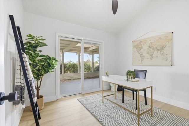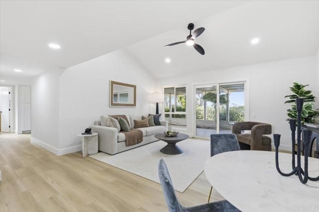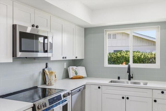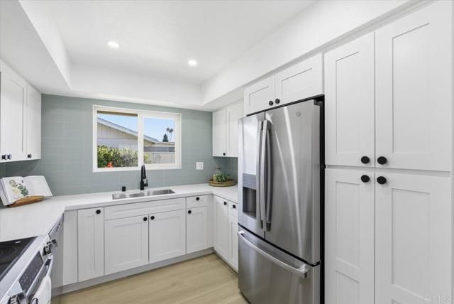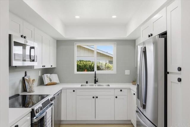 Experience coastal living in this beautifully fully remodeled one story 3 bedroom, 2 bathroom Oceana home in the heart of Oceanside's sought-after 55+ community. Every detail has been upgraded to create a light, modern, and inviting space perfect for relaxed North County living. The kitchen shines with white shaker cabinets, soft blue backsplash tile, quartz countertops, modern black cabinet pulls, built-in pantry area and stainless steel appliances. Clean lines, new fixtures, and an abundance of natural light make this kitchen feel fresh and coastal. The bathrooms were thoughtfully redesigned. Primary suite featuring designer green vertical tile, a frameless sliding glass shower door, matte black fixtures, and a warm wood vanity. The entire home features light wood style LVP flooring, new doors and door paint. A brand new roof and replaced vinyl windows and doors throughout give peace of mind. Enjoy ocean breezes and ocean views from your living spaces and secondary bedrooms along with a spacious private patio perfect for morning coffee or evening relaxation. The home includes a detached one car garage and in home laundry hookups, giving you convenience and privacy. Oceana is known for its incredible amenities and vibrant lifestyle. The community offers multiple pools, spas, clu