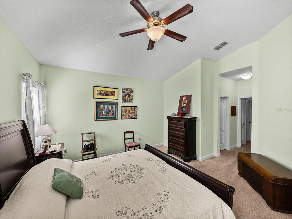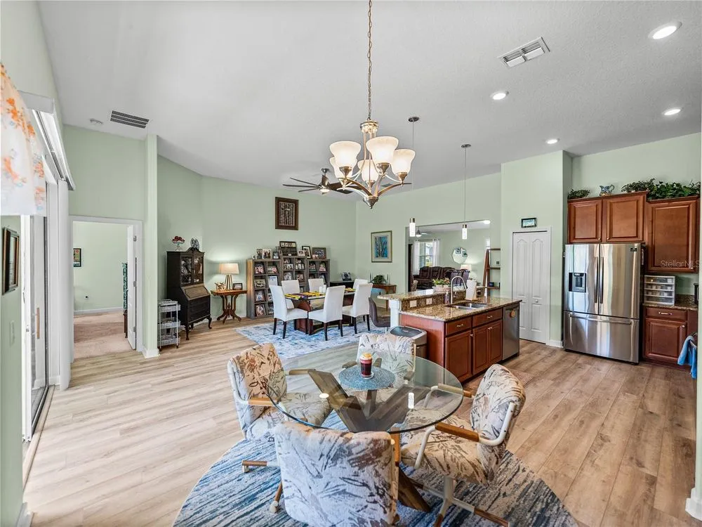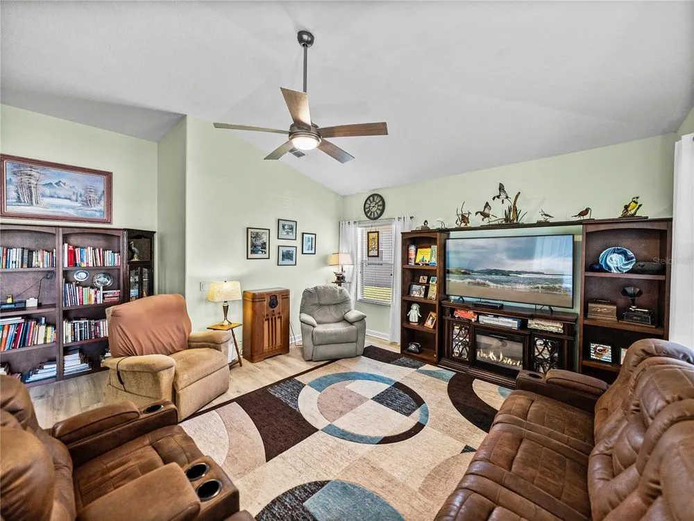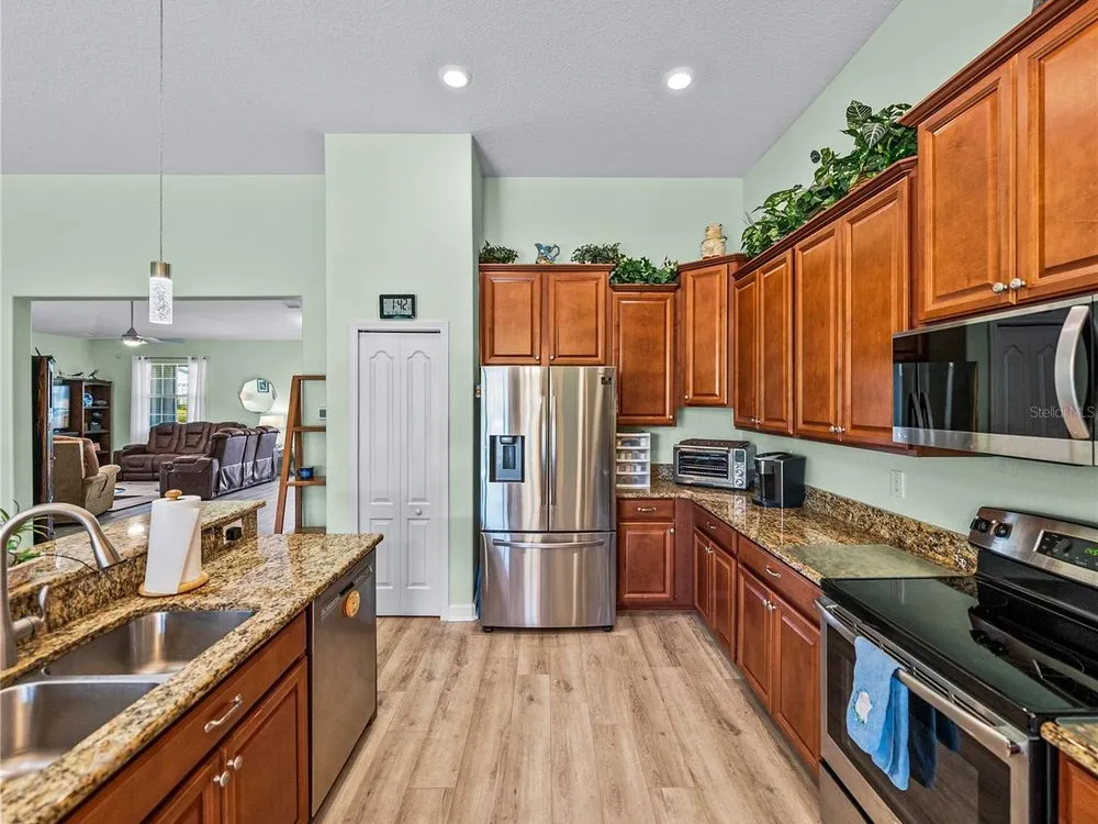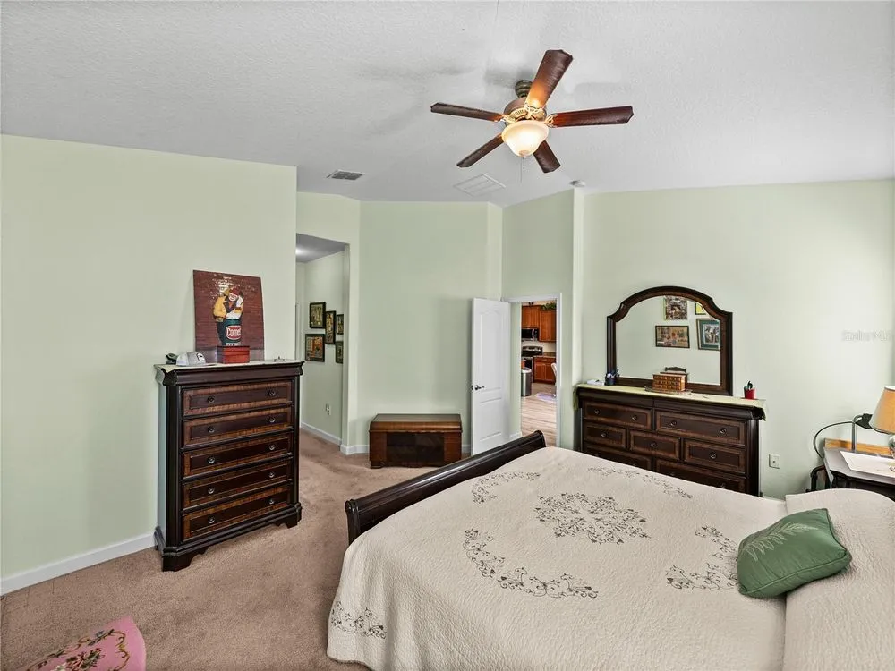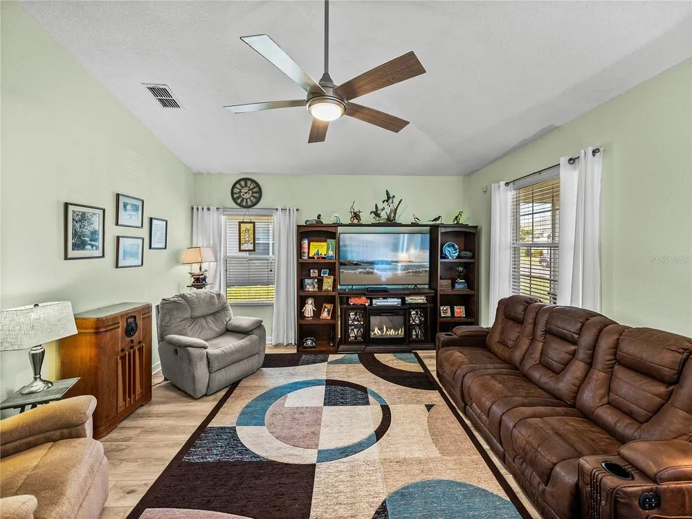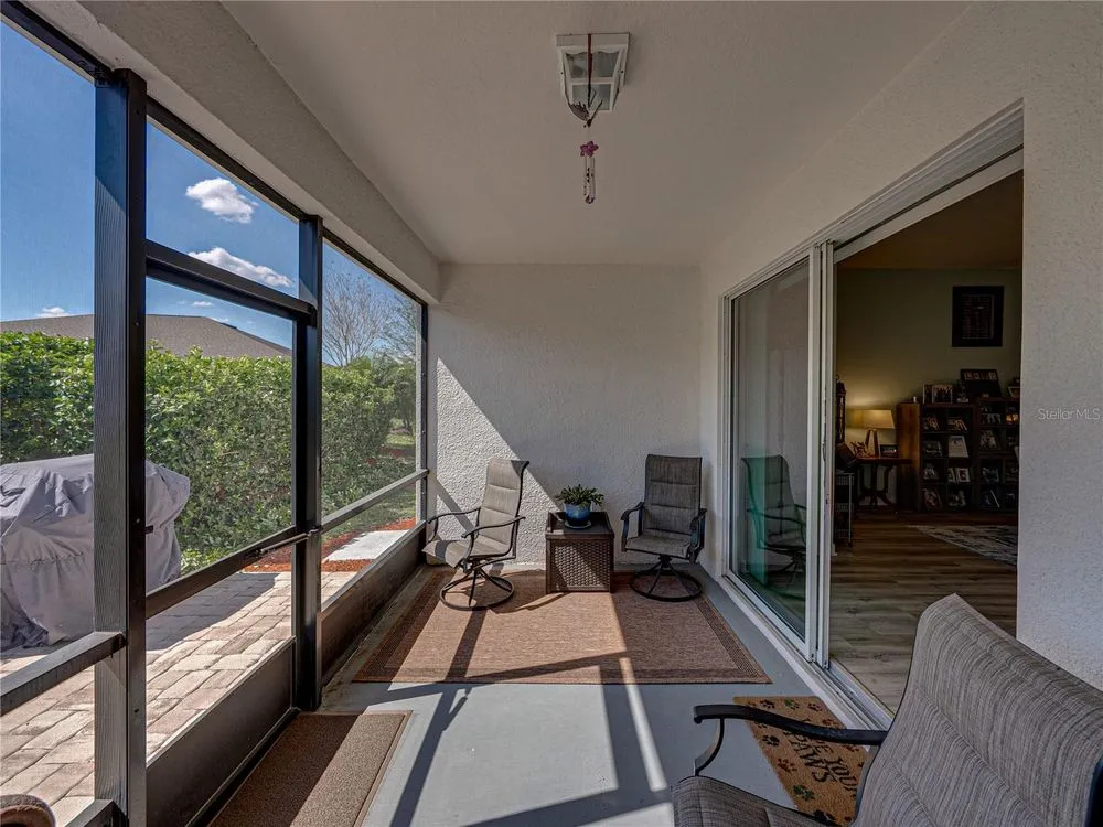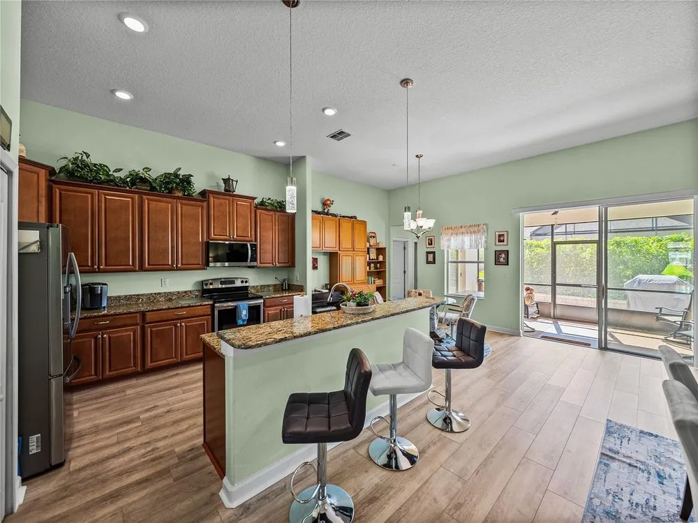 This beautifully updated 4-bedroom, 3-bath residence offers a spacious and thoughtfully designed layout with 2,404 sq ft of comfortable living space. Set in the desirable Traditions 55+ active adult community, the home’s curb appeal is undeniable — featuring a tasteful elevation, accent paint, full front screened porch, and meticulous landscaping. A new roof installed in 2023 comes with a transferable warranty (see attached documents), offering peace of mind for years to come. The three-car garage includes both a double door and a single door, the latter with a manually operated screen and walk-through door. The double garage door is equipped with an electric screen, enhancing ventilation while maintaining privacy. Inside, the split floor plan provides privacy, with the spacious primary suite on one side and guest rooms on the other. Soaring cathedral ceilings, luxury waterproof vinyl plank flooring, and a soft, neutral color palette create a warm and inviting atmosphere from the moment you enter. The kitchen boasts granite countertops and updated stainless steel appliances, ideal for the home chef. Custom ceiling fans throughout the home enhance both style and comfort. Additional features include a whole-house water softener and a large walk-in shower in the primary bath. One of the guest baths has been upgraded with a Safeway walk-in tub and shower — a valuable convenience. Step outside to a tranquil screened veranda with a water fountain and tall privacy hedge — perfect for relaxing or entertaining. A paver patio just beyond the veranda offers even more outdoor enjoyment. In addition to the kitchen appliances and washer & dryer, the golf cart and the garage refrigerator are included with the sale. Living in Traditions means enjoying access to a stunning clubhouse, resort-style outdoor pool, and an active community lifestyle. The HOA covers lawn care, exterior house painting, cable TV, internet, and community amenities. For full HOA details, contact the office located in the clubhouse. Don’t miss the chance to own this gorgeous, move-in-ready home. Schedule your private showing today!