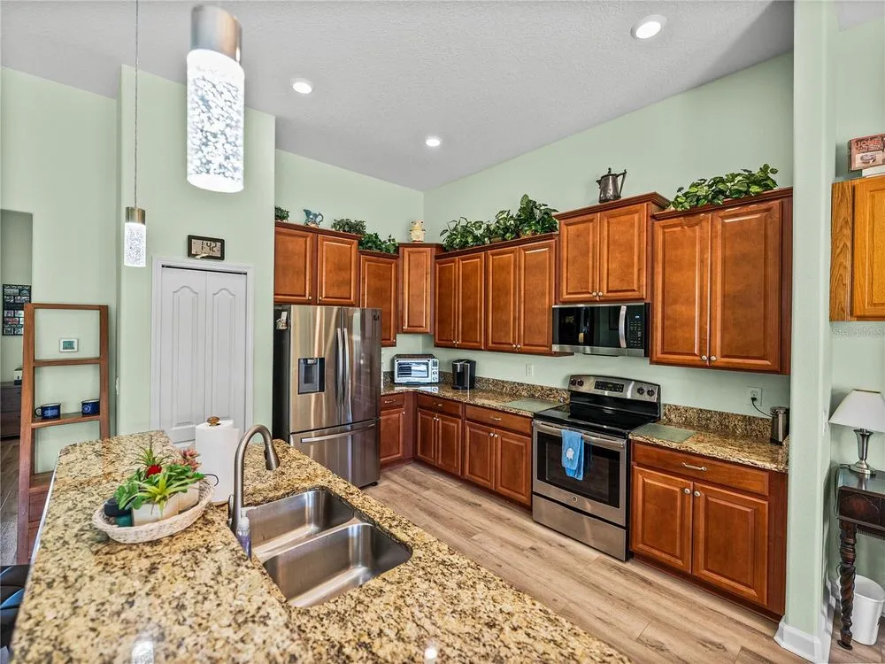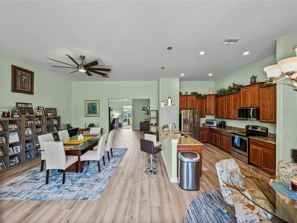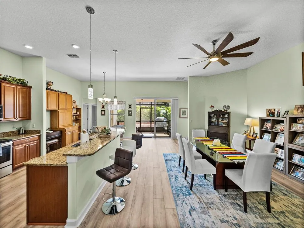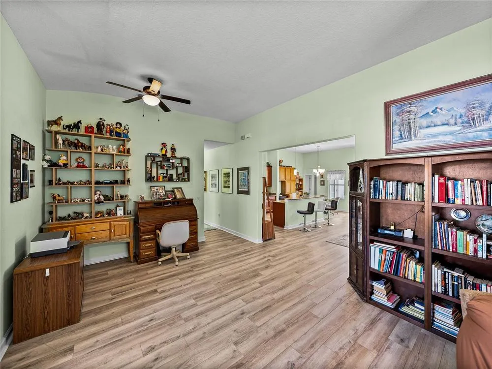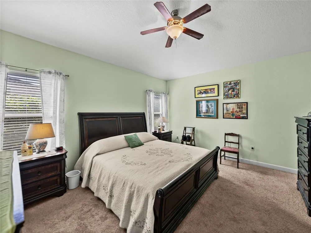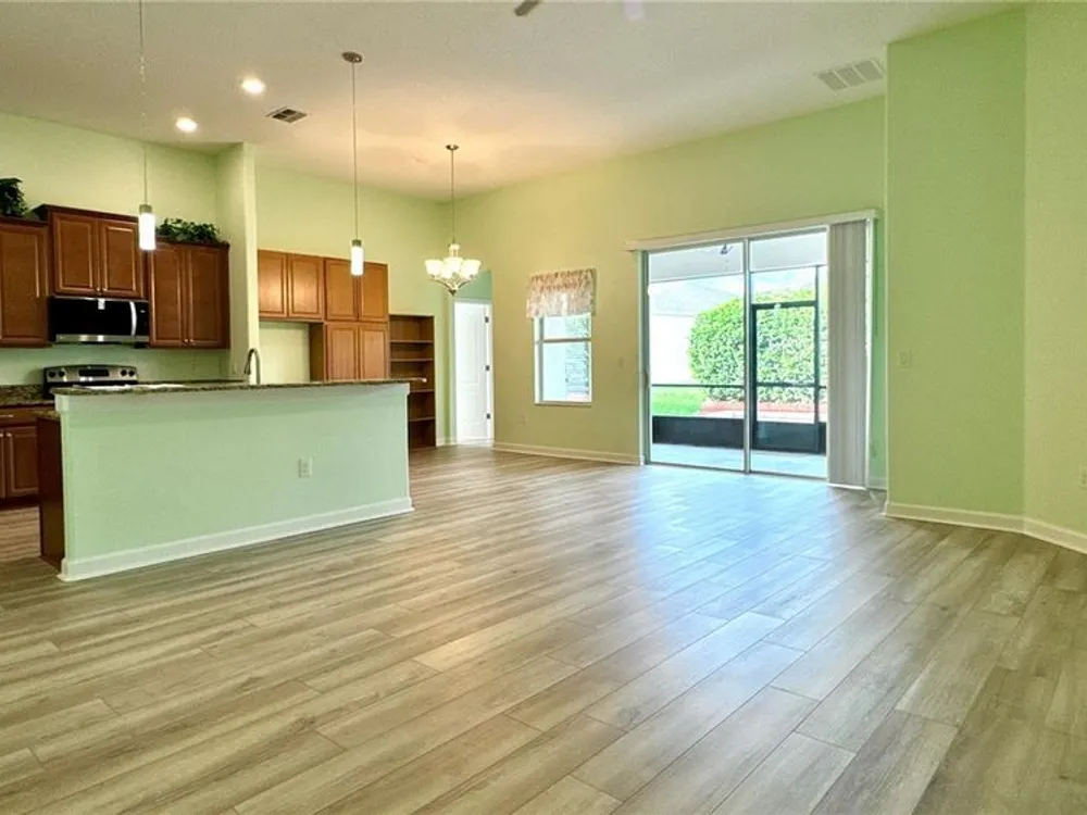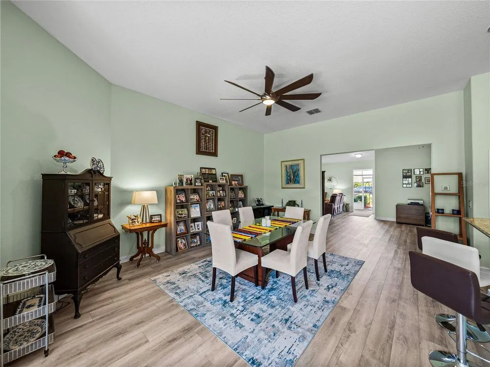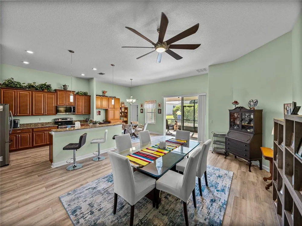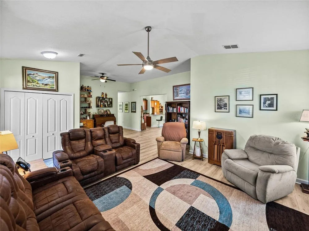 This beautifully updated 4-bedroom, 3-bath residence offers a spacious and thoughtfully designed layout with 2,404 sq ft of comfortable living space. Set in the desirable Traditions 55+ active adult community, the home’s curb appeal is undeniable — featuring a tasteful elevation, accent paint, full front screened porch, and meticulous landscaping. A new roof installed in 2023 comes with a transferable warranty (see attached documents), offering peace of mind for years to come. The three-car garage includes both a double door and a single door, the latter with a manually operated screen and walk-through door. The double garage door is equipped with an electric screen, enhancing ventilation while maintaining privacy. Inside, the split floor plan provides privacy, with the spacious primary suite on one side and guest rooms on the other. Soaring cathedral ceilings, luxury waterproof vinyl plank flooring, and a soft, neutral color palette create a warm and inviting atmosphere from the moment you enter. The kitchen boasts granite countertops and updated stainless steel appliances, ideal for the home chef. Custom ceiling fans throughout the home enhance both style and comfort. Additional features include a whole-house water softener and a large walk-in shower in the primary bath. One of the guest baths has been upgraded with a Safeway walk-in tub and shower — a valuable convenience. Step outside to a tranquil screened veranda with a water fountain and tall privacy hedge — perfect for relaxing or entertaining. A paver patio just beyond the veranda offers even more outdoor enjoyment. In addition to the kitchen appliances and washer & dryer, the golf cart and the garage refrigerator are included with the sale. Living in Traditions means enjoying access to a stunning clubhouse, resort-style outdoor pool, and an active community lifestyle. The HOA covers lawn care, exterior house painting, cable TV, internet, and community amenities. For full HOA details, contact the office located in the clubhouse. Don’t miss the chance to own this gorgeous, move-in-ready home. Schedule your private showing today!