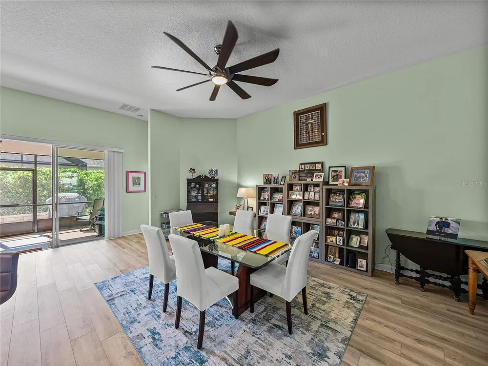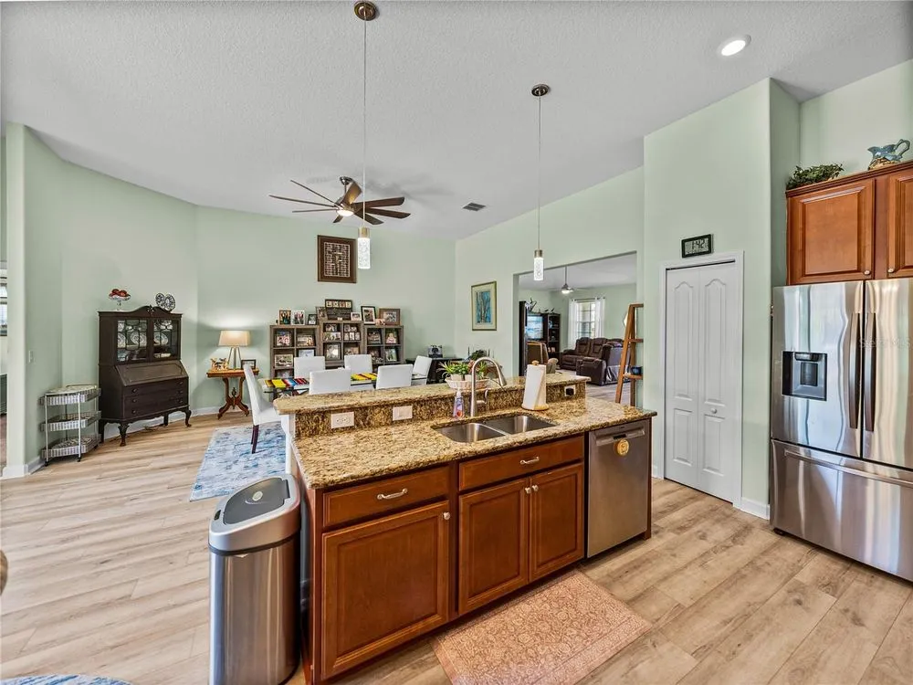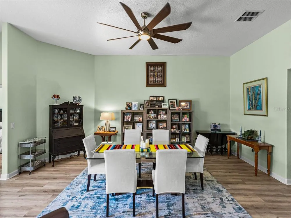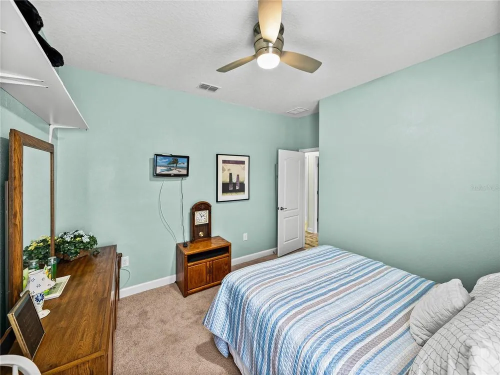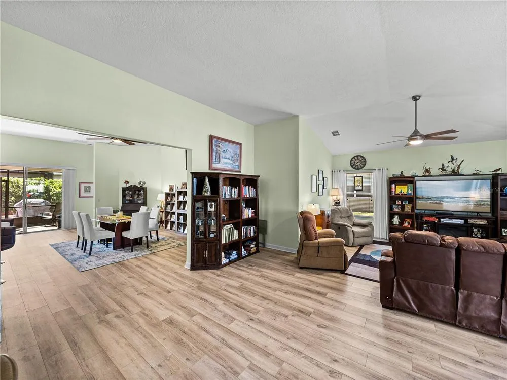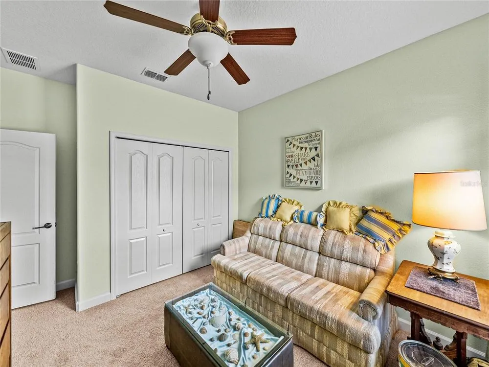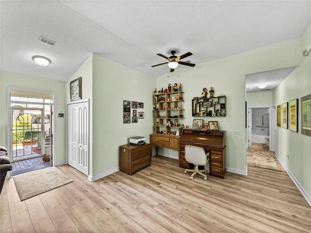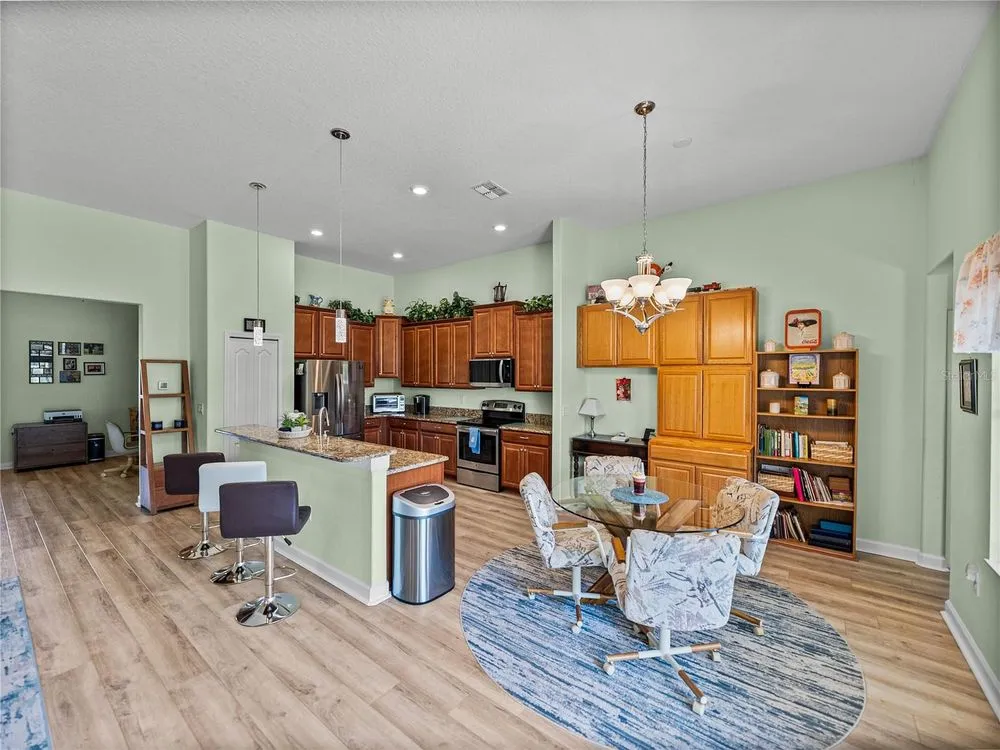 This beautifully updated 4-bedroom, 3-bath residence offers a spacious and thoughtfully designed layout with 2,404 sq ft of comfortable living space. Set in the desirable Traditions 55+ active adult community, the home’s curb appeal is undeniable — featuring a tasteful elevation, accent paint, full front screened porch, and meticulous landscaping. A new roof installed in 2023 comes with a transferable warranty (see attached documents), offering peace of mind for years to come. The three-car garage includes both a double door and a single door, the latter with a manually operated screen and walk-through door. The double garage door is equipped with an electric screen, enhancing ventilation while maintaining privacy. Inside, the split floor plan provides privacy, with the spacious primary suite on one side and guest rooms on the other. Soaring cathedral ceilings, luxury waterproof vinyl plank flooring, and a soft, neutral color palette create a warm and inviting atmosphere from the moment you enter. The kitchen boasts granite countertops and updated stainless steel appliances, ideal for the home chef. Custom ceiling fans throughout the home enhance both style and comfort. Additional features include a whole-house water softener and a large walk-in shower in the primary bath. One of the guest baths has been upgraded with a Safeway walk-in tub and shower — a valuable convenience. Step outside to a tranquil screened veranda with a water fountain and tall privacy hedge — perfect for relaxing or entertaining. A paver patio just beyond the veranda offers even more outdoor enjoyment. In addition to the kitchen appliances and washer & dryer, the golf cart and the garage refrigerator are included with the sale. Living in Traditions means enjoying access to a stunning clubhouse, resort-style outdoor pool, and an active community lifestyle. The HOA covers lawn care, exterior house painting, cable TV, internet, and community amenities. For full HOA details, contact the office located in the clubhouse. Don’t miss the chance to own this gorgeous, move-in-ready home. Schedule your private showing today!