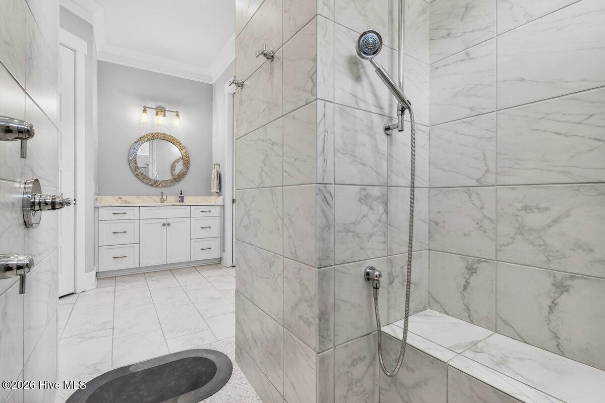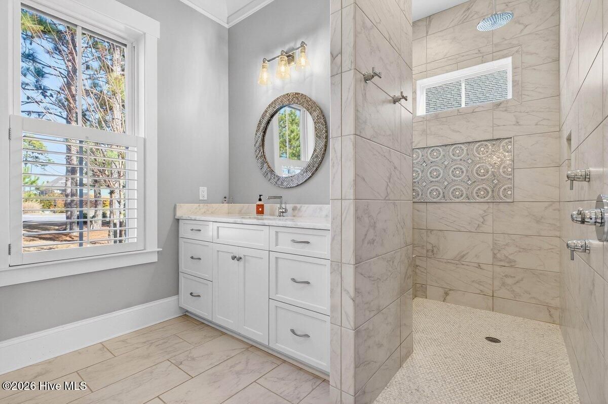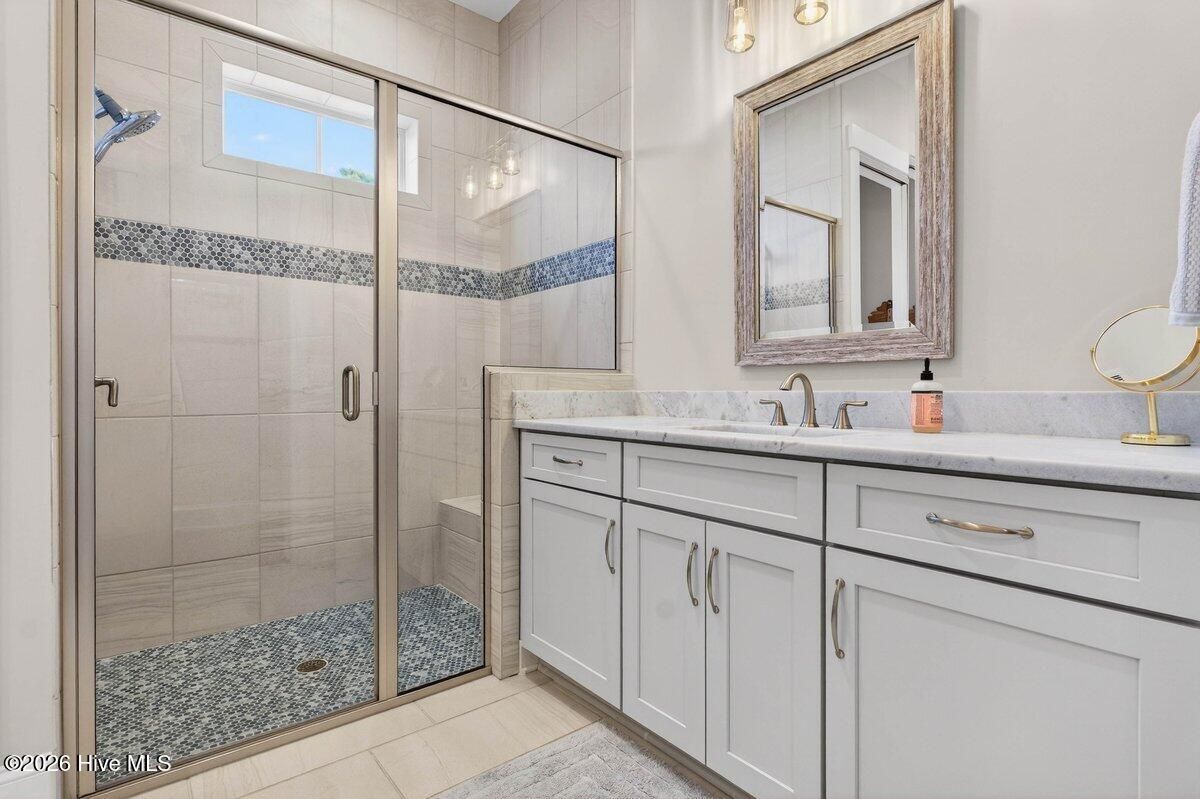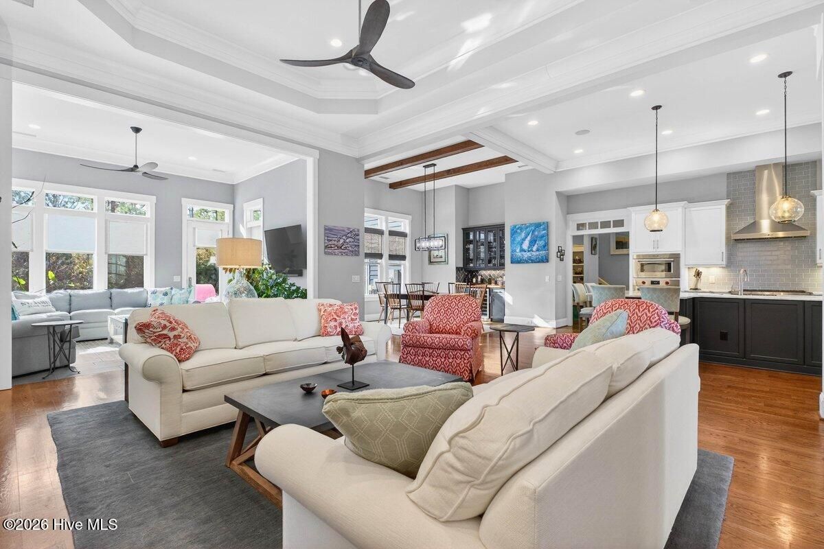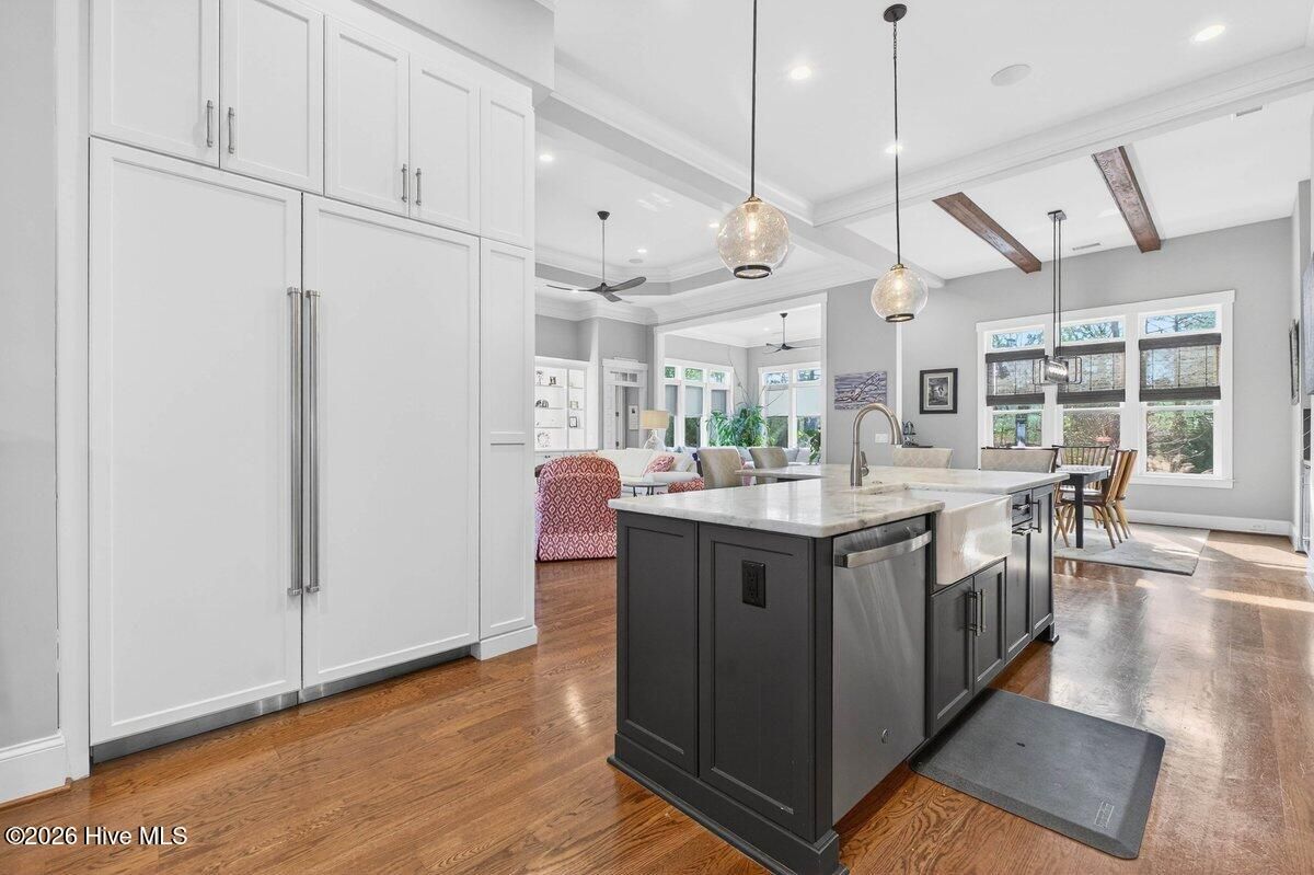 - Sound System, Master Downstairs, Walk-In Closet(s), Tray Ceiling(s), High Ceilings, Entrance Foyer, Bookcases, Kitchen Island, Ceiling Fan(s), Pantry, Walk-In Shower, Blinds