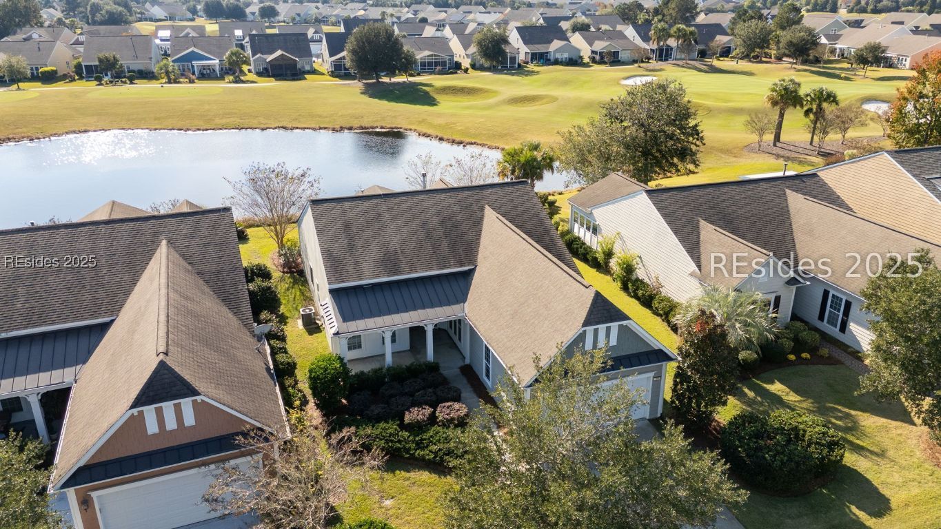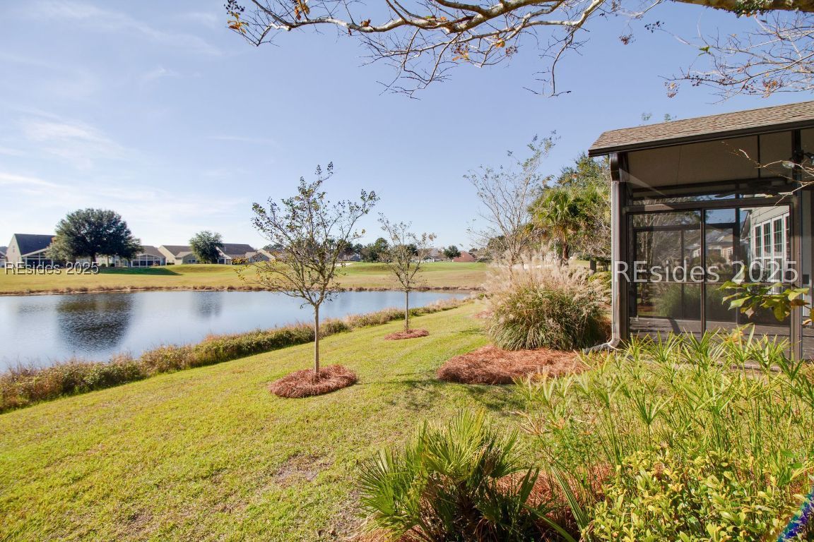 Welcome home to this beautiful Surrey Crest model, perfectly positioned in the highly desirable Whispering Oaks neighborhood of Sun City North and offering breathtaking water-to-golf-course views that unfold from the living, Carolina room, den & primary suite. This thoughtfully designed home features two bedrooms, two bathrooms, a dedicated office/den, and a calming Carolina room bathed in natural light. The kitchen is a chef's delight with stainless steel appliances, under-cabinet lighting, granite countertops, an island, and plenty of cabinet storage. In the primary suite you'll appreciate the elegant tray ceiling and custom-shelved walk-in closet. Additional interior enhancements include wood floors throughout the main living areas, built-ins in the office/den, a custom closet in the guest bedroom, a laundry room equipped with extra cabinets and countertop, and generous storage overall. Step outside to relax in the custom three-seasons room with paver flooring or unwind on the covered front porch, all while taking in the exceptional views. Located near the Tidewatch gate and centrally situated within Sun City Hilton Head, this home offers both prestige and convenience in one package. Too many upgrades to list - you simply must see it!