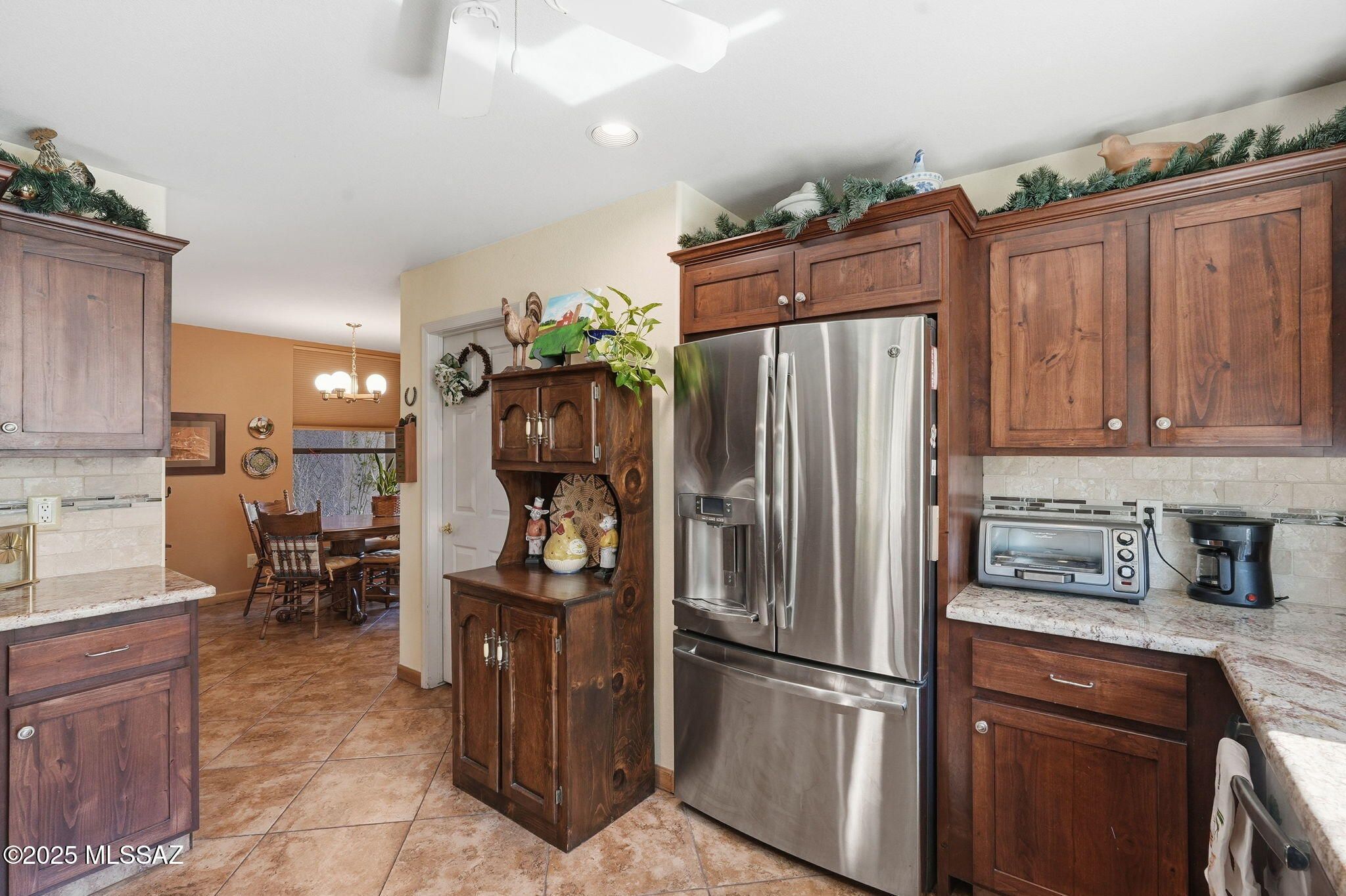 Welcome to this well-appointed Madera model located at the end of a very quiet street on a nicely sized corner lot. Enter through a charming, gated courtyard with flagstone flooring. The kitchen shines with granite countertops, complimentary backsplashes, GE stainless steel appliances & sink, knotty alder cabinets w/hardware, 20'' tile, pendant lighting and features an adjacent sunny breakfast nook w/custom window treatments. Cozy family room includes a beautiful floor to ceiling stacked stone gas fireplace, perfect for the cool winter days! Beverage bar features granite counters, glass shelving and mirror. Spacious living room and adjoining dining area are ideal for entertaining. Primary bedroom offers a peaceful retreat with spa-style bath and generous closet space. Step outside to the