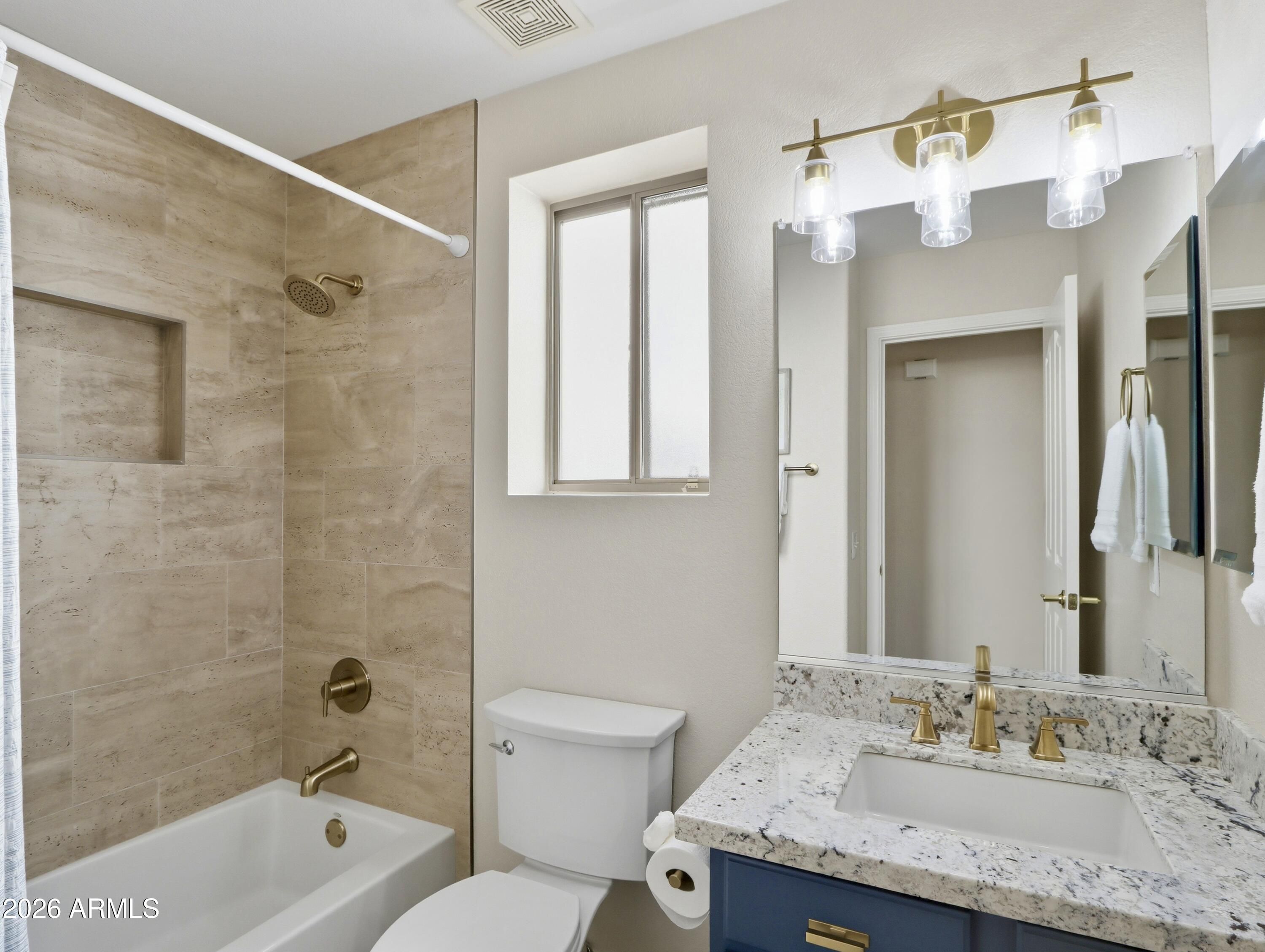 If you've been dreaming of a turn-key PebbleCreek home in a prime location, this may be the one you've been waiting for. Located on the desirable Tuscany side, this home has been completely remodeled within the past two years, this 2-bedroom, 2-bath home with a den looks and feels brand new. It is being sold fully furnished, including kitchenware, linens, and décor—truly move-in ready with nothing to purchase. Recent upgrades include fresh interior and exterior paint, new garage doors, water softener, and water heater. A bright, welcoming interior opens to an open-concept floor plan that has been thoughtfully modernized throughout. Highlights include a new media wall designed for a large TV, new flooring, and updated lighting. The kitchen features quartz countertops, brand-new appliancesincluding a gas range, refrigerator, dishwasher, and microwaveand a tall, movable table that functions as both a prep island and casual seating area. The laundry room is equally updated with a new washer, gas dryer, and freshly painted cabinetry. The spacious primary bedroom overlooks the backyard and features a beautifully remodeled ensuite bath with a double vanity, new sinks, countertops, faucets, lighting, painted cabinets, and a custom tiled walk-in shower. All rooms include new window coverings. The guest bathroom has also been fully remodeled and offers a custom tiled tub/shower enclosure. Outside, enjoy a private, fenced backyard complete with a covered pergola, extended patio, outdoor furniture, and barbecue perfect for relaxing or entertaining. This home is within easy walking distance of the clubhouse, tennis and pickleball courts, fitness center, and pools.