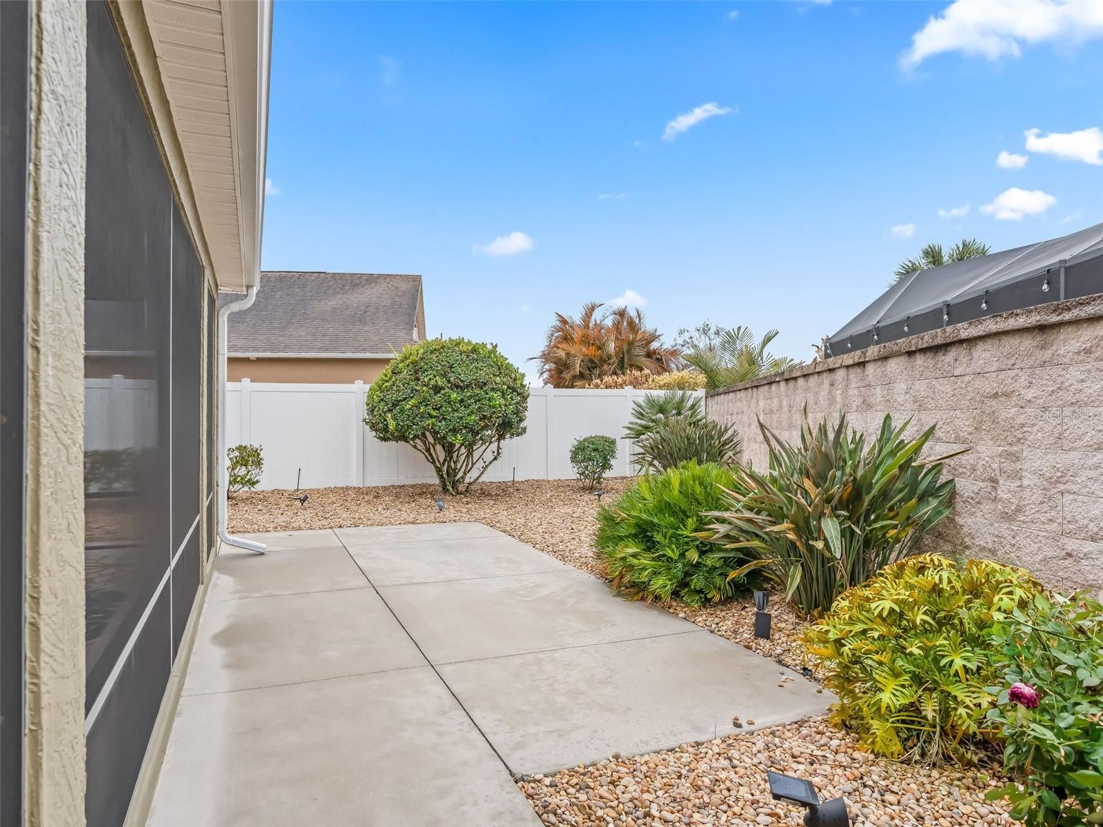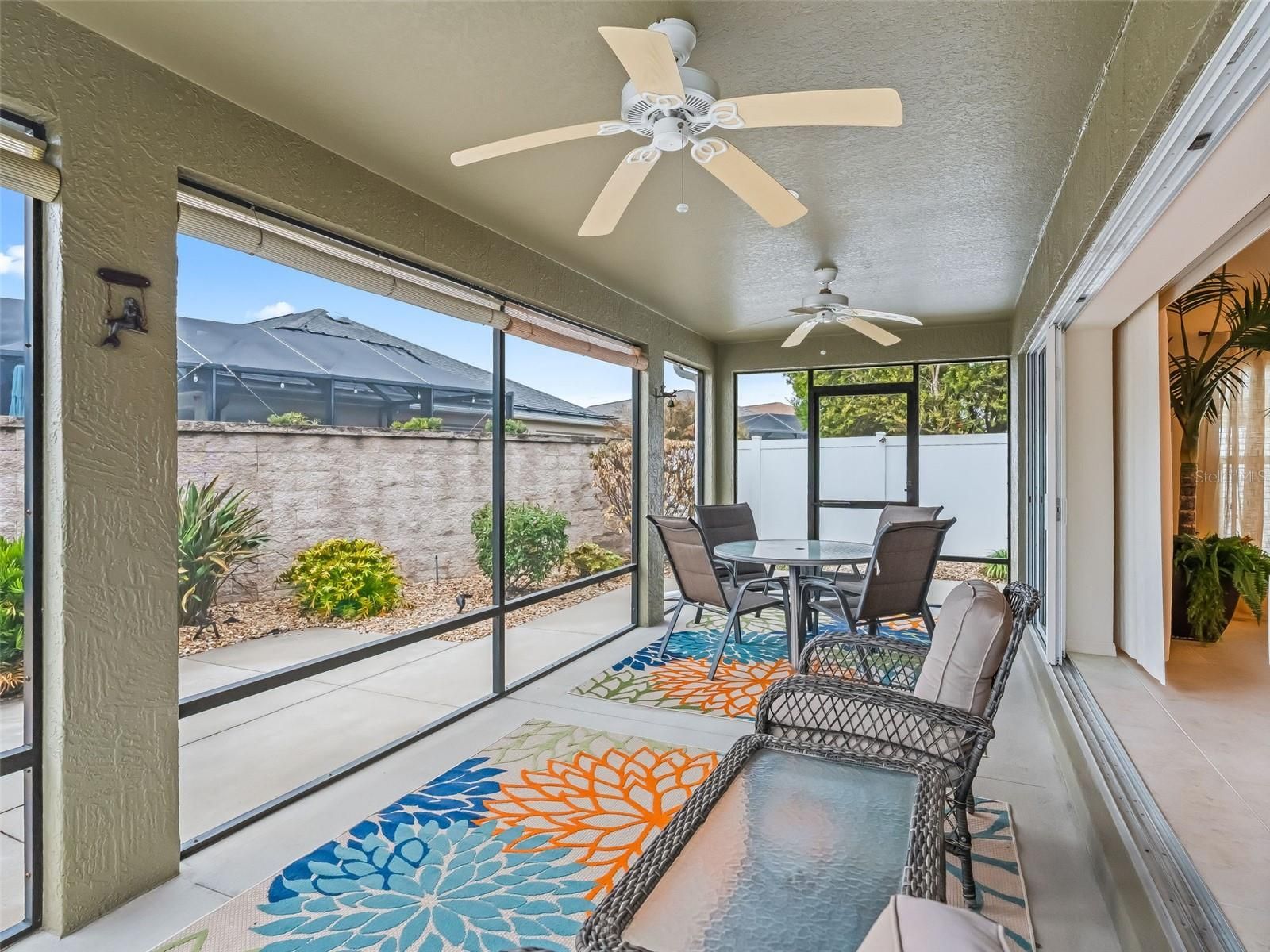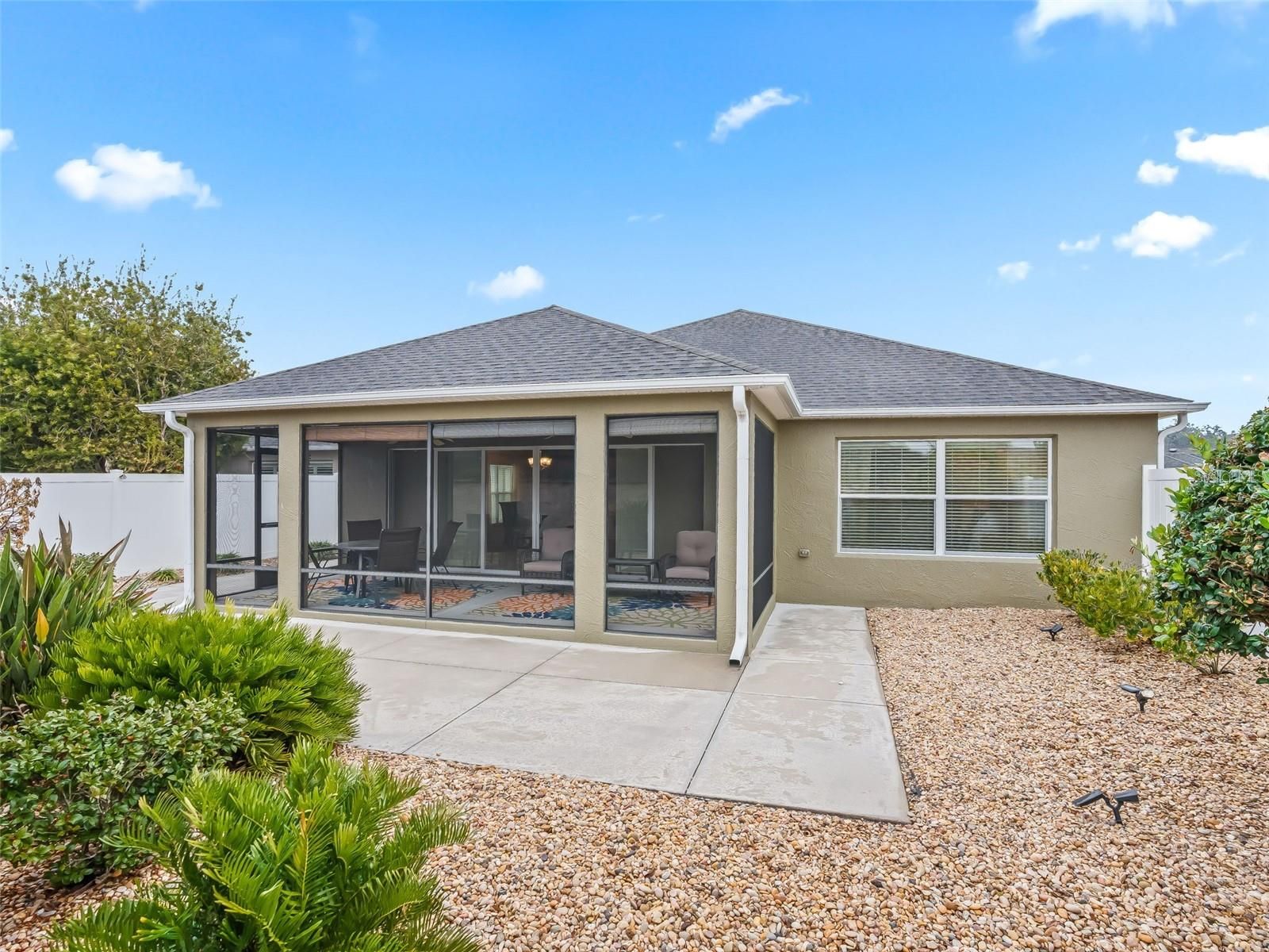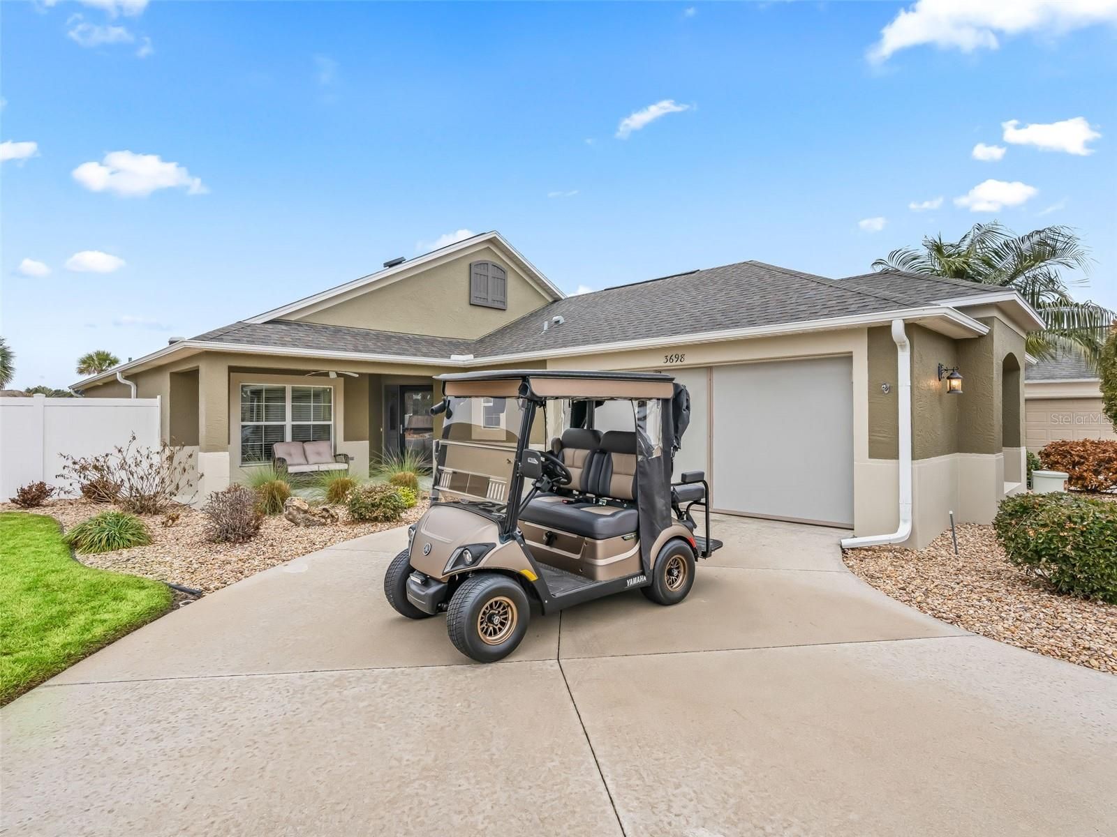 Stunning block and stucco 3-bedroom, 2-bath Wyndham Courtyard Villa with a full 2-car garage, ideally located in the highly sought-after Village of Antrim Dells—one of the closest residential neighborhoods to Brownwood Paddock Square. Situated just under half a mile away, you can easily mosey on over to shopping, dining, and nightly entertainment. Offered furnished, with a 2022 Yamaha gas golf cart available for separate purchase. The open floor plan allows the kitchen to flow seamlessly into the spacious living room, making it ideal for everyday living and entertaining. The kitchen features a decorative backsplash and ample cabinet space. This meticulously maintained home has just had all grout professionally cleaned and sealed throughout the entire home, including the showers, reflecting true pride of ownership. The primary bedroom retreat offers a tray ceiling, en suite bath, and a generous walk-in closet, providing comfort and privacy. Step outside to the large screened-in birdcage lanai, fully covered overhead—an inviting space to relax and enjoy the peaceful outdoor setting with a care-free yard. Residents of Antrim Dells enjoy a bungalow-style villa neighborhood centered around its own recreation area, along with close proximity to the Eisenhower Recreation Center.