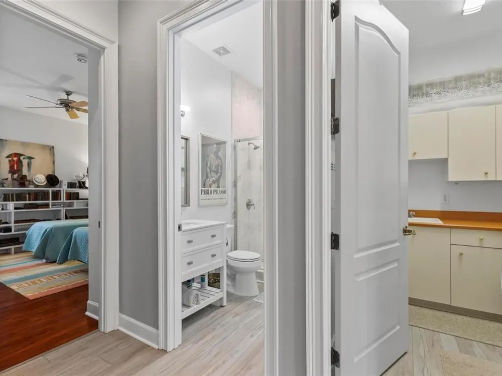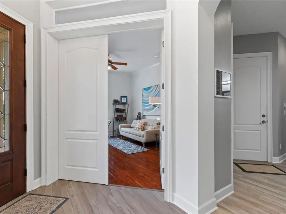 - Cathedral Ceiling(s), Ceiling Fan(s), Crown Molding, Eat-in Kitchen, High Ceilings, Kitchen/Family Room Combo, Open Floorplan, Main Level Primary, Solid Surface Counters, Solid-Wood Cabinets, Split Bedrooms, Thermostat, Walk-In Closet(s), Window Treatments