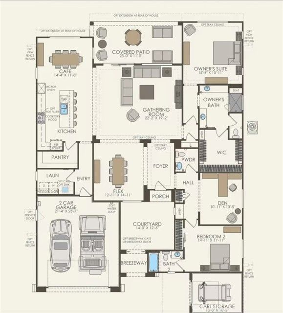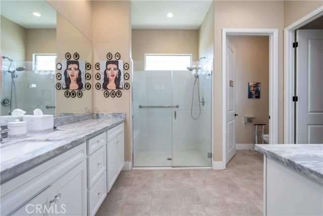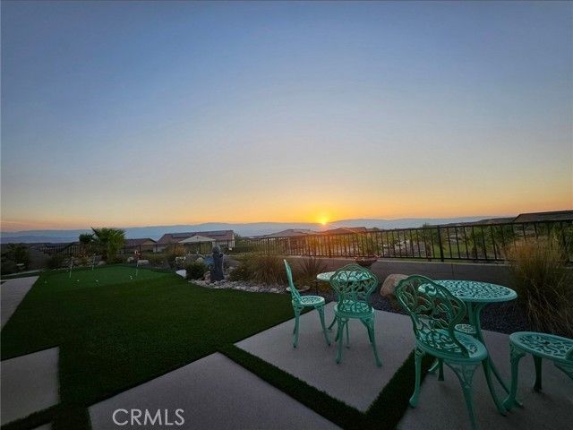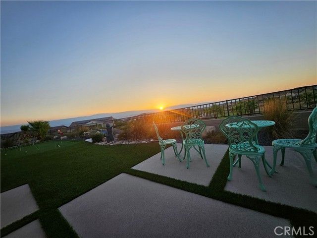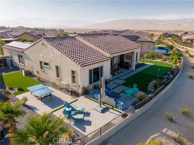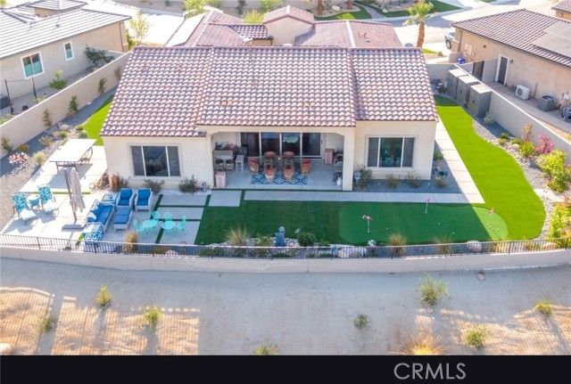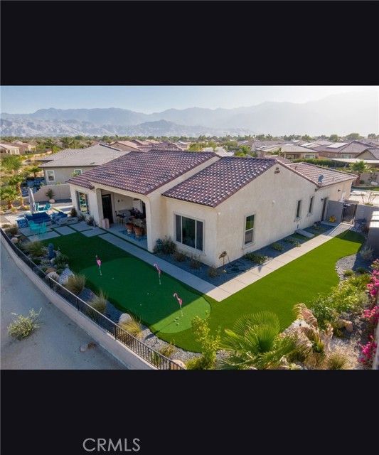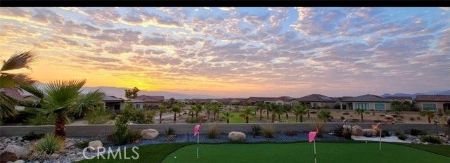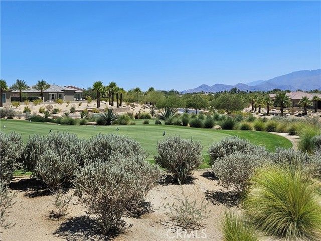 Welcome to a Journey floorplan at Del Webb Rancho Mirage that stands apart from the rest. Situated on an expansive, professionally landscaped lot with large side yards, this home offers breathtaking views that will captivate you, especially during the stunning desert sunrises. After entering through a private courtyard, upon opening the front door you'll immediately notice the high-end upgrades, including composite stone flooring throughout the home. The great room is an entertainer's dream, featuring wall-to-wall sliding doors that create a seamless transition between indoor and outdoor living. The chef's kitchen boasts KitchenAid appliances, an upgraded cabinet package, large island with an eating bar, walk-in pantry and dining area that looks out to your own 3 hole putting green. The adjacent bonus room, currently a music room, offers flexible space that can be adapted to fit your needs. The owner's suite, with private access to the patio, has an ensuite bath that features dual vanities and a spacious walk-in shower with a built-in bench. The large walk-in closet has been thoughtfully customized with extra hanging space, drawers, cupboards, and shoe racks. The back bedroom, offers a private entry, full bath, ceiling fan, and walk-in closet. The hall bath, conveniently located