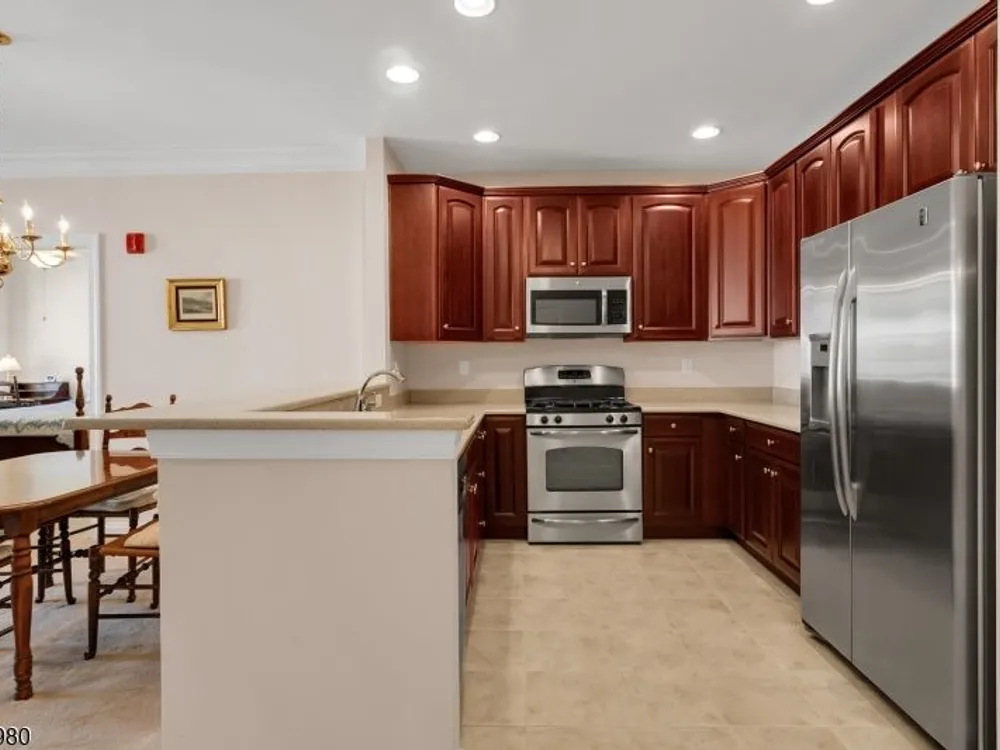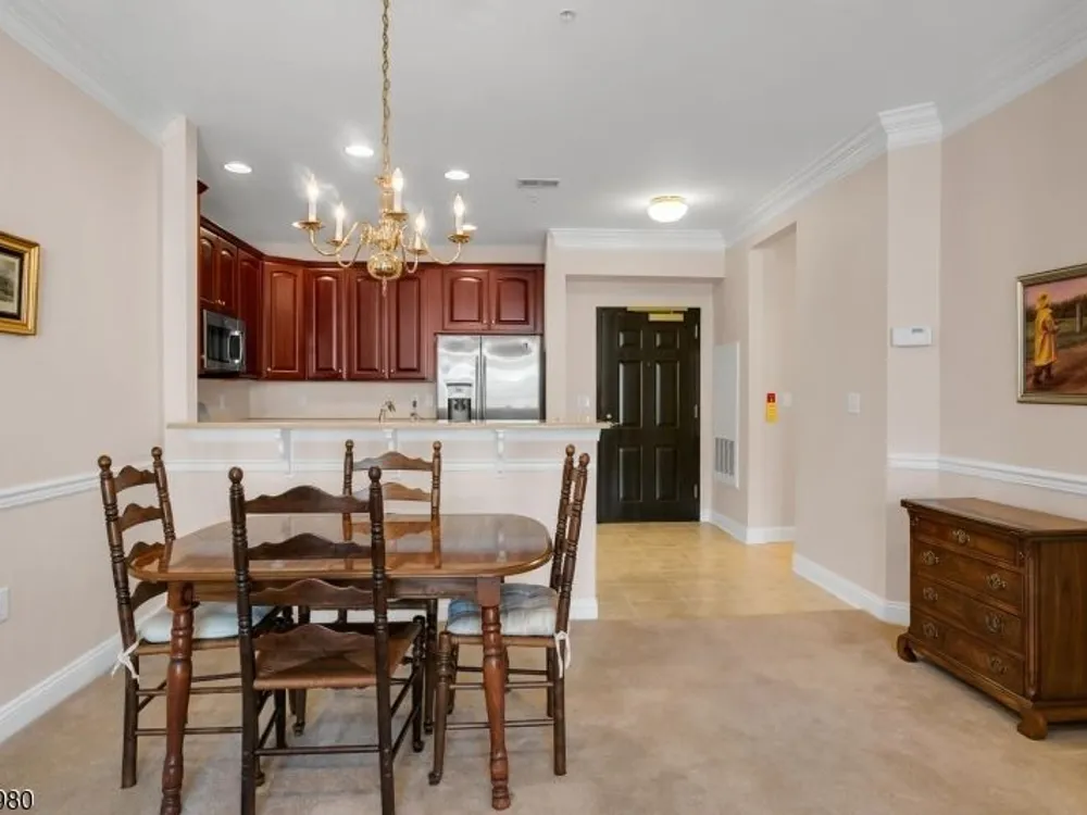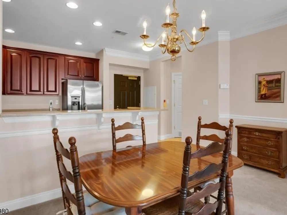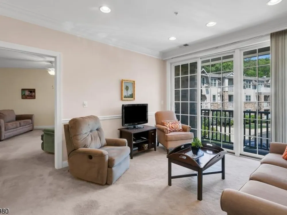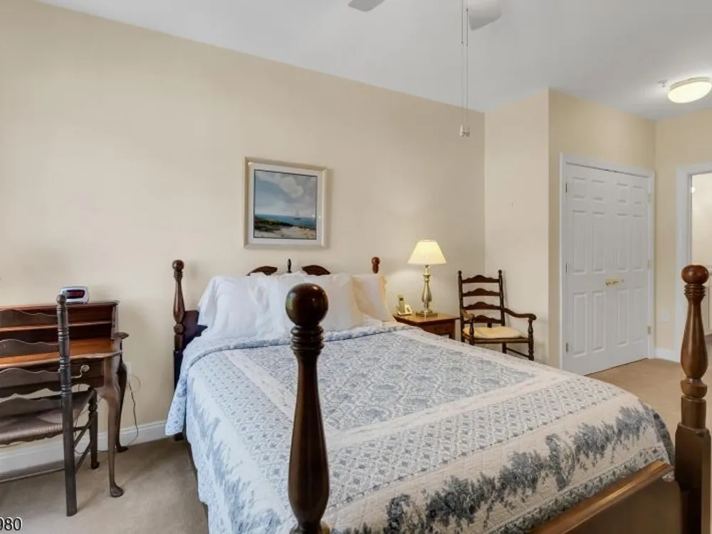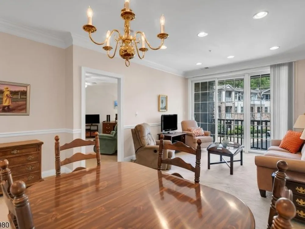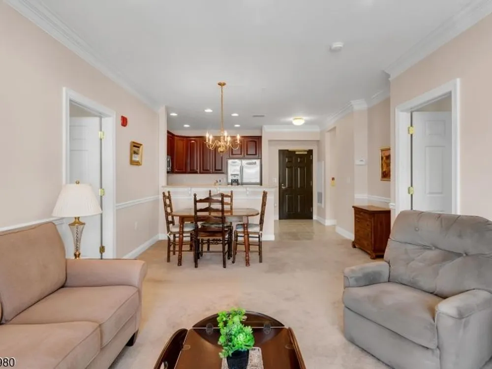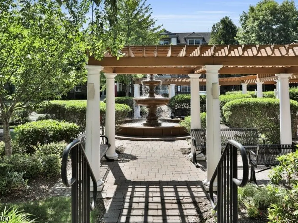 Enjoy resort-style living in this second-floor, two-bedroom, two-bath home with TWO assigned garage spaces, 9 foot ceilings, secure entry, and elevator access throughout at The Four Seasons in Bridgewater. The kitchen flows seamlessly into the living room and features quartz countertops with seating area, tall cabinetry, stainless steel appliances refrigerator, gas range, microwave, dishwasher and an undermount sink. Sliders lead to the balcony with sunny views of the floral circle that make mornings relaxed and evenings inviting. The bright primary suite offers a spacious bedroom, two generously sized closets, and an ensuite bath with a duo sink vanity and walk-in, oversized shower with tile seat and handrail. The multi-purpose guest bedroom has a bath ensuite. A side-by-side washer and dryer make laundry easy. You'll appreciate two garage spaces one next to your storage closet and just five cars from the elevator, the other near the stairs. Amenities include a welcoming fountain, pool, hot tub, bocce court, outdoor benches, and tables in the garden. The surrounding landscaping is beautiful! The clubhouse offers a stocked library, gathering room with bar and fireplace, fitness center, billiard room, card room, and more. Whether you seek tranquility or a vacation-like atmosphere, The Four Seasons delivers. Conveniently located near nationally ranked healthcare, shopping, dining, and major highways, you won't want to miss your chance to embrace this exceptional lifestyle!