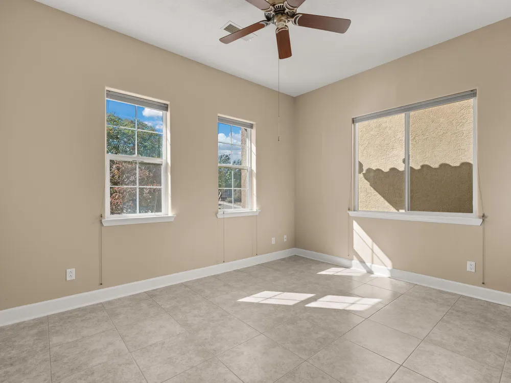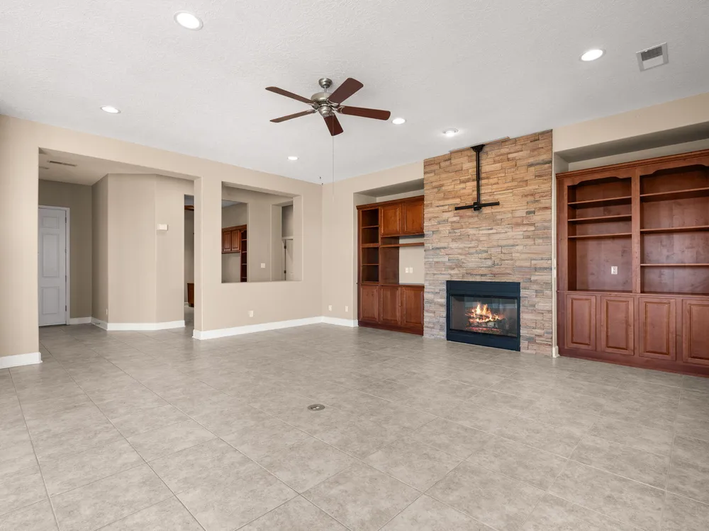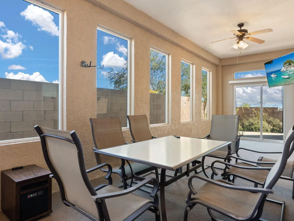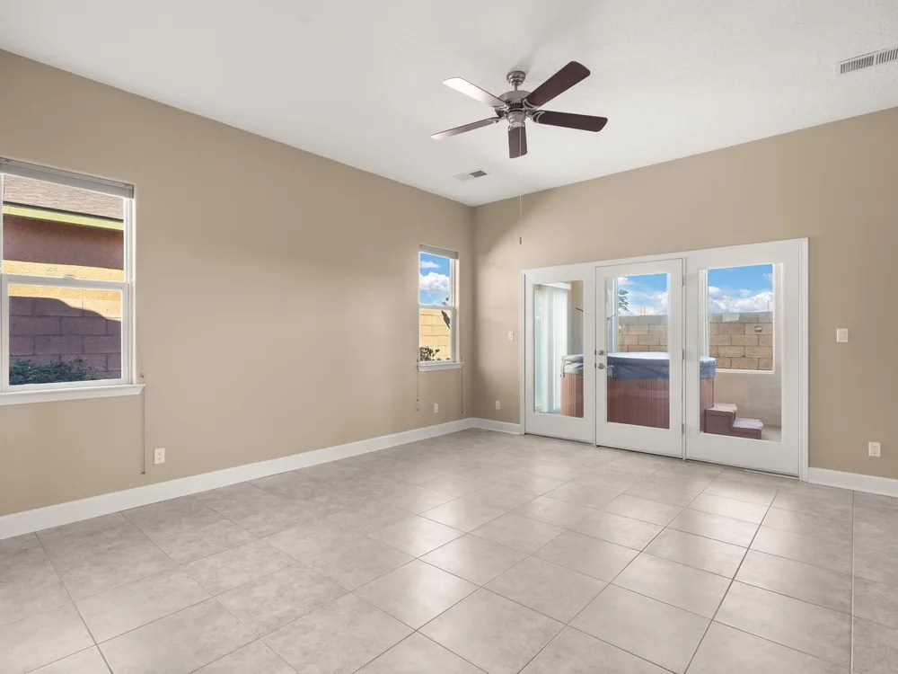 Welcome to your dream home in the prestigious 55+ Jubilee community. This beautifully designed residence offers two spacious bedrooms, a bright studio, and a private office, ideal for creative pursuits or quiet focus. Step into a light-filled living room featuring soaring ceilings, built-in shelves, ceiling fans, a custom entertainment center, and a cozy fireplace. The kitchen is both stylish and functional, with granite countertops, an island, tile backsplash, pantry, built-in appliances, and abundant cabinetry. A dedicated laundry room with washer and dryer adds everyday convenience. The ensuite includes a walk-in closet, double vanity, jet tub, and a walk-in shower. For ultimate relaxation, enjoy the sunlit enclosed sunroom complete with your own private hot tub. Welcome home!