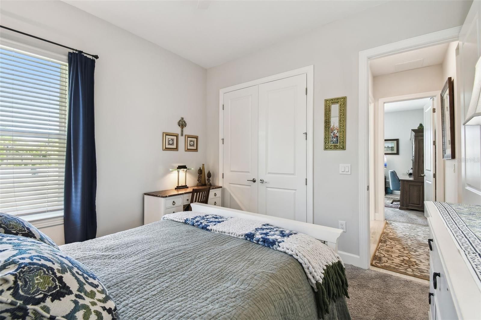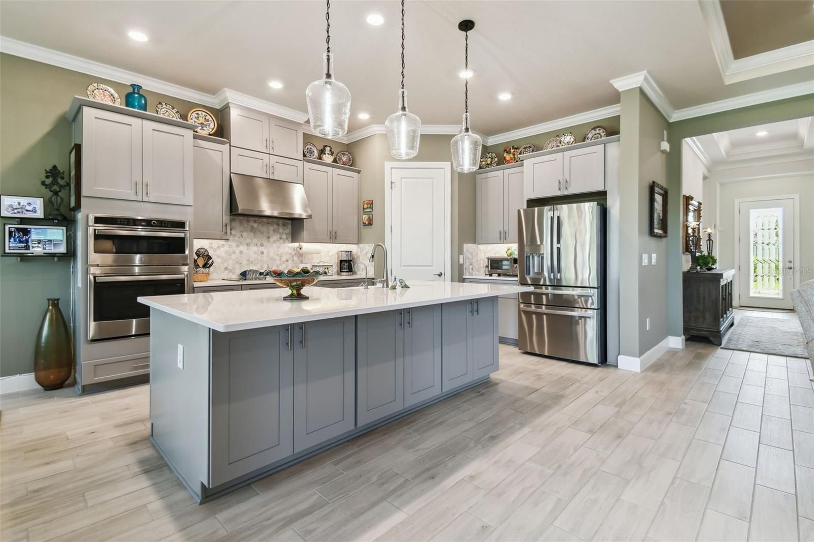 Better than NEW, extensive upgrades to this sought after LETIZIA model, uniquely designed with 3 separate sleeping areas. Each wing with a full bathroom for added privacy. Enter this home from a beautiful LEADED Glass door leading to a GRAND FOYER. Walk in & appreciate the beautifully appointed upgrades including porcelain plank tile flooring throughout main areas & carpeted bedrooms. Laundry room with newer Front Load Washer Dryer with plenty of cabinets & a utility sink. The TWO Car garage & GOLF Cart garage afford an EPOXY floor finish. The Kitchen offers extensive upgrades with pull out drawers, GE stainless steel appliances & stainless steel RANGE HOOD, Carrera Marble with a hexagon pattern tiled backsplash. The Kitchen island has a stone counter with a Ceramic FARMHOUSE SINK, front under counter cabinets for additional storage, Walk-in PANTRY with custom shelving. The home features a WATER FILTRATION system. Tray & Coffer ceilings, extensive use of CROWN MOLDING, PLANTATION SHUTTERS & CEILING FANS throughout. The 9ft SLIDING GLASS DOORS POCKET & OPEN unto your EXTENDED SCREENED LANAI for that true South Florida living. Sit back relax & enjoy nearby concerts or watch golfers on the Stonegate PUTTING GREEN from the privacy of your own backyard. This home is located on a Cul-de-sac minuets from Solivita's vibrant Town Center with easy access to restaurants, Pharmacy, the Riviera Spa (over 32000sf) including both an INDOOR & OUTDOOR POOL & two HOT TUBS overlooking the LAKE. Solivita rates as one of the best retirement communitiesin the US by 55places. Offering Tennis, Pickleball & BOCCE ball courts, 14 HEATED POOLS, Shuffleboard/Basket ball courts & MILES of BIKE PATHS. Small & Large Dog parks, TOT LOT Playground & so much more. Recently completed POINCIANA LAKES PLAZA is located directly accross SOLIVITA'S main entrance with shops, grocery stores & restaurants all within minuets. Come visit SOLIVITA today & call it HOME.