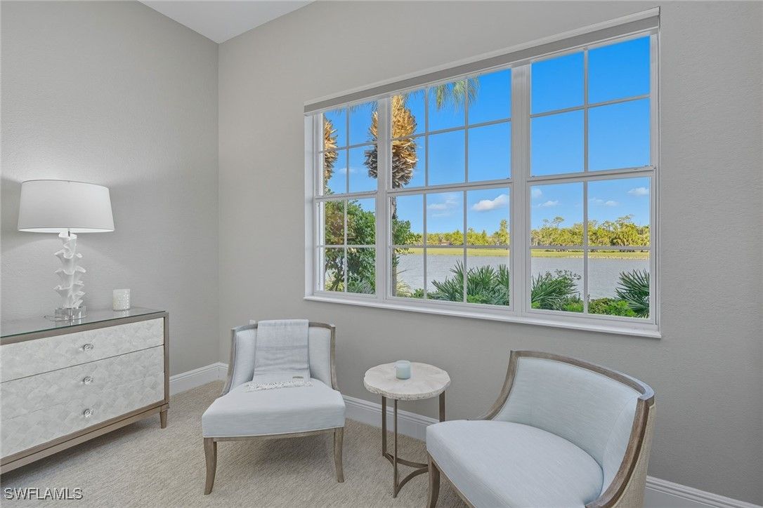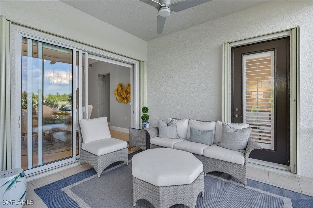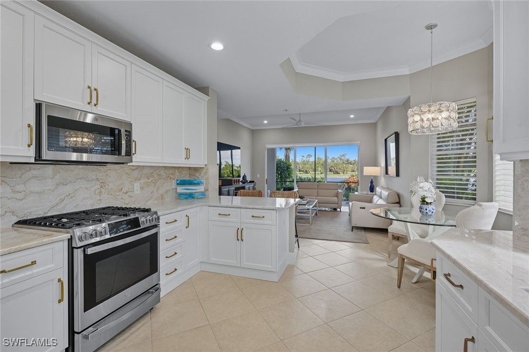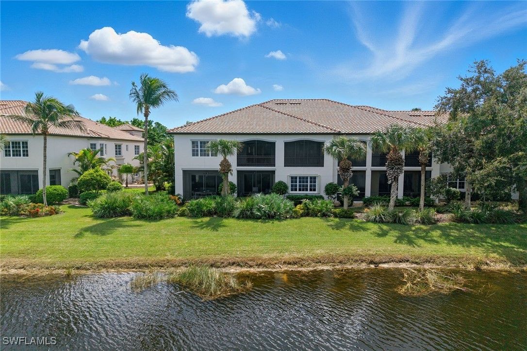 Experience refined coastal living in this beautifully renovated first-floor residence, positioned to capture tranquil lake and golf course views within the desired Montreux enclave of Fiddler’s Creek. Designed with elegance and livability in mind, this spacious three-bedroom, three-bath home lives like a single-family residence, offering private entrance, attached two-car garage, and an open, light-filled layout. The gourmet kitchen impresses with quartzite countertops and backsplash, white cabinetry, stainless steel appliances, and a charming breakfast nook overlooking lush tropical gardens. Each of the three baths has been completely renovated, showcasing elegant finishes, modern tilework and spa-like details throughout. The serene owner’s suite opens to the lanai and features dual walk-in closets and a beautifully updated bath with a soaking tub and frameless glass shower. Additional enhancements include a freshly painted interior, designer lighting and a new HVAC system, creating a move-in-ready retreat that blends comfort and modern sophistication. A screened lanai provides the ideal setting for morning coffee or evening gatherings, framed by sweeping water and golf vistas. Montreux is undergoing a community-wide landscaping enhancement, further elevating the neighborhood’s beauty and appeal. Residents enjoy access to the award-winning Fiddler’s Creek Club & Spa, offering fine and casual dining, resort-style pools, a full-service fitness center, spa, tennis, pickleball and an active social calendar. Optional golf, beach and marina memberships further enhance the unparalleled Florida lifestyle this residence affords.
