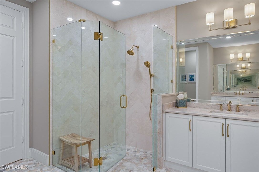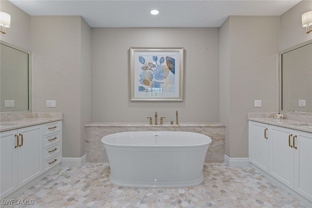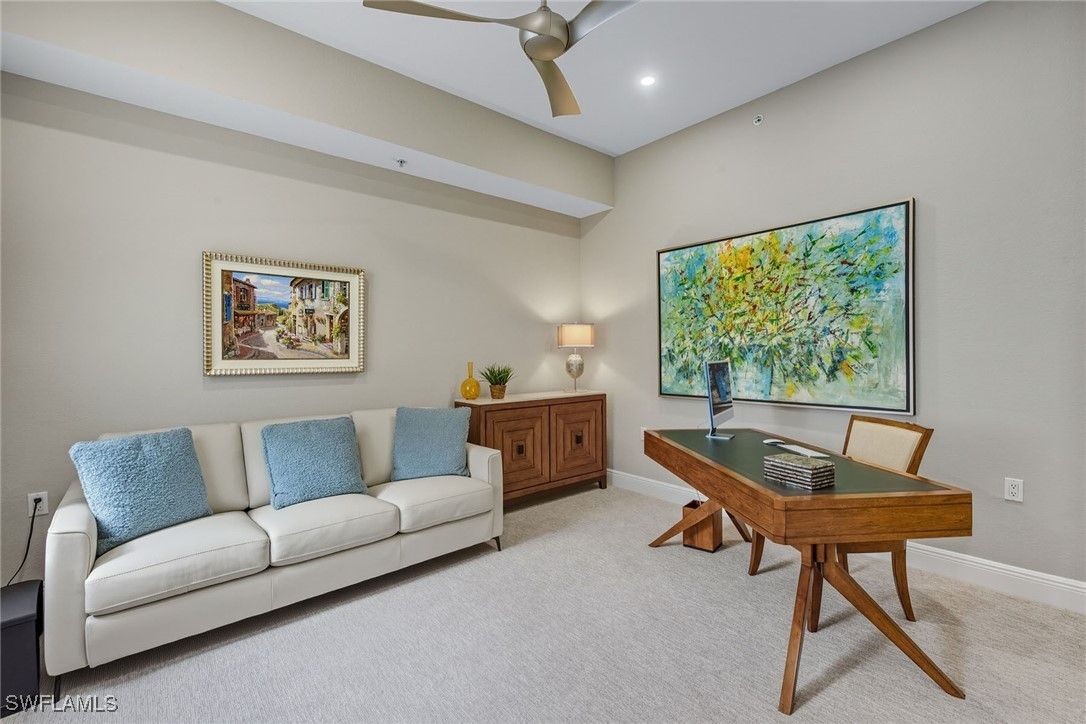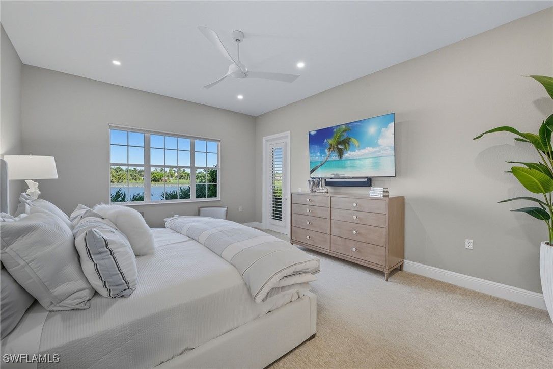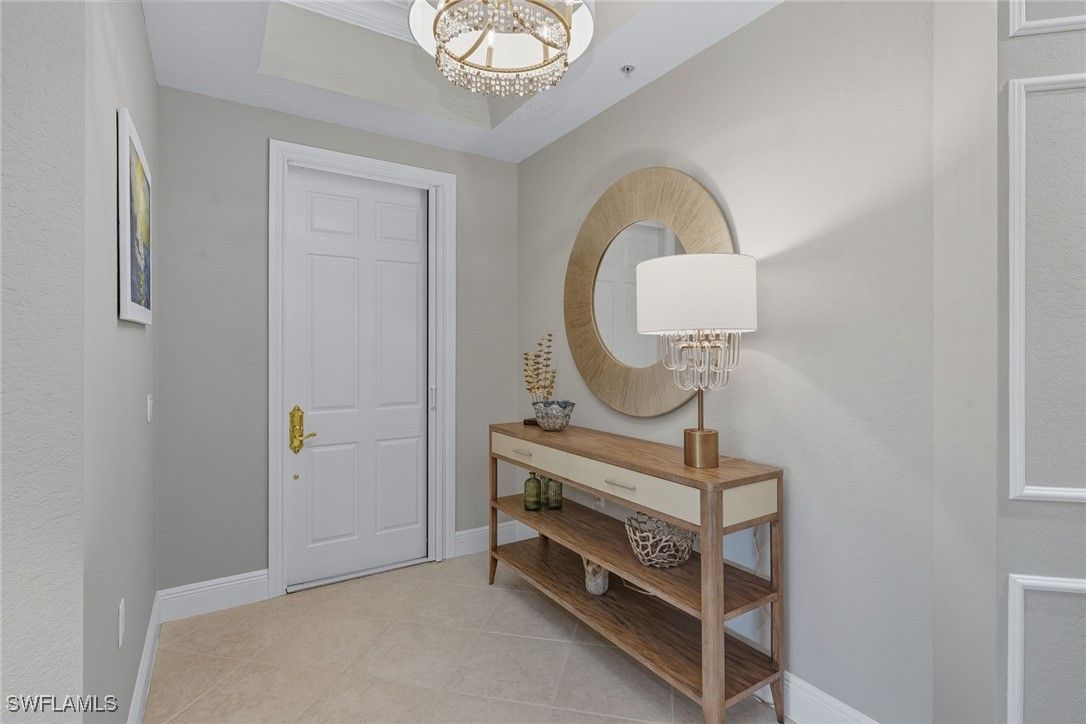 Experience refined coastal living in this beautifully renovated first-floor residence, positioned to capture tranquil lake and golf course views within the desired Montreux enclave of Fiddler’s Creek. Designed with elegance and livability in mind, this spacious three-bedroom, three-bath home lives like a single-family residence, offering private entrance, attached two-car garage, and an open, light-filled layout. The gourmet kitchen impresses with quartzite countertops and backsplash, white cabinetry, stainless steel appliances, and a charming breakfast nook overlooking lush tropical gardens. Each of the three baths has been completely renovated, showcasing elegant finishes, modern tilework and spa-like details throughout. The serene owner’s suite opens to the lanai and features dual walk-in closets and a beautifully updated bath with a soaking tub and frameless glass shower. Additional enhancements include a freshly painted interior, designer lighting and a new HVAC system, creating a move-in-ready retreat that blends comfort and modern sophistication. A screened lanai provides the ideal setting for morning coffee or evening gatherings, framed by sweeping water and golf vistas. Montreux is undergoing a community-wide landscaping enhancement, further elevating the neighborhood’s beauty and appeal. Residents enjoy access to the award-winning Fiddler’s Creek Club & Spa, offering fine and casual dining, resort-style pools, a full-service fitness center, spa, tennis, pickleball and an active social calendar. Optional golf, beach and marina memberships further enhance the unparalleled Florida lifestyle this residence affords.