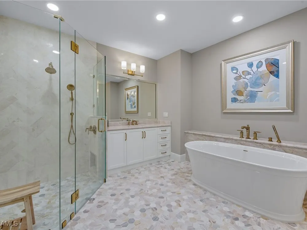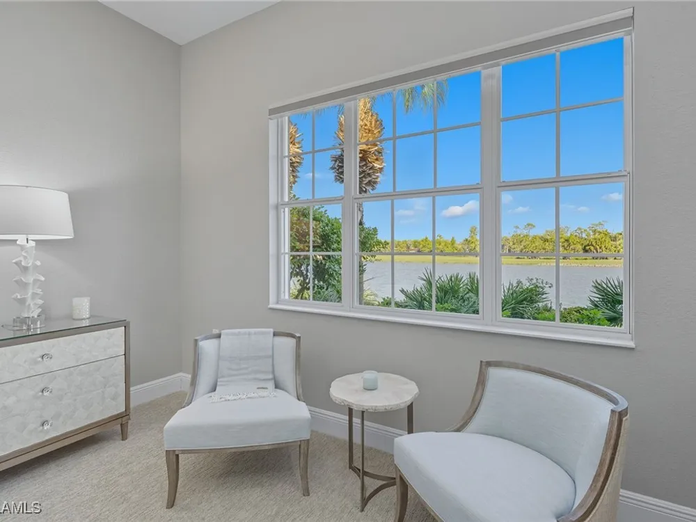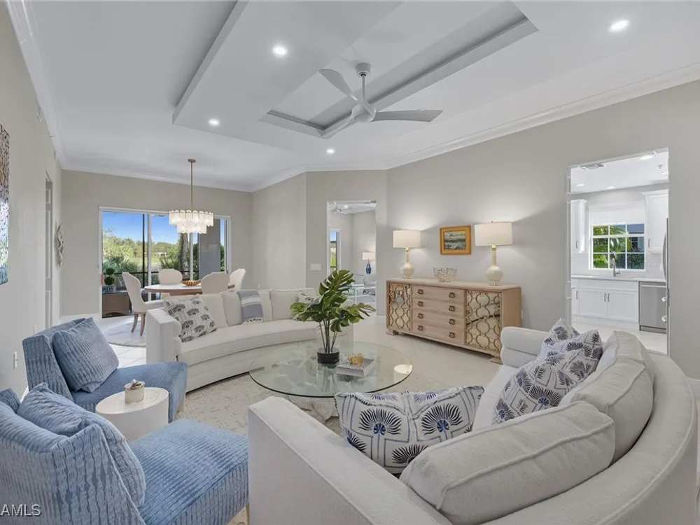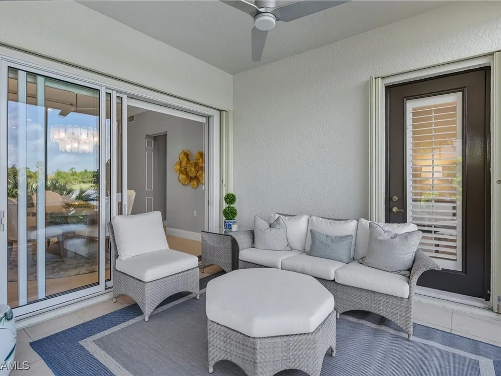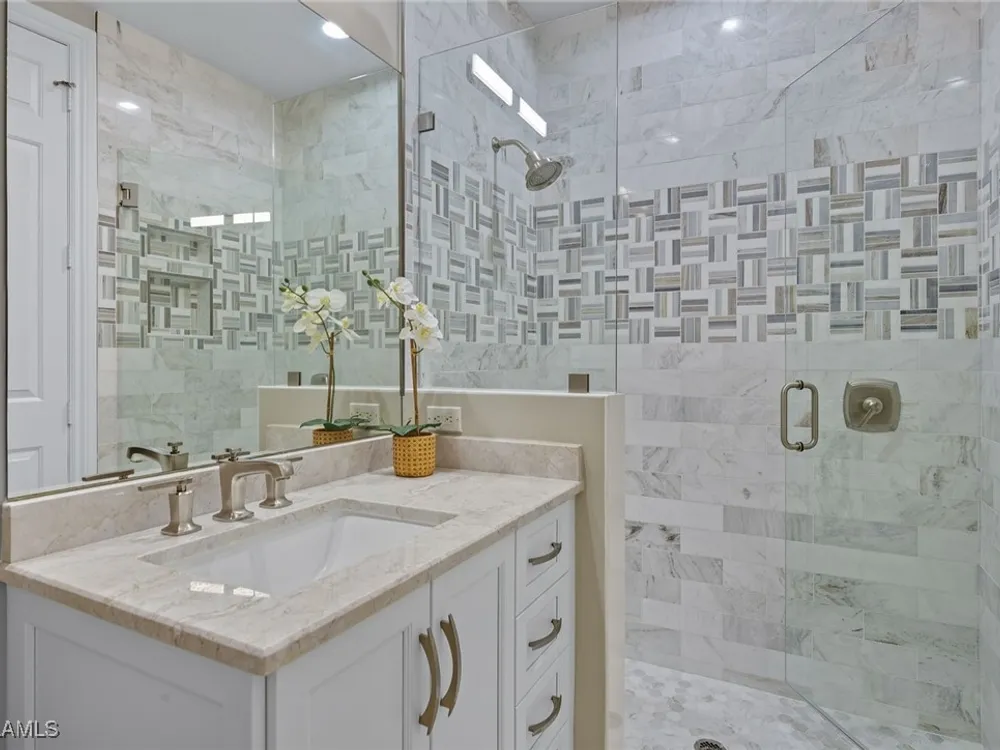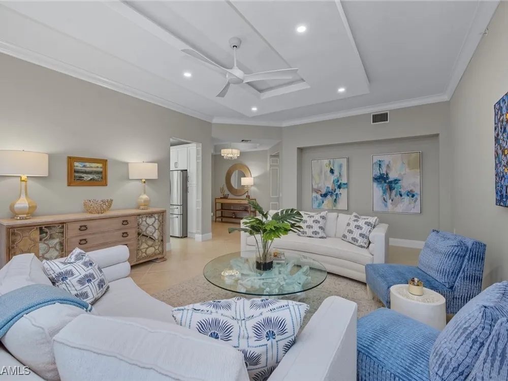 Experience refined coastal living in this beautifully renovated first-floor residence, perfectly positioned to capture tranquil lake and golf course views within the coveted Montreux enclave of Fiddler’s Creek. Designed with elegance and livability in mind, this spacious three-bedroom, three-bath home lives like a single-family residence, offering a private entrance, attached two-car garage, and an open, light-filled layout. The gourmet kitchen impresses with quartzite countertops and backsplash, white cabinetry, stainless steel appliances, and a charming breakfast nook overlooking lush tropical gardens. Each of the three bathrooms has been completely renovated, showcasing elegant finishes, modern tilework, and spa-like details throughout. The serene owner’s suite opens to the lanai and features dual walk-in closets and a beautifully updated bath with a soaking tub and frameless glass shower. Additional enhancements include a freshly painted interior, designer lighting, and a brand-new HVAC system, creating a move-in-ready retreat that blends comfort and modern sophistication. A screened lanai provides the ideal setting for morning coffee or evening gatherings, framed by sweeping water and golf vistas. Montreux is currently undergoing a community-wide landscaping enhancement, further elevating the neighborhood’s beauty and appeal. Residents enjoy access to the award-winning Fiddler’s Creek Club & Spa, offering fine and casual dining, resort-style pools, a full-service fitness center, spa, tennis, pickleball, and an active social calendar. Optional golf, beach, and marina memberships further enhance the unparalleled Florida lifestyle this residence affords.