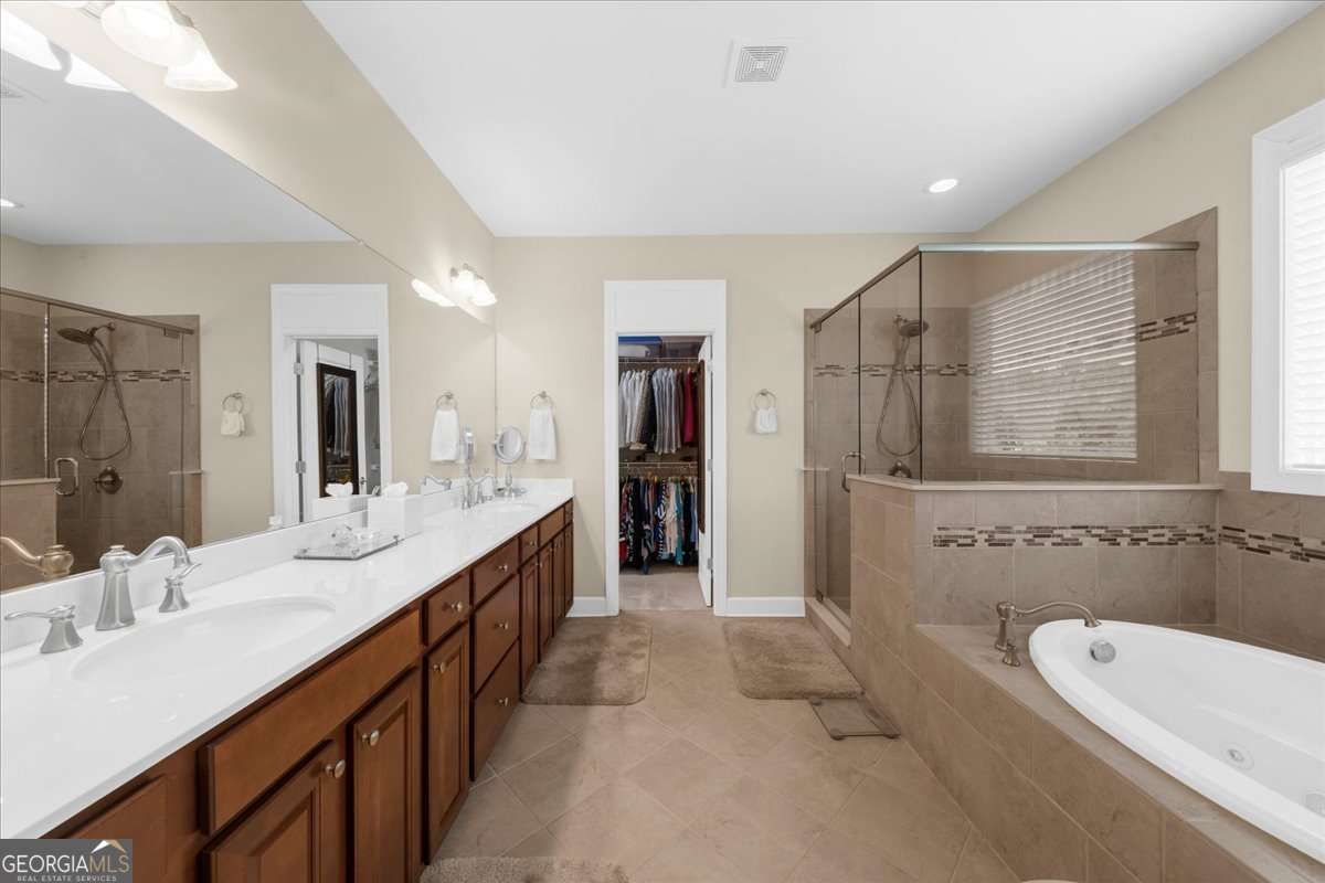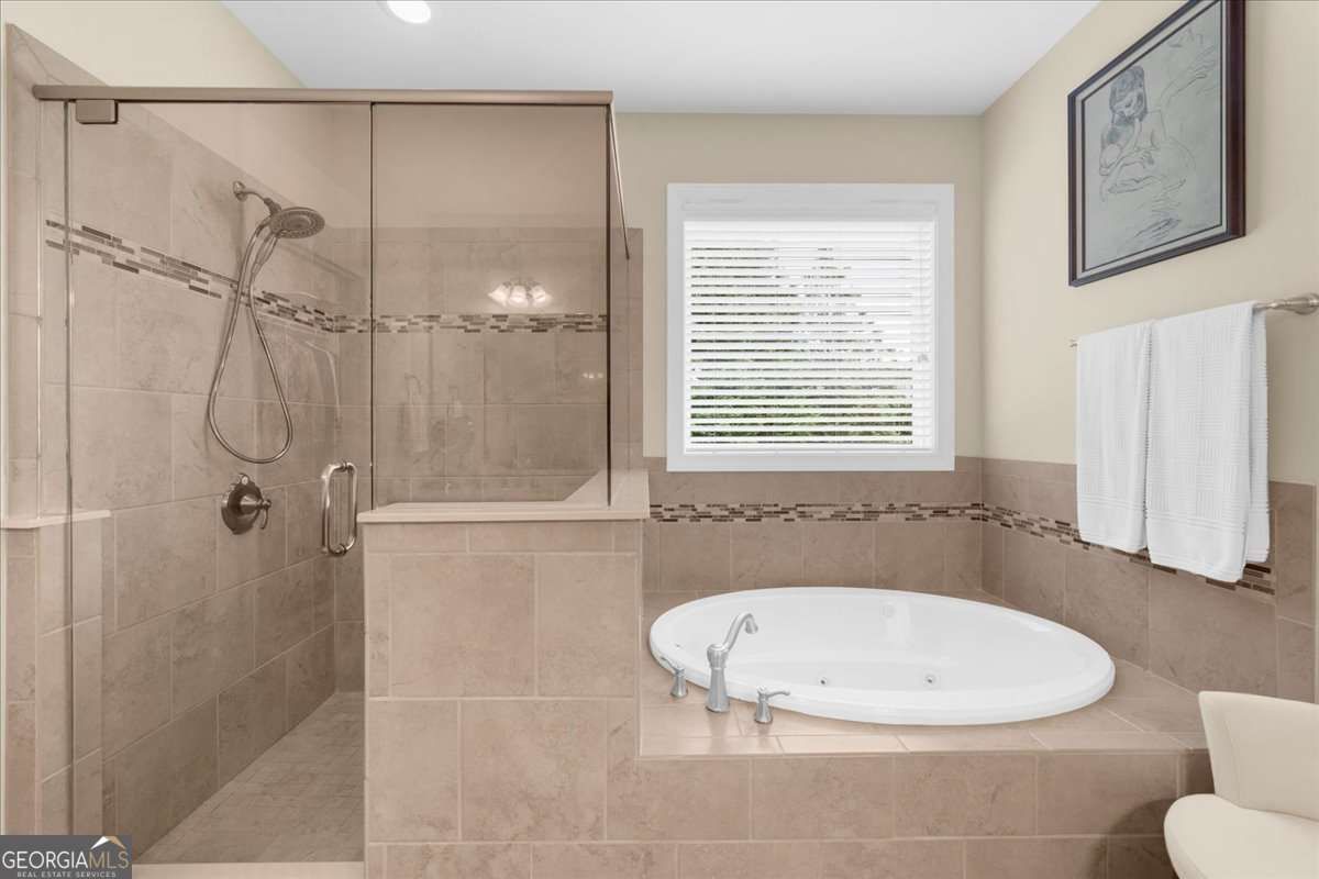 - Double Vanity, High Ceilings, Main Level Primary, Separate Shower, Soaking Tub, Split Bedrooms, Tile Bath, Tray Ceiling(s), Walk-In Closet(s), Dual Pane Window(s), Window Treatments, Family Room, Entrance Foyer, Laundry Facility, Sunroom
