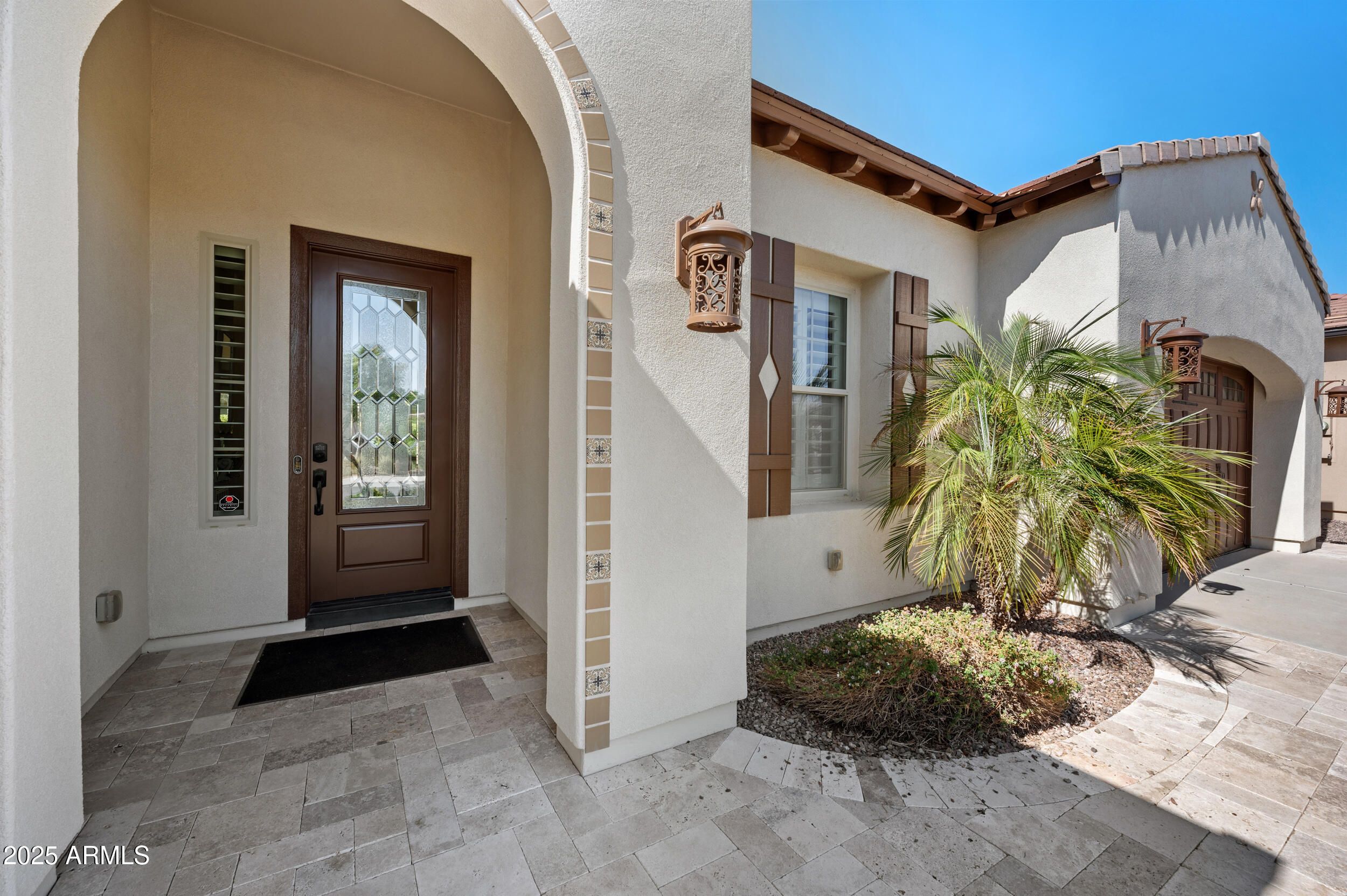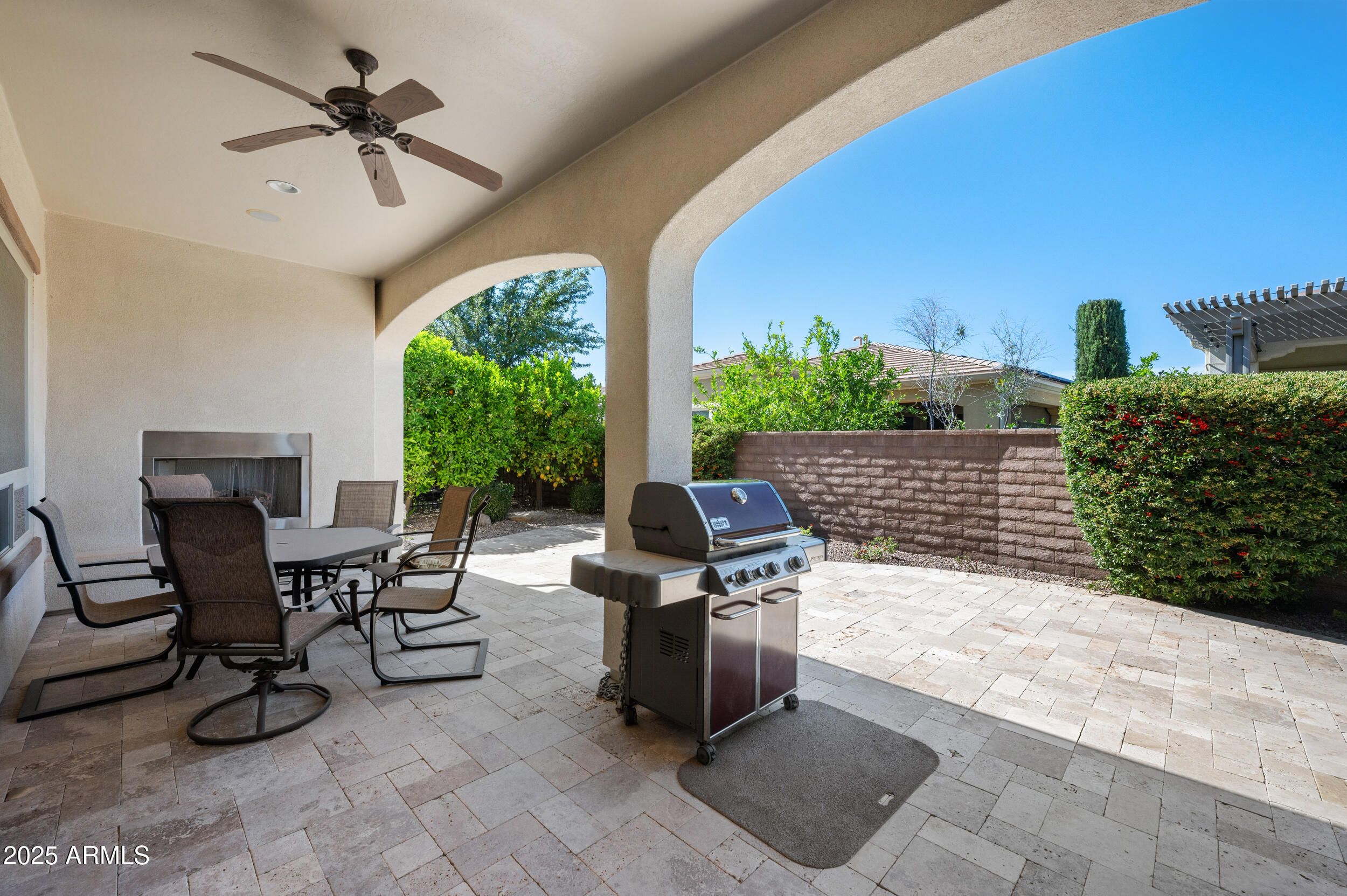Experience luxury resort living in the prestigious, gated Encanterra community! This beautifully appointed 2 bedroom, 2.5 bath home comes FULLY FURNISHED and offers amazing amenities for both full-time living and seasonal enjoyment. Located on a quiet street, this home features an open-concept floor plan and front living area that can easily be converted to an office. Gourmet kitchen with stainless steel appliances including large built-in fridge, granite countertops, and huge island perfect for entertaining. Awesome double primary bedroom floor plan with junior suite at front of home and primary bedroom located at rear of property. Primary bedroom has large bedroom area, with two large closets, jetted tub and big walk-in shower. Primary bedroom also offers an exercise or bonus room that is currently furnished as another bedroom. Side courtyard with fountain and built-in fireplace wall at back patio. Professionally landscaped backyard, and plenty of room to relax or host guests. The home includes energy-efficient upgrades including OWNED SOLAR and low-maintenance landscaping perfect for a lock-and-leave lifestyle. As a resident of Encanterra, you'll enjoy access to world-class amenities including an 18-hole Tom Lehman-designed golf course (optional membership), resort-style pools, full-service spa, and state-of-the-art fitness center, wine bar, on-site restaurants, endless clubs & events, tennis, pickleball, bocce courts, and scenic walking trails. Whether you're seeking a vibrant social life, golf paradise, or peaceful retreat, this home has it all. Located just minutes from Queen Creek dining, shopping, and major freeways, this is Arizona living at its finest.