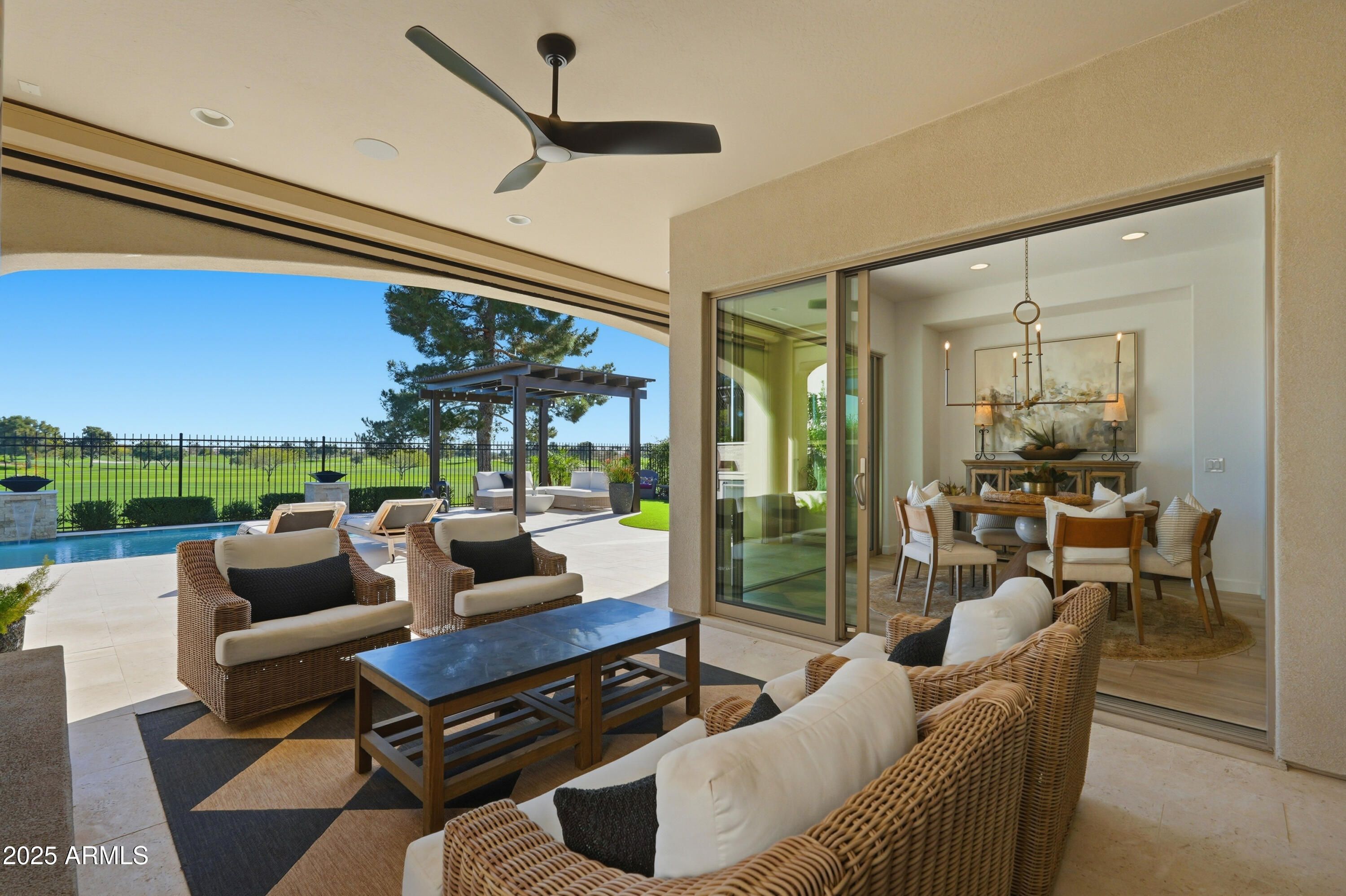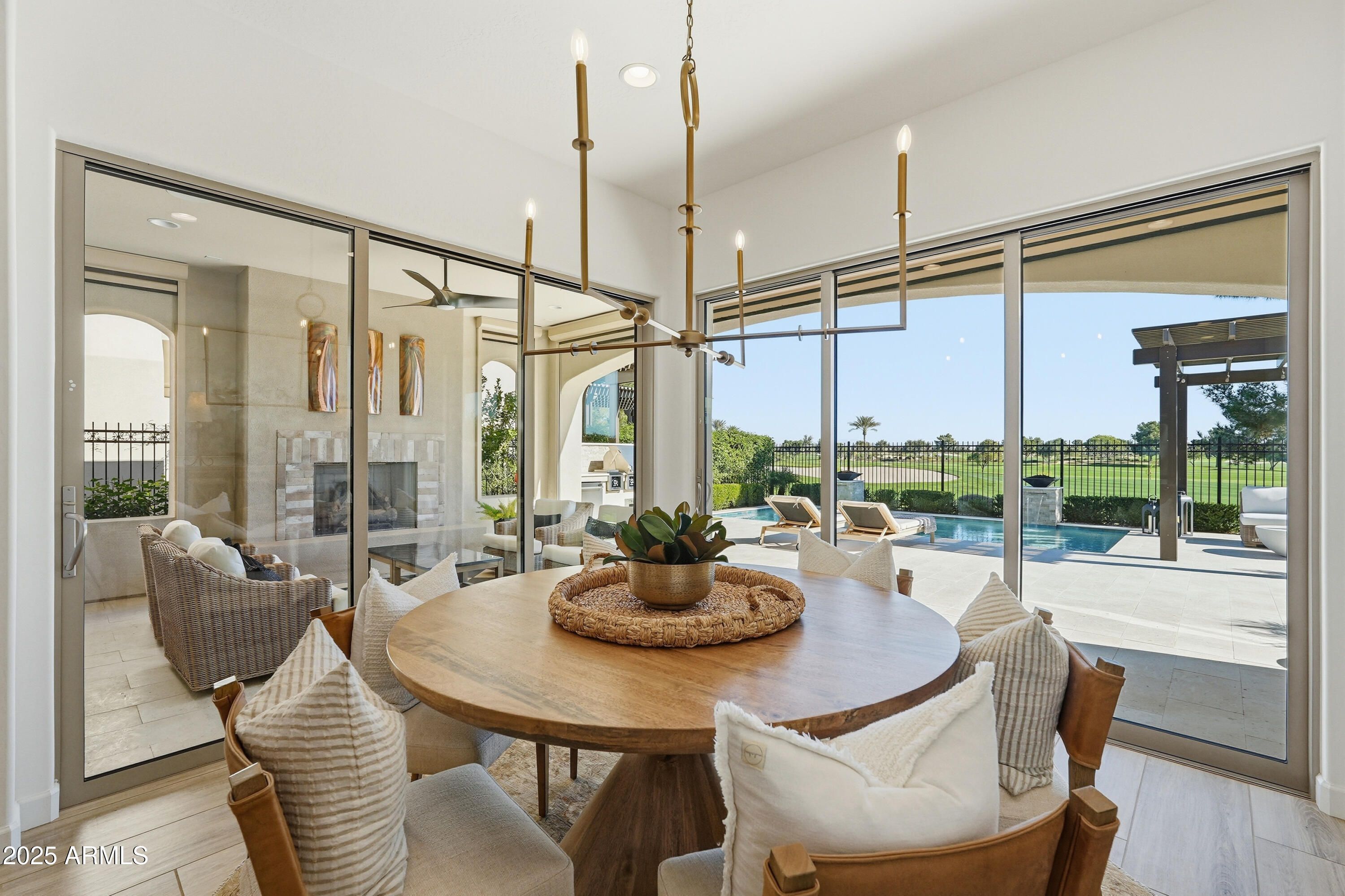 Golf course living at its best at Encanterra! Step into a resort-style backyard featuring a sparkling pool, pergola, custom built-in grill, turf grass, and a spacious patio with a cozy fireplace plus a screened-in area for year-round comfort. The backyard is a true showstopper. Inside, the dining room stuns with a double rolling wall of glass for true indoor-outdoor living. Enjoy a chef's kitchen with a large island, upgraded flooring throughout, custom lighting in every space, and stylish window coverings. A private den with custom doors makes the perfect home office, and the golf cart garage keeps Encanterra life easy. Your guests will enjoy the en-suite bath that feels and looks like luxury. Start your year off right by making Encanterra your address in 2026!
