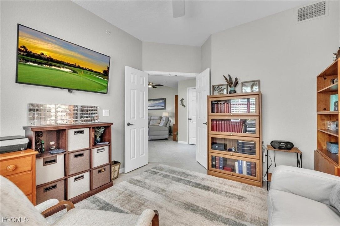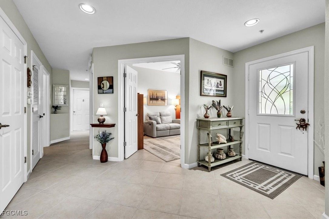 Great opportunity to own a first floor unit in the gated Verandah community in the desirable Pebblebrook neighborhood. The exceptional home features 1532 sq. ft. of living space with 2 Bedrooms, Den, 2 Baths, screened in Lanai and two car garage. As you enter the home you realize that you are in a special place. The open feel greets you into the spacious family room and adjacent dining room with diagonal tile throughout. The kitchen is open and also has a view of the family room. It has newer appliances, granite countertops, attractive backsplash and plenty of cabinet space with a nice pantry. A spacious breakfast room area complement the main living area. The primary bedroom is large with access to the Lanai and features plantation shutters. The primary bathroom has dual sinks and a nice vanity with upgraded lighting and lighter color cabinets. Add to this a walk in shower and large tub and you have everything you need in this Master suite. The expansive Den has two French doors which add privacy if you decide to use the space for additional sleeping areas. The second bedroom and second bath with a walk in shower also provide plenty of space for your guests or family when they visit. Newer washer and dryer and AC unit, plantation shutters throughout and an epoxy garage floor with overhead racks for storage also add to the appeal of this home. The condo has a Radon mitigation system in placed. Pebblebrook has new roofs and new paint which was done recently. The screened in Lanai with Hurricane Storm shutters has one of the better views in Verandah with a view of hole #17 on the Jack Nicklaus designed course and a lake in the background. Enjoy the evening sunsets from the spacious lanai with your favorite beverage and while you entertain friends and family. Pebblebrook offers all of its residents a separate community pool/spa, fitness area and community room. Additionally as a member of the Verandah Club you will have access to 2 Championship golf courses designed by jack Nicklaus and Bob Cupp, tennis facility, state of art of fitness facility, resort style pool, pickleball, 9 miles of walking and jogging paths, kayaks, playground, dog park, multiple restaurants and an active calendar to meet everyone's needs. Don't miss out on the opportunity to own your own piece of paradise.