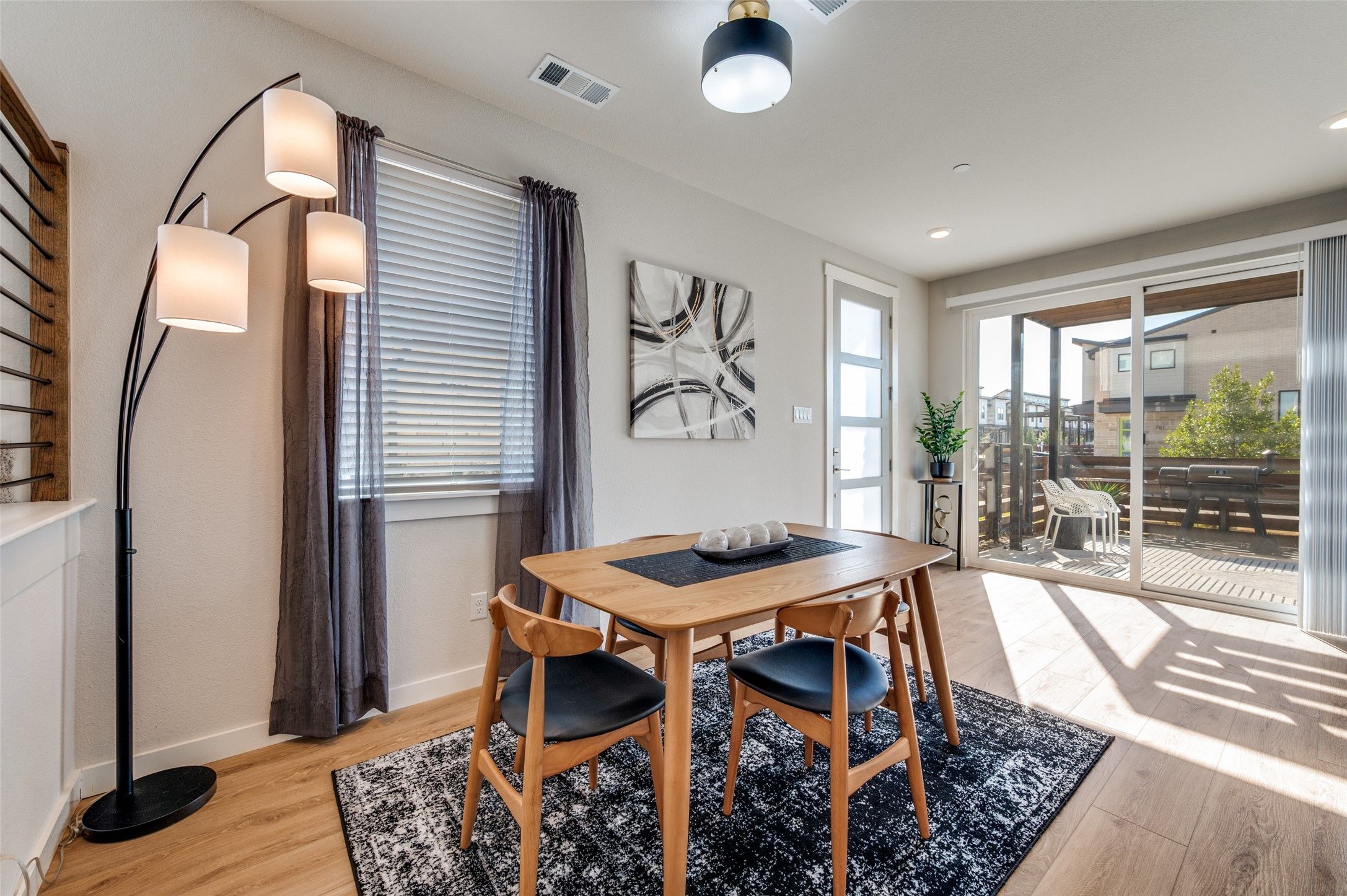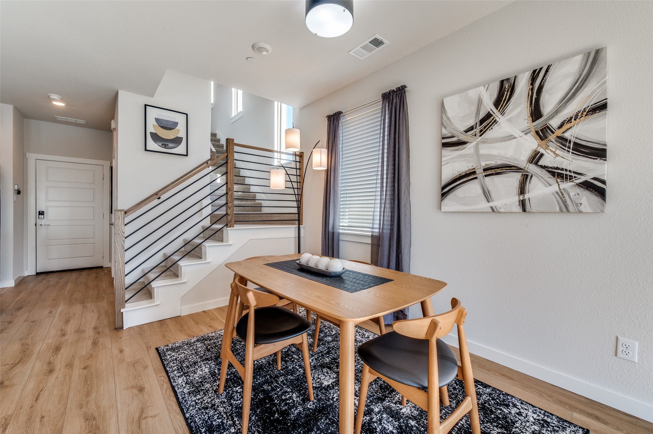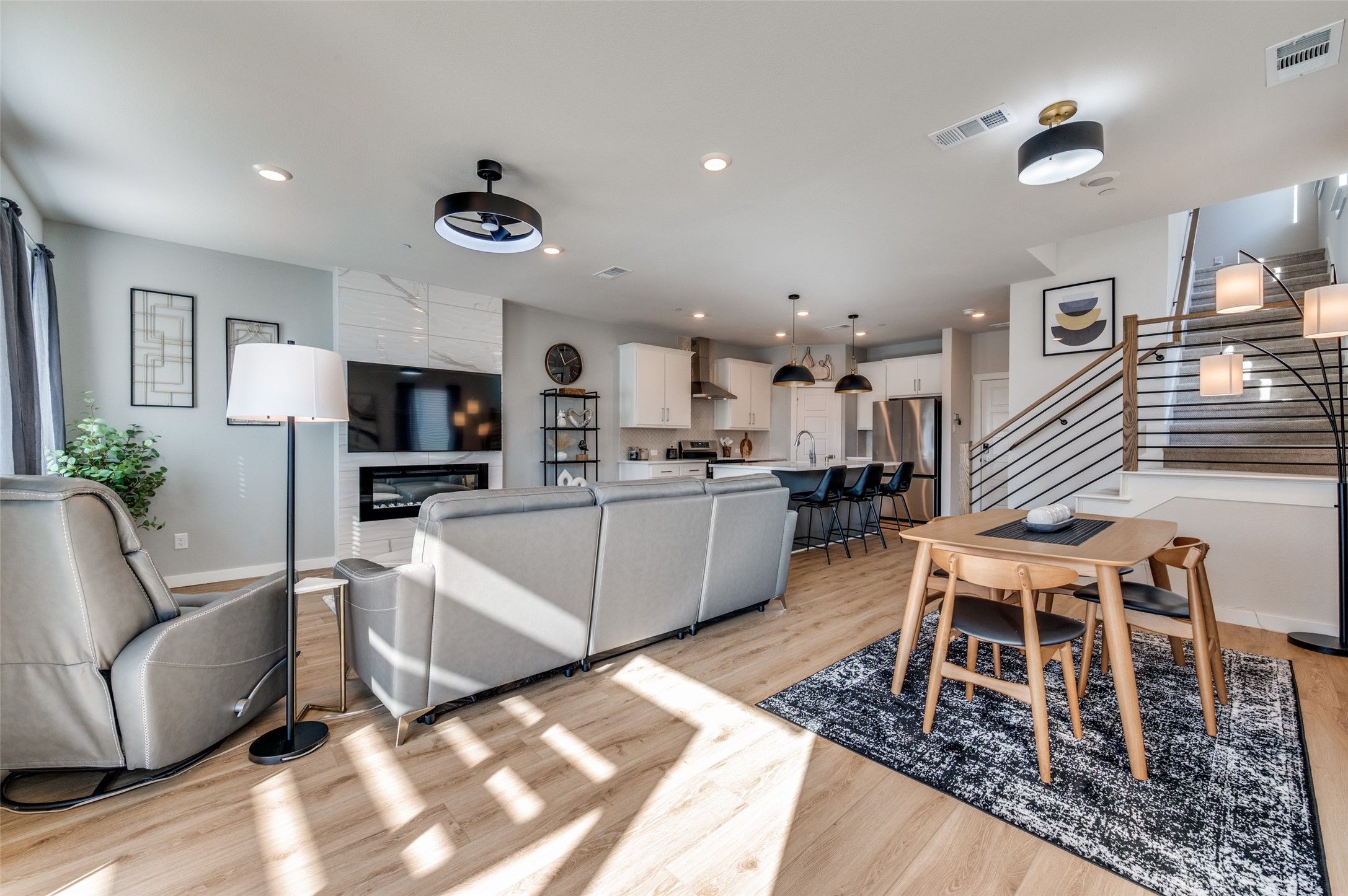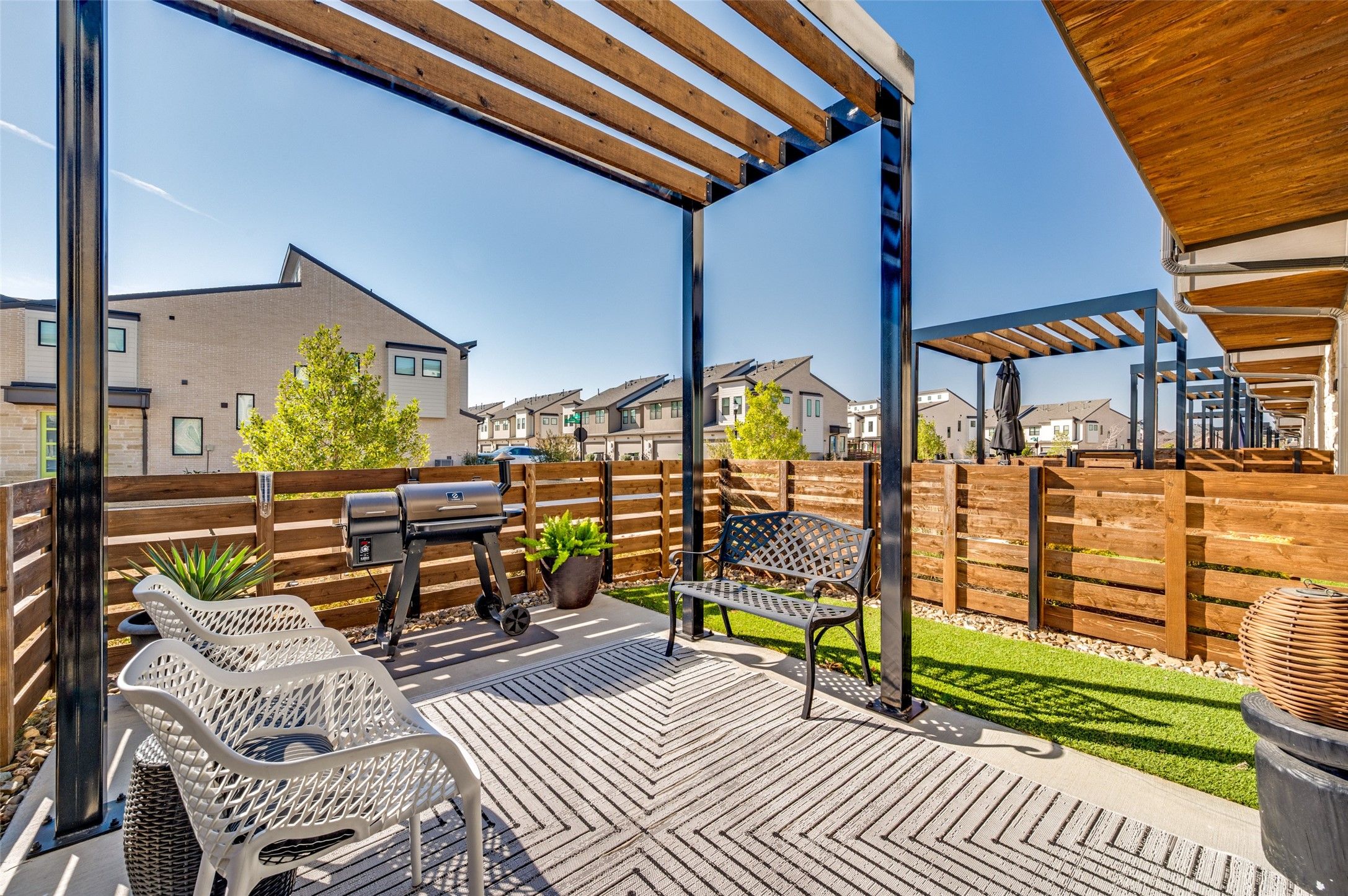 Beautiful end-unit townhome located in the heart of Windsong Ranch that seamlessly blends modern design, thoughtful upgrades, and a truly maintenance-free lifestyle with lawn care, landscaping, and exterior maintenance included. As you enter, you are greeted with the latest trends in modern design and architecture, neutral color palette & light oak LVP flooring throughout the first floor. The open-concept main living area features an electric fireplace, designer fixtures and hardware, ample natural lighting from the added windows and end unit location & sliding glass door leading to the extended private patio with pergola that creates the perfect setting for outdoor dining or entertainment. The elegant kitchen showcases premium quartz countertops, high-end induction range, sleek Samsung Bespoke refrigerator, corner pantry and large center island with extra seating! Upstairs, the meticulously maintained patter carpet leads to a versatile open loft area that provides the ideal space for a home office or study nook and a second-floor laundry room with upgraded LG large-capacity washer and dryer included! The spacious primary suite serves as a serene retreat with a vaulted ceiling, generous walk-in closet, and a spa-inspired bath featuring dual sinks, quartz countertops and a frameless frosted-glass shower with bench.The secondary bedrooms and well equipped bath offers a privacy-enhanced split layout with dual sinks, quartz countertops and large closets. Living in Windsong Ranch means enjoying world-class amenities including the iconic crystal lagoon, lakes, multiple pools, fitness center, café, clubhouse, dog park, playgrounds, sports courts, miles of scenic biking and walking trails, and the newly opened Bridge amenity center. The home is within walking distance of top-rated Prosper ISD schools and offers easy access to shopping, dining, and major highways and more!