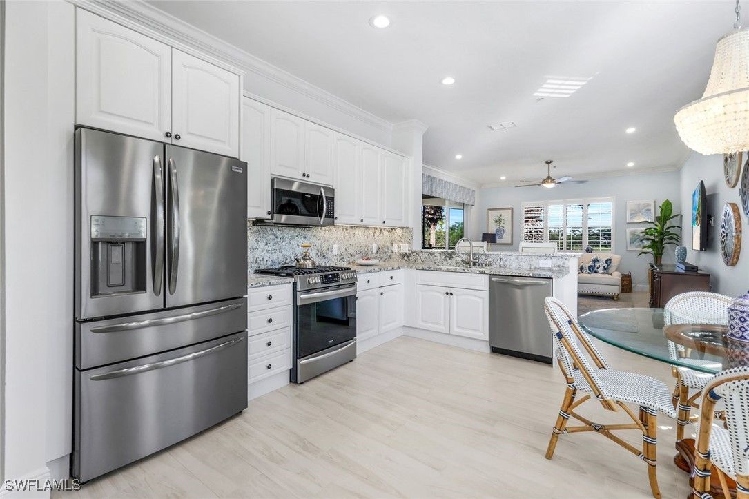 Priced to sell, and absolutely gorgeous!! It’s not often you walk into a home that checks all the boxes, but this beautifully updated 2nd floor end unit coach home in the desirable village of Montreux does indeed! 3 large bedrooms, 3 baths, plus den that can be used as an additional bedroom oozes fresh coastal vibes and a sparkling wide water view on the Rookery golf course that is second to none. 3,029 square feet professionally designed with white wood look porcelain tile planks throughout! Features include: fresh white walls and solid core doors, plantation shutters, custom built-in bar, perfectly scaled, newer air conditioning, tankless water heater, storm screens protecting the expansive private screened lanai, solid cherry white cabinets, spectacular leathered finish granite counters, newer roofs, freshly painted exterior and brand new landscaping currently being installed, create a home that is not only easy to maintain, but one you can enjoy with family and friends this winter season or year round. Large storage closets on both floors with the ability to install an elevator make this home perfect for multi-generational living. Montreux is a short walk or bike ride to the heart of the community, the updated 54,000 sq ft home to the state of the art gym with new equipment, yoga studio, pilates room, 2 resort pools with waterfalls and slides, 2 restaurants, spa services, fitness classes, full time activity staff providing special events and classes year round, tennis, pickle ball and bocce ball. Miles of sidewalks, all underground utilities, lush landscaping, location, modern coastal designed future building, plus the overall design of the community sets Fiddler’s Creek apart from all others and is a gem of south Naples. As if this wasn’t enough, there is also an optional beach and/or marina membership available, an extremely rare opportunity to enjoy the beach club at the Marco Beach Ocean Resort and the Marina on Isles of Capri. If you are a golfer, you are in the right place! The Golf Club at Fiddler’s Creek just re-opened with a total turf renovation, re-designed Arthur Hills greens, amazing practice facility anchored by the brand new spectacular private golf clubhouse. Equity memberships are currently available with no waiting list.
