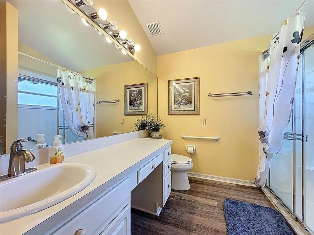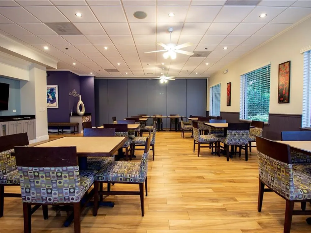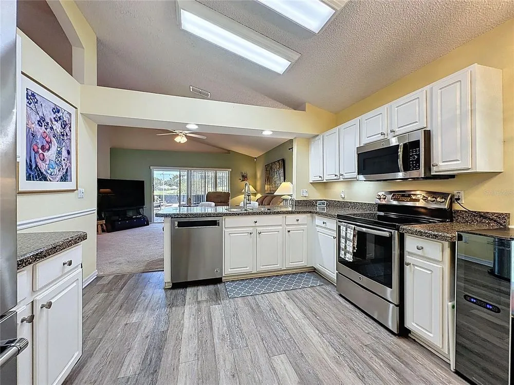 - Cathedral Ceiling(s), Ceiling Fan(s), Eat-in Kitchen, Kitchen/Family Room Combo, L-Shaped Dining Room, Living/Dining Room, Open Floorplan, Main Level Primary, Stone Counters, Thermostat, Walk-In Closet(s), Window Treatments