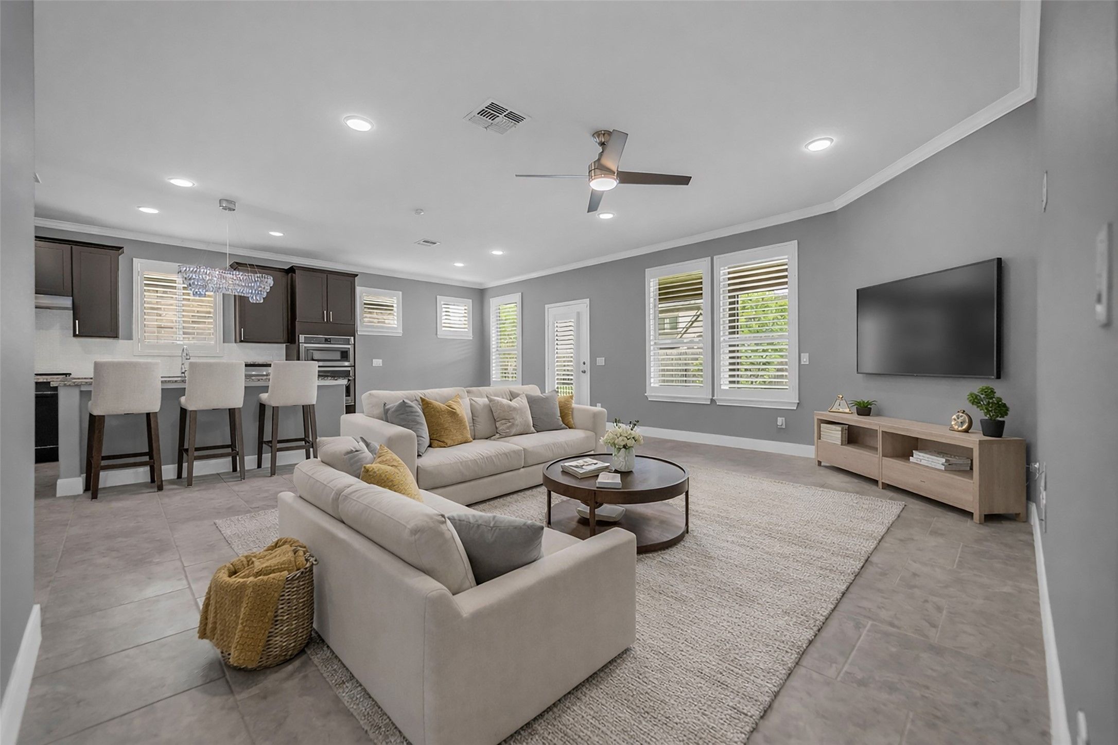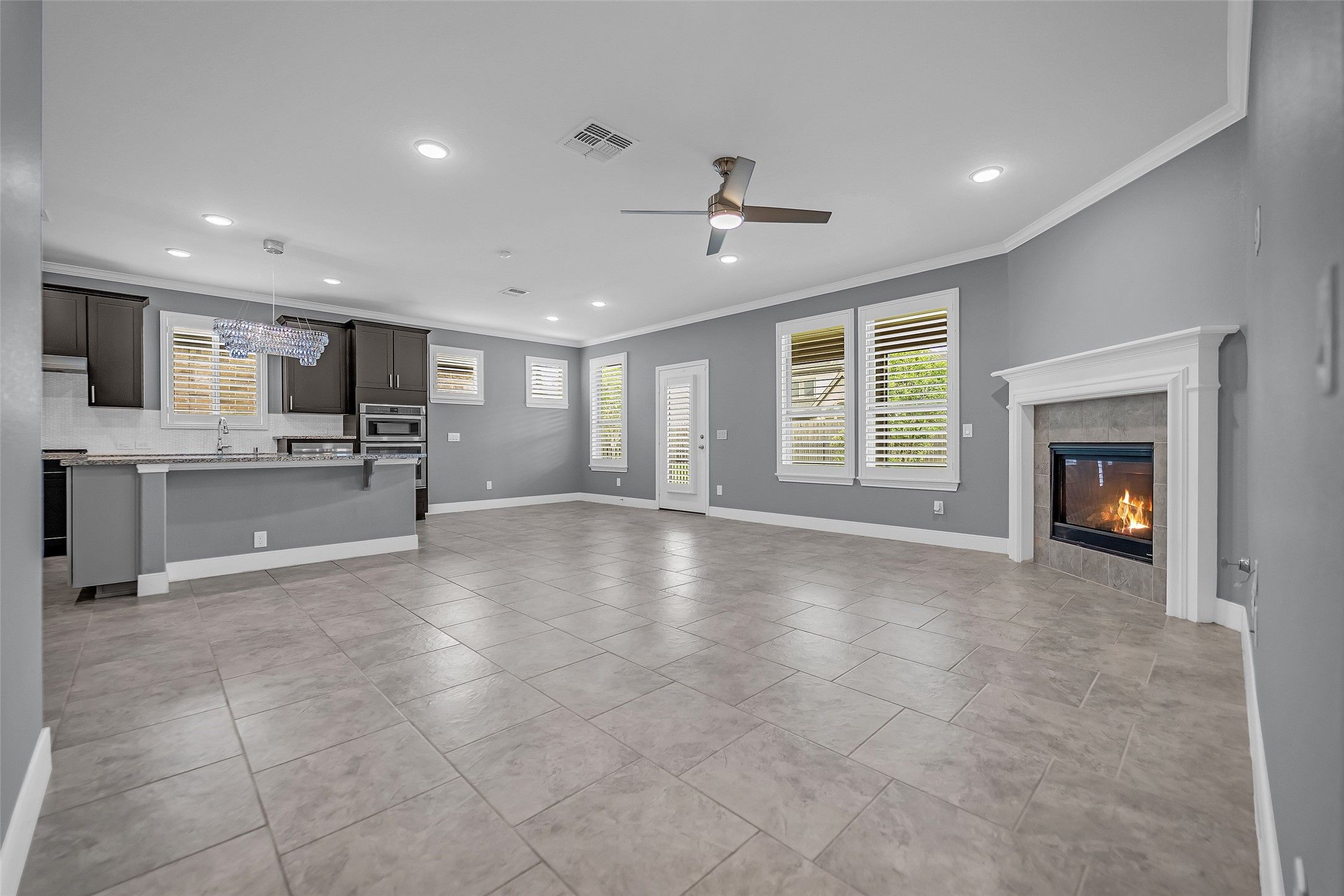 - Breakfast Bar, Crown Molding, Double Vanity, Granite Counters, Handicap Access, High Ceilings, Kitchen Island, Kitchen/Family Room Combo, Pots & Pan Drawers, Pantry, Self-closing Drawers, Tub Shower, Makeup/Vanity Space, Walk-In Pantry, Window Treatments, Ceiling Fan(s), Kitchen/Dining Combo, Programmable Thermostat