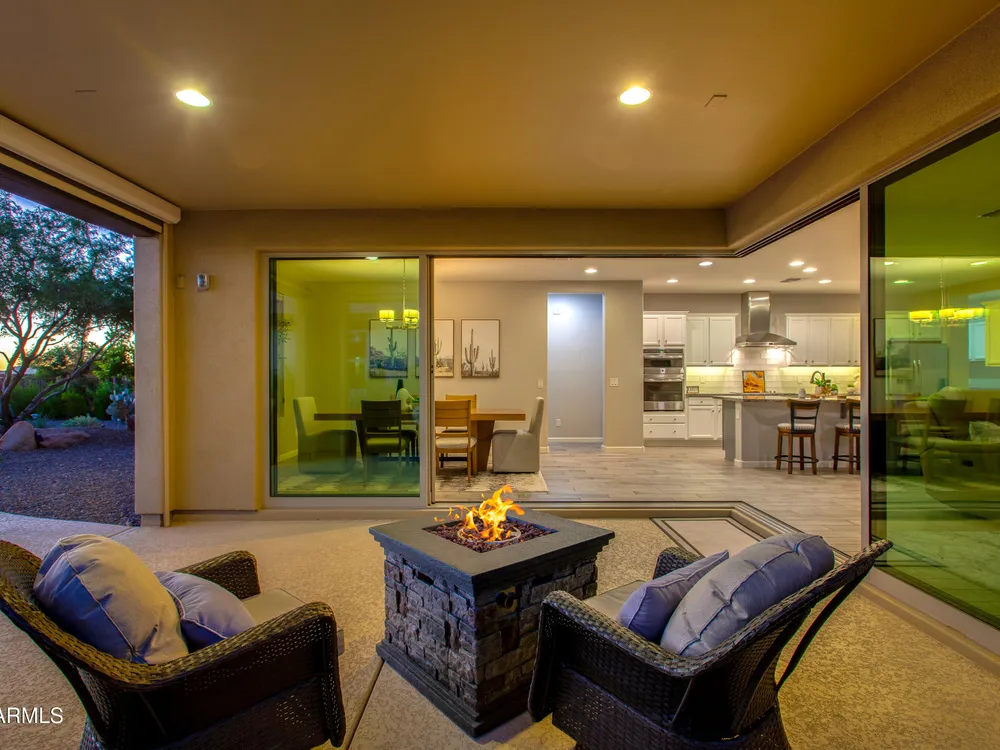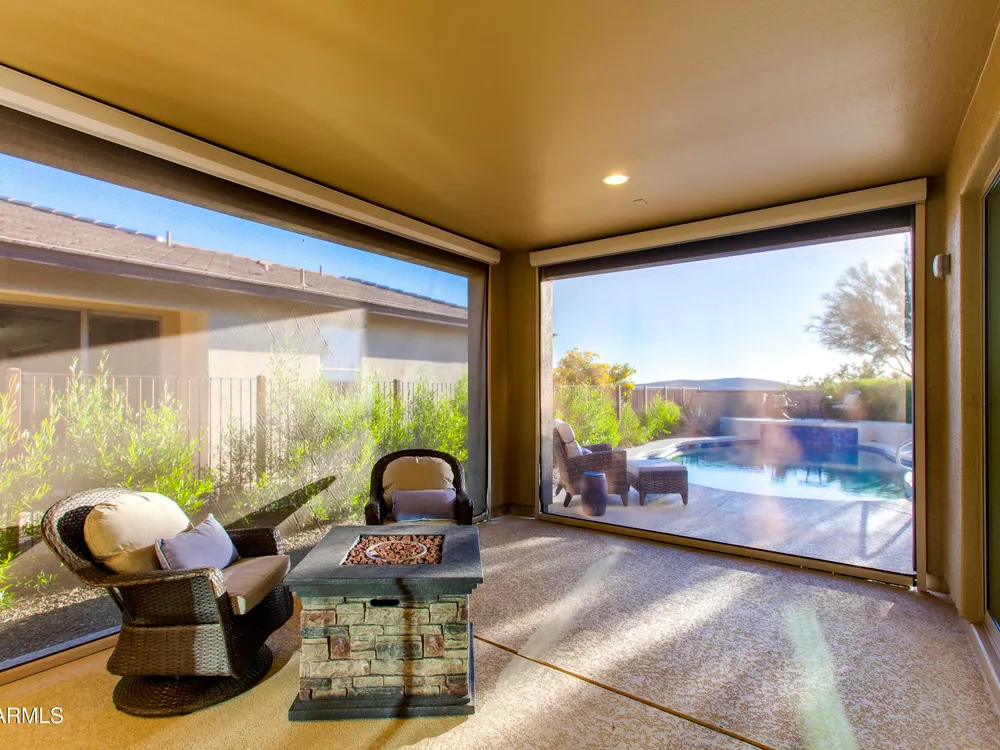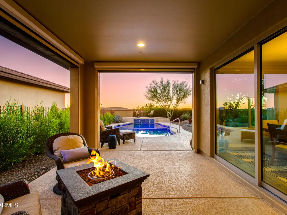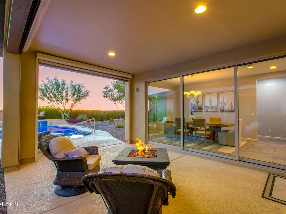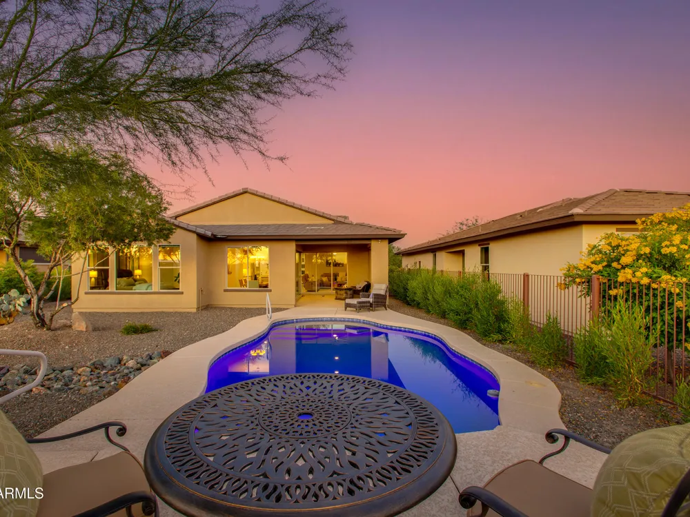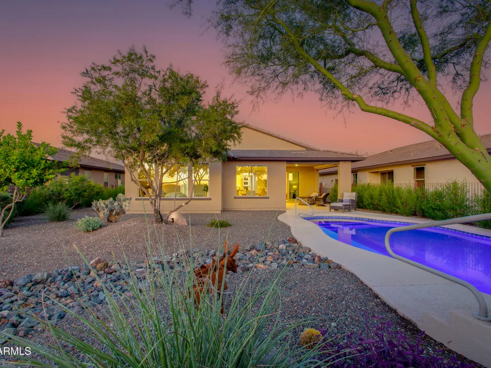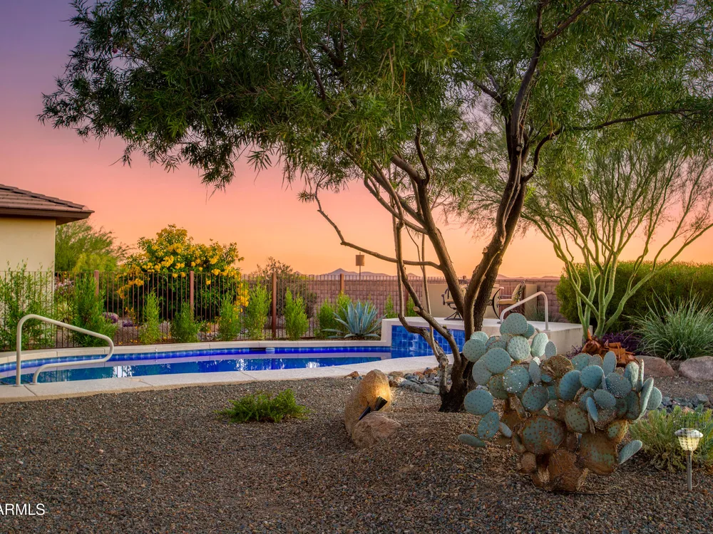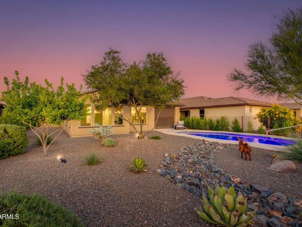 Stunning 2 Bed / 2 Bath | 1,986 Sq Ft | Oversized Homesite Freshly painted interior & brand-new carpet in bedrooms! This home features a sparkling pool, 3-car garage, and custom landscaping on a fully fenced oversized homesite with breathtaking sunset views. Inside, enjoy upgraded granite counters throughout, 8' doors, and a luxurious primary suite with a heavy glass shower enclosure. The open-concept dining and living area showcases a full corner of sliding glass walls, seamlessly blending indoor & outdoor living. Step out to the covered patio with motorized sunshades, creating the perfect extension of your living space. A rare combination of privacy, upgrades, and resort-style comfort.