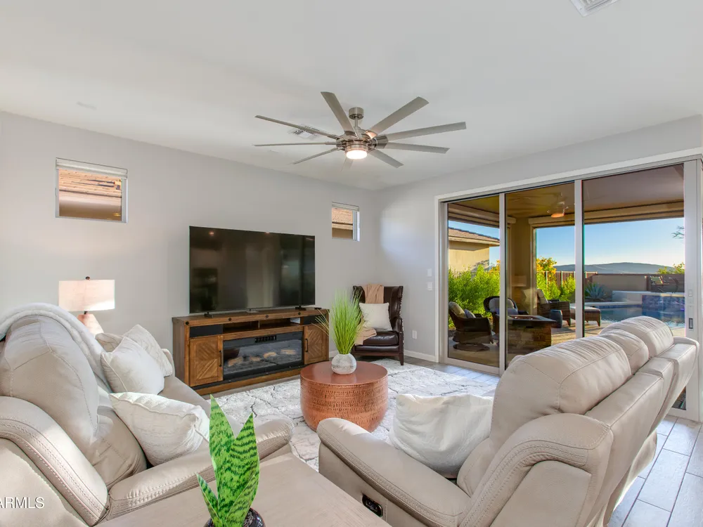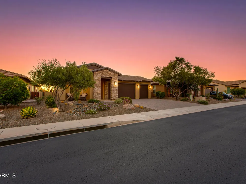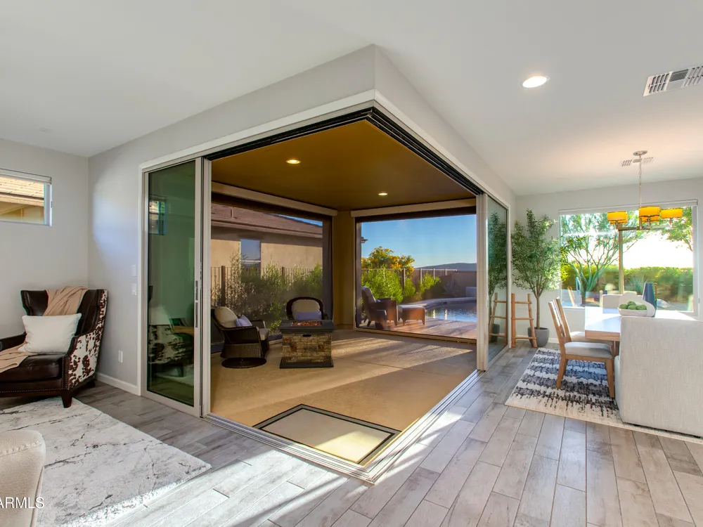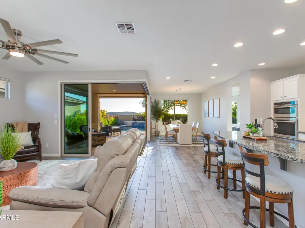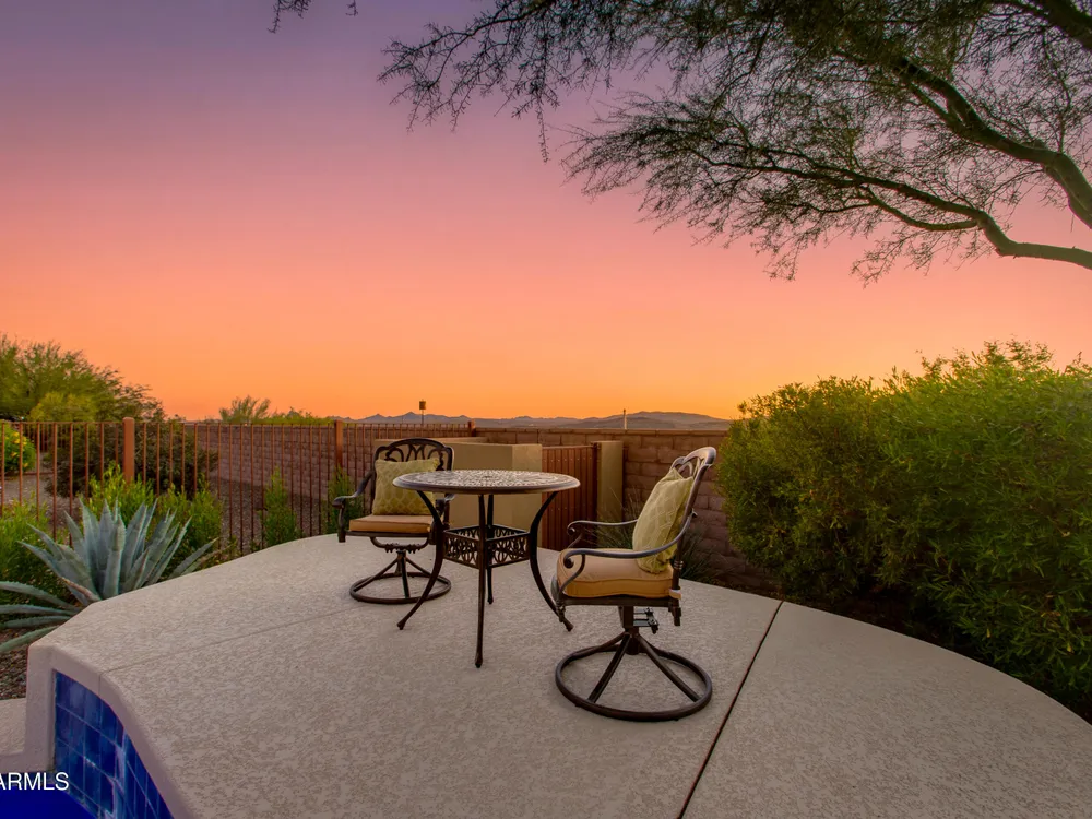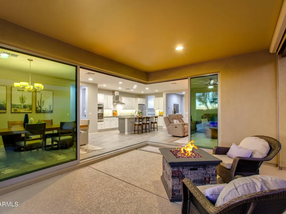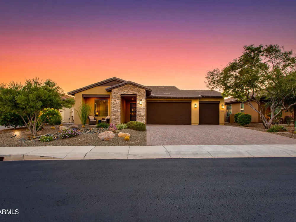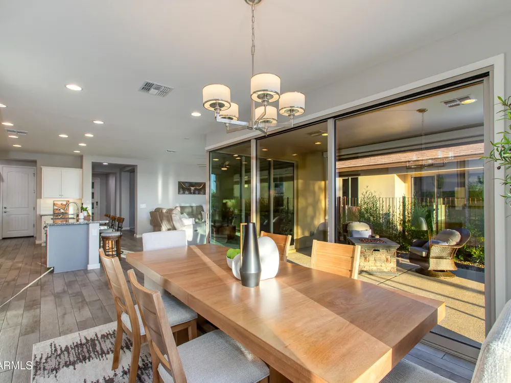 Stunning 2 Bed / 2 Bath | 1,986 Sq Ft | Oversized Homesite Freshly painted interior & brand-new carpet in bedrooms! This home features a sparkling pool, 3-car garage, and custom landscaping on a fully fenced oversized homesite with breathtaking sunset views. Inside, enjoy upgraded granite counters throughout, 8' doors, and a luxurious primary suite with a heavy glass shower enclosure. The open-concept dining and living area showcases a full corner of sliding glass walls, seamlessly blending indoor & outdoor living. Step out to the covered patio with motorized sunshades, creating the perfect extension of your living space. A rare combination of privacy, upgrades, and resort-style comfort.