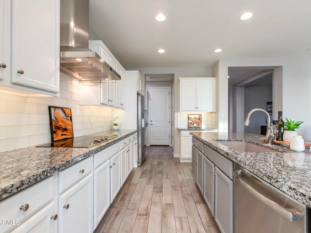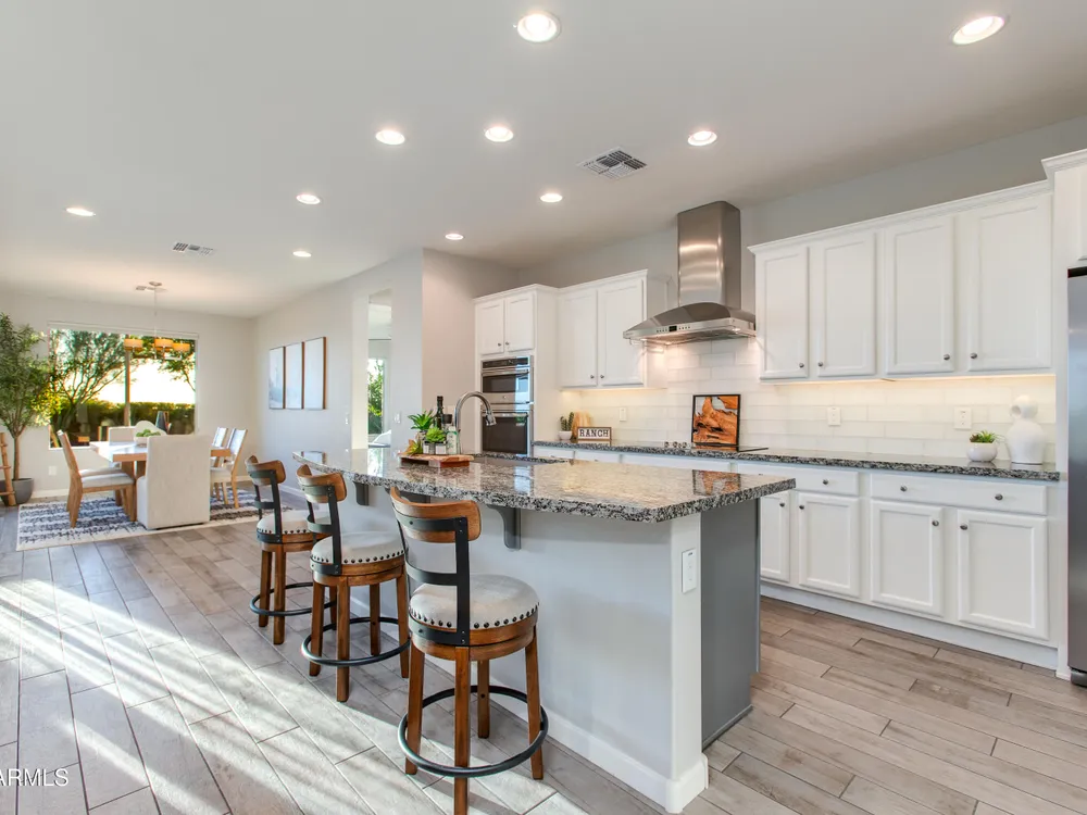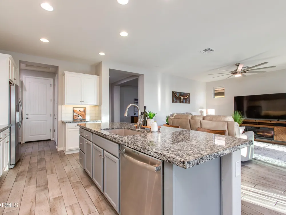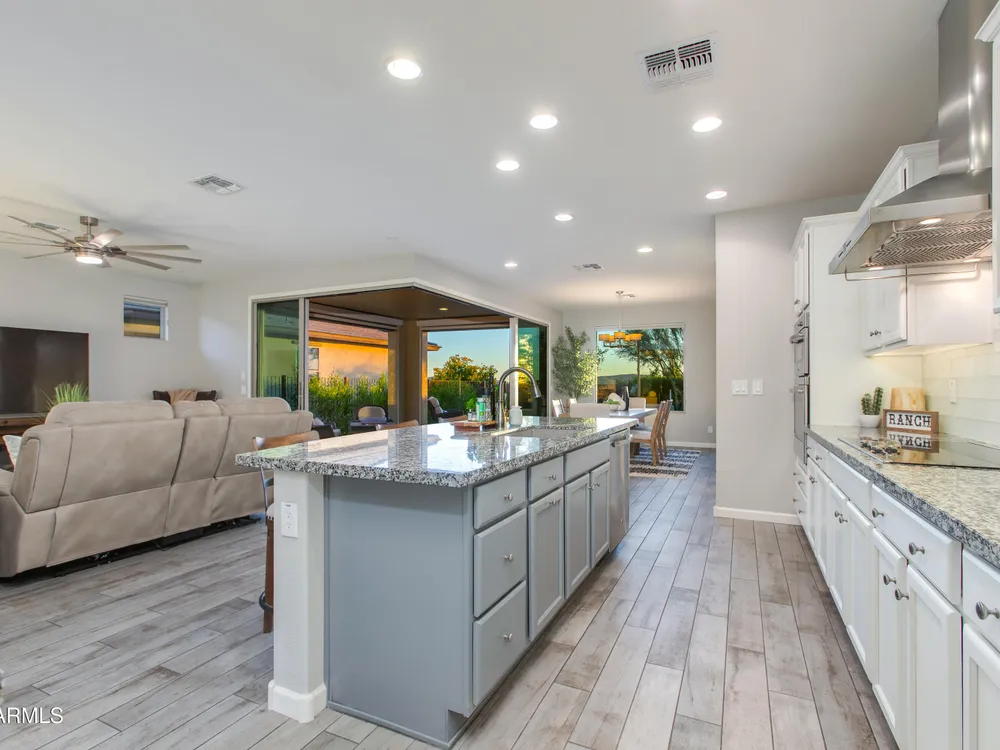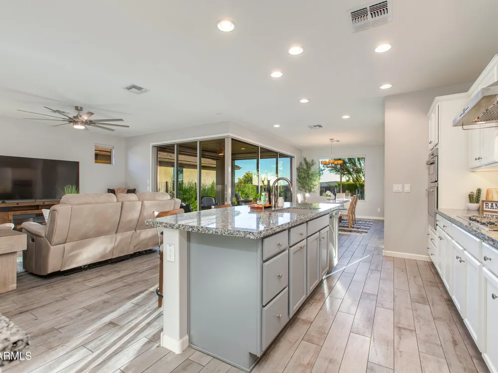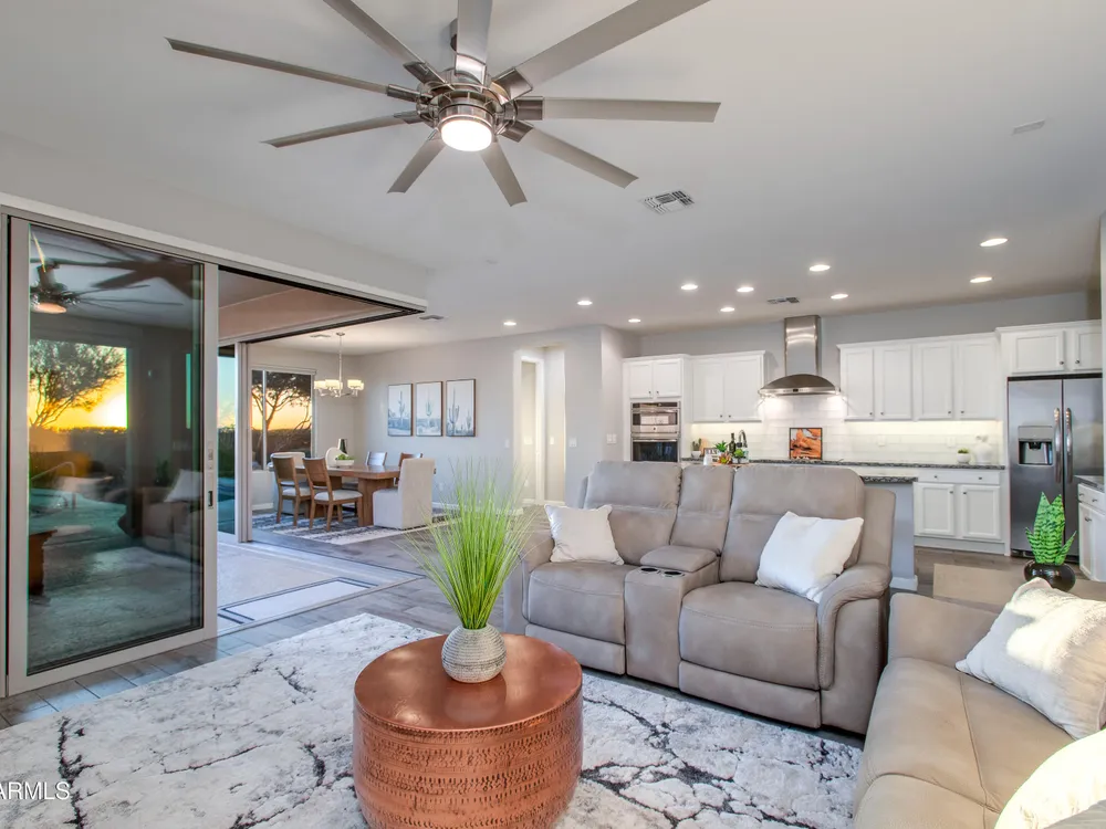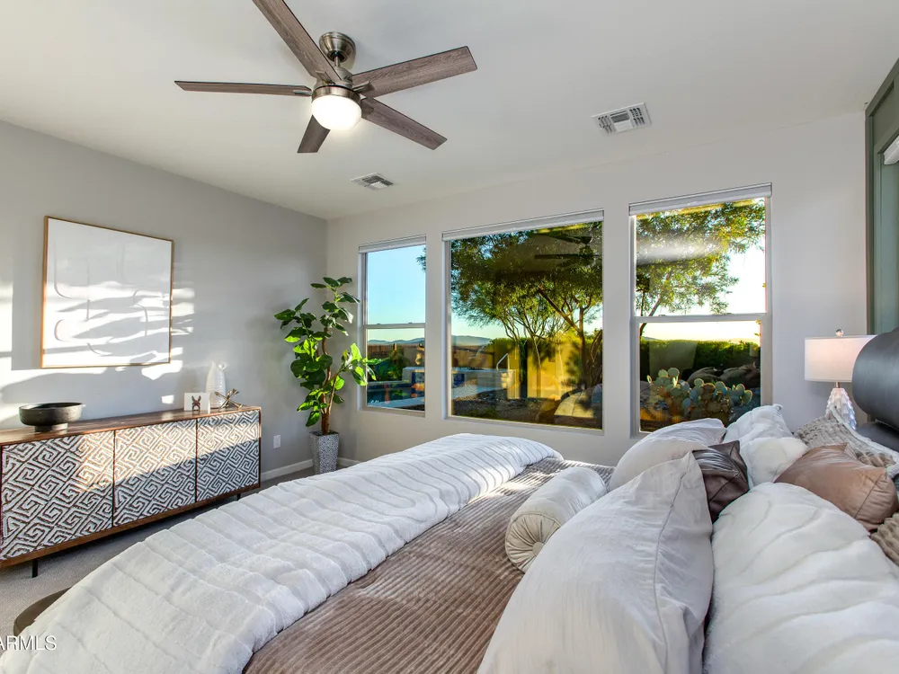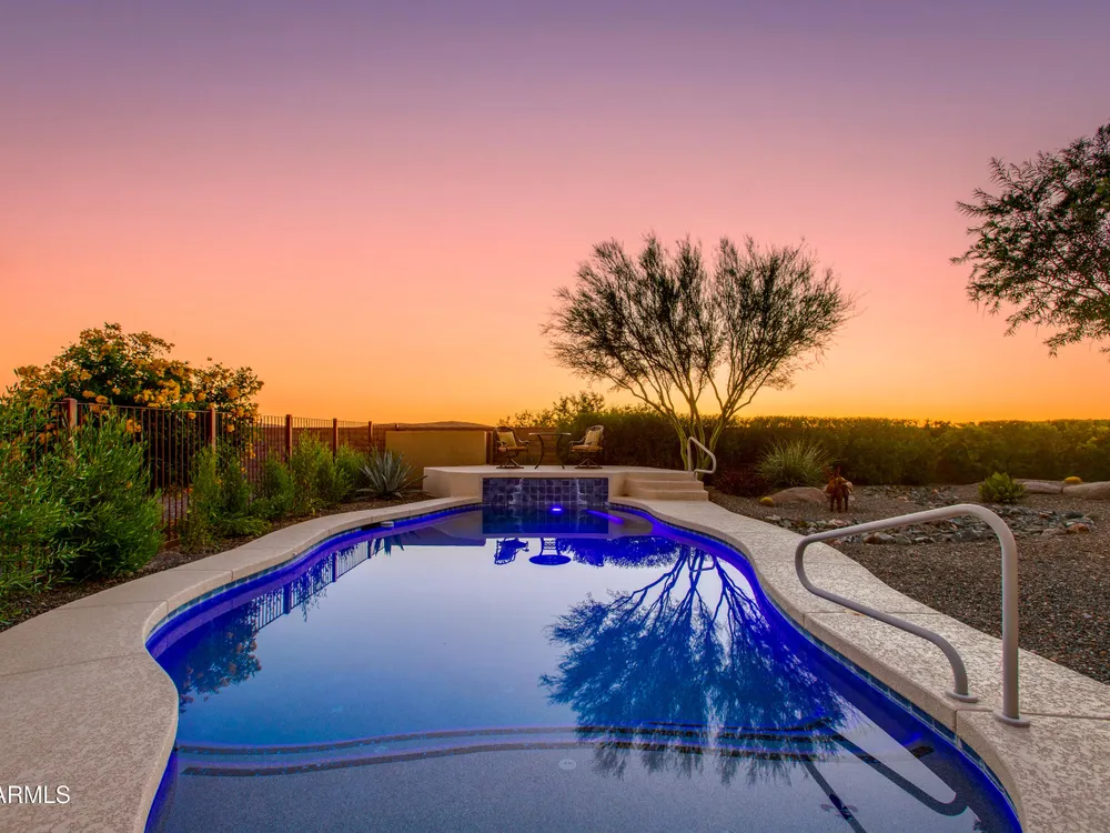 Stunning 2 Bed / 2 Bath | 1,986 Sq Ft | Oversized Homesite Freshly painted interior & brand-new carpet in bedrooms! This home features a sparkling pool, 3-car garage, and custom landscaping on a fully fenced oversized homesite with breathtaking sunset views. Inside, enjoy upgraded granite counters throughout, 8' doors, and a luxurious primary suite with a heavy glass shower enclosure. The open-concept dining and living area showcases a full corner of sliding glass walls, seamlessly blending indoor & outdoor living. Step out to the covered patio with motorized sunshades, creating the perfect extension of your living space. A rare combination of privacy, upgrades, and resort-style comfort.