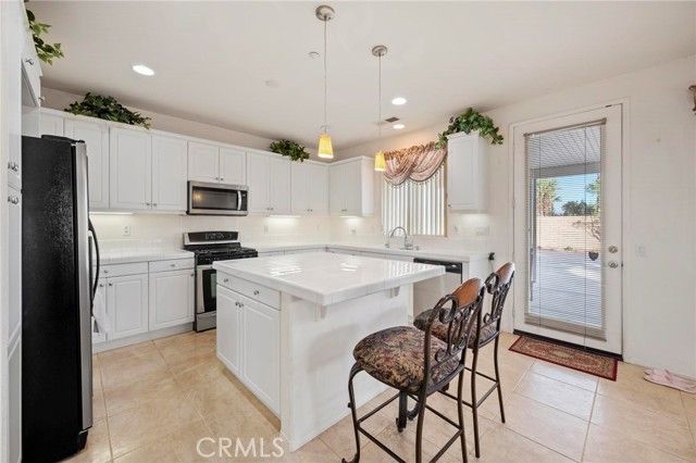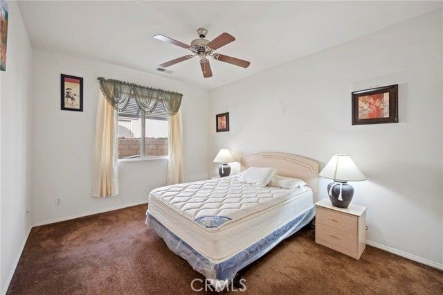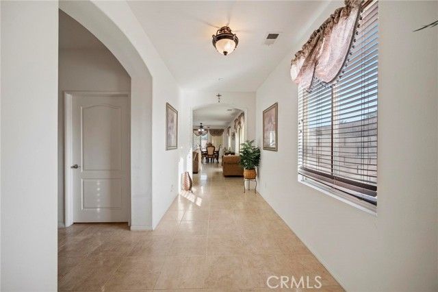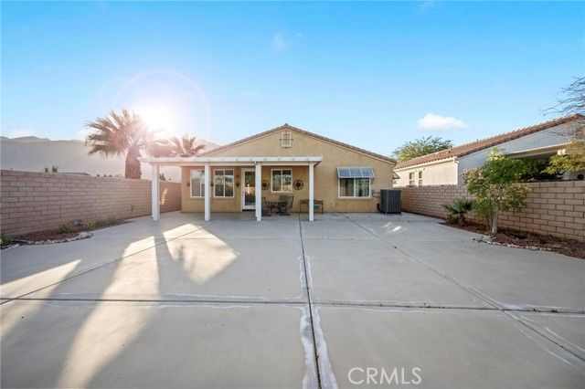 Discover serene desert living in this single-family residence located within a private gated 55+ community. This home is situated on a quiet corner lot and features low-maintenance desert landscaping with breathtaking mountain views. Inside, the inviting open floor plan is defined by elegant arched corridors and durable tile flooring throughout the living areas. The main living and dining space offers a cozy corner fireplace, perfect for everyday comfort. The functional kitchen features white cabinetry, a large center island, and Whirlpool appliances. The layout includes a third bedroom with a large arched window, serving as an ideal home office. The primary suite provides a private retreat with dual vanities, a separate soaking tub and shower, and two spacious walk-in closets. Outdoor living is simplified with a spacious concrete backyard and a covered patio for shaded relaxation. Residents enjoy access to a community pool and spa, and the community grounds are beautifully landscaped and well-maintained. Additional features include a dedicated laundry room with a utility sink and a finished 2-car garage. Recent updates include a new HVAC system, water heater, and garage door with motor, offering added peace of mind for years to come. This move-in-ready property is where low-maintenance living and resort-style comfort finally come together.