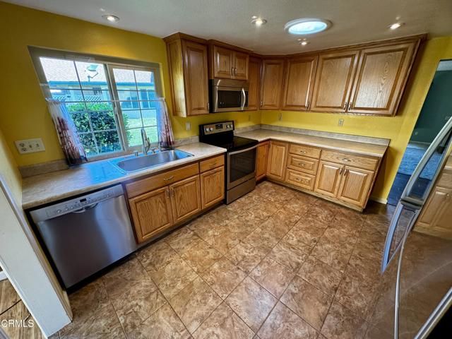 This stunning Brentwood home in Leisure Village offers beautiful views from every room and thoughtful upgrades throughout. Enjoy low utility bills with owned solar panels and added natural light from three solar tubes - two of which feature automatic night lighting.The kitchen has been completely remodeled and features recessed lighting, a spacious pantry with pull-out shelves, and abundant cabinet and counter space. Additional improvements include dual-pane windows, a new water heater and attic insulation (2025), and an updated HVAC system with new ducting (2013). Both bathrooms have been tastefully remodeled, and the decorator paint colors make this home truly move-in ready. The bonus room includes its own heating and cooling system while ceiling fans in the bedrooms and dining area provide extra comfort.This home combines energy efficiency, style, and comfort- all in the desirable Leisure Village community of Camarillo.
