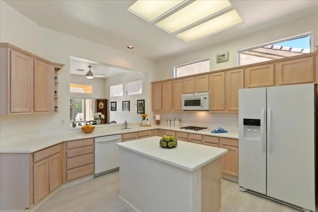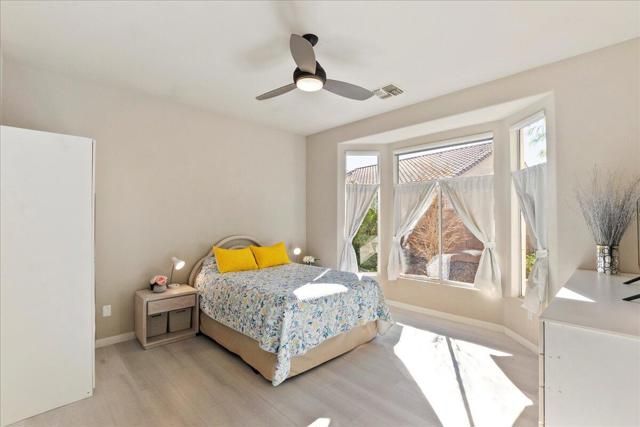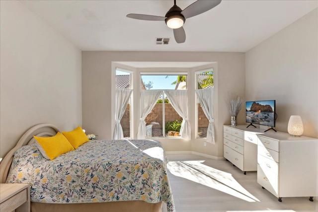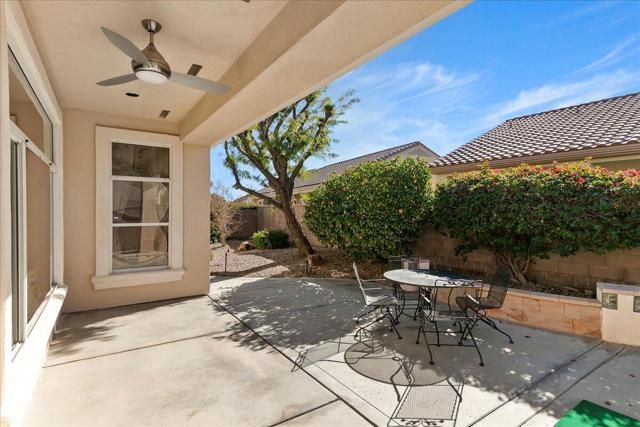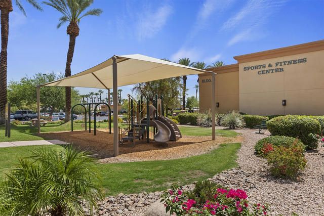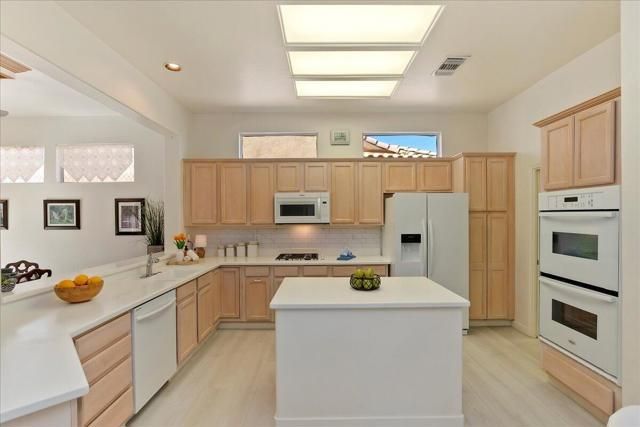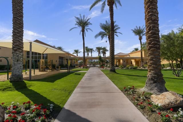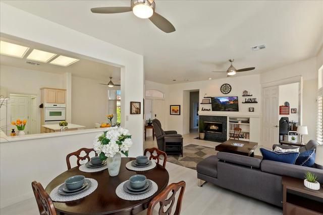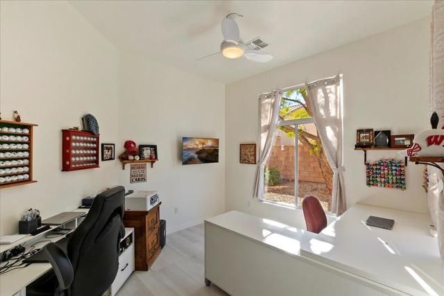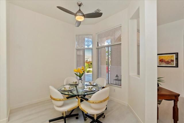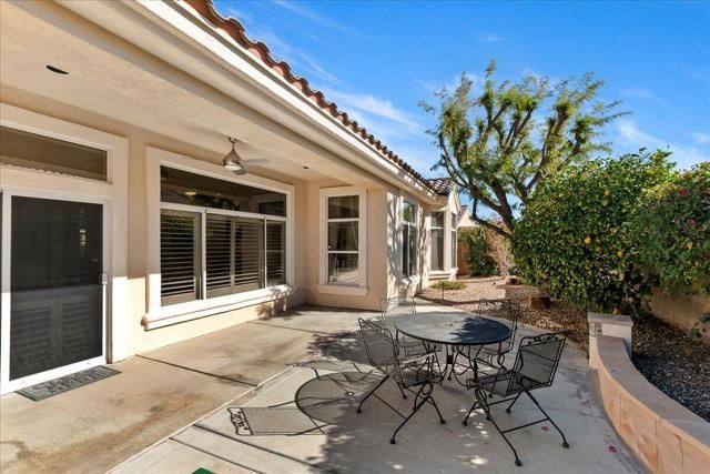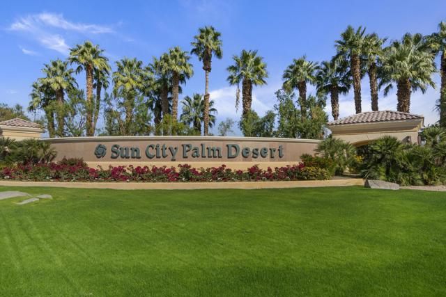 Welcome to the Coachella Valleys most prestigious 55+ active adult communities. Sun City is perhaps one of the most beautiful communities in the CV, with lakes, flowing water features, green belts, fairways, beautiful flowers & swaying palm trees in every direction you look. There is no shortage of activities, whether you enjoy golf, swimming, playing tennis, pickle ball or bocce ball, there's something for everyone. This popular Morocco plan has 2 beds 2 baths is light & bright & features 1622 sf, with newer gray tone laminate flooring that flows seamlessly throughout the home. Double doors flank the den/office space for privacy or for occasional guests. The primary en-suite features a large bathroom with double sinks, step-in shower, water closet & a generous walk-in closet. The guest bathroom features a step-in tub for when you just want to relax after a long day of golf. The kitchen features corian countertops, an island, a breakfast nook which looks out into the large semi-private courtyard, double ovens, gas cooktop, new fridge in 2024 & microwave 2023. There's a slider off of the dining area which leads you to the lovely backyard, with a covered patio & an extended patio area which is great for BBQing or dining al fresco with friends & family. There are 2 thriving fruit trees which produce loads of Meyer lemons and juicy oranges. The 2 car garage has a small work area & enough room to park your golf cart. The owners replaced the AC & furnace in 2023 & installed 7 Minka-aire ceiling fans with remotes throughout the home. Buyers to pay 1 time HOA reserve replenishment assessment of $2652.