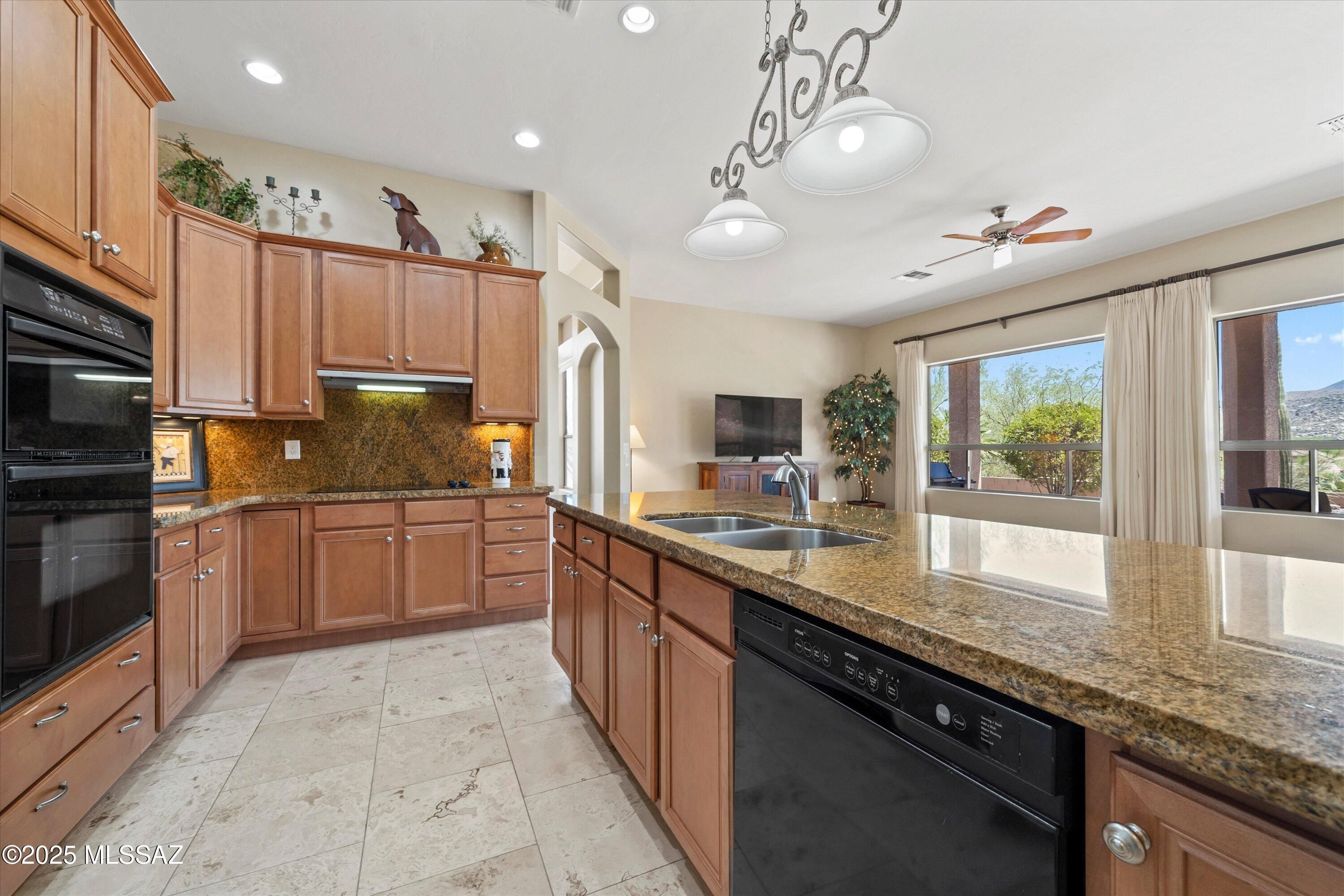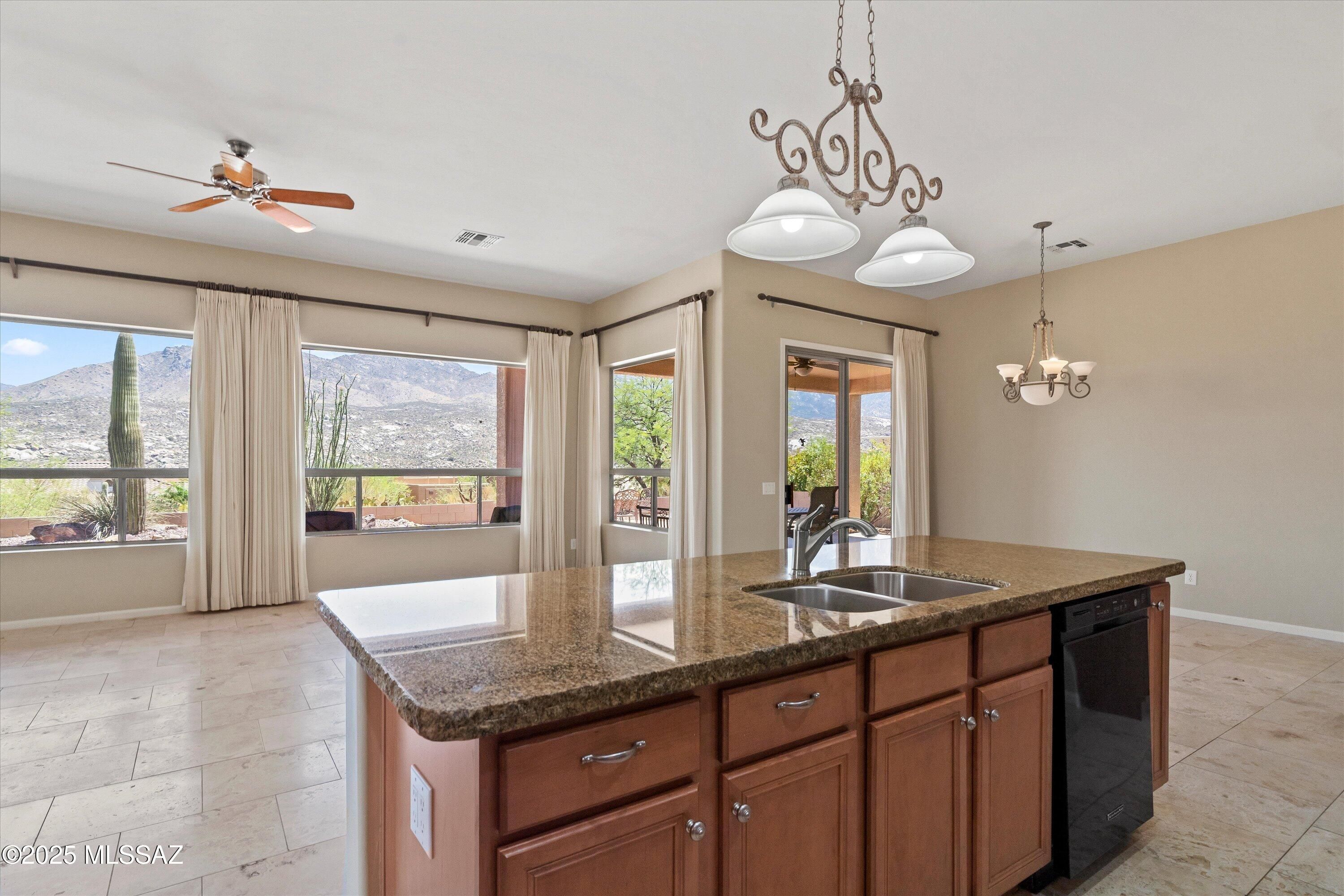 This spacious Sundance model offers impressive Catalina Mountain views. Enter through double doors into an elegant home highlighted by a dramatic staircase. The gathering room flows into a formal dining area featuring a semi-circle of windows designed to capture panoramic vistas. The kitchen is open to the family room, which benefits from large windows framing striking mountain scenery. The owners' suite is generously sized and includes a sitting area with views, an ensuite bathroom with a walk-in shower, double vanity, ample closet space, and extensive built-in cabinetry. Upstairs, the Casita contains two spacious bedrooms separated by a Jack and Jill bath, ensuring privacy for guests. Additional features include a conveniently located den, full hallway bathroom, and a three-car garage.