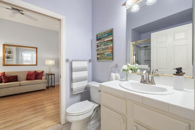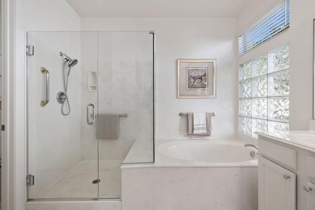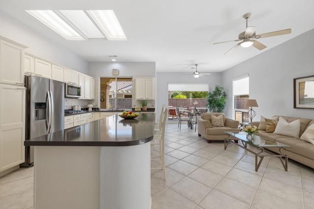 Located in the best 55+ community in the valley, Sun City Palm Desert, the Monaco is one of the most popular models. With 3 bedrooms, 3 baths, a formal living/dining room, and a family room open to the kitchen. It is perfect for entertaining. As you enter the tropical gated courtyard and into the home, you are awe-inspired by the sparkling lap pool/spa, and the extended north-facing backyard patio, perfect for afternoon BBQs. The upgraded kitchen has stainless appliances, white cabinets, a skylight, and it opens to the family room and kitchenette area. The master bedroom views the pool, and the ensuite bathroom has a double vanity, a private toilet room, a walk-in closet, a walk-in shower, and a soaking tub. The extended guest bedroom is huge, with its own ensuite bathroom, and can be used as an office, hobby room, or private guest bedroom. The extended den/bedroom has a full bathroom attached, and a beautiful built-in double office desk, and plenty of shelving. The laundry room has storage of cabinets, an extra fridge, and the washer and dryer are included. The extended garage has a golf cart garage, storage cabinets, and a NEWER HVAC unit. There are motorized shades in the living room, dining room and front door. This home is the perfect year-round retreat.