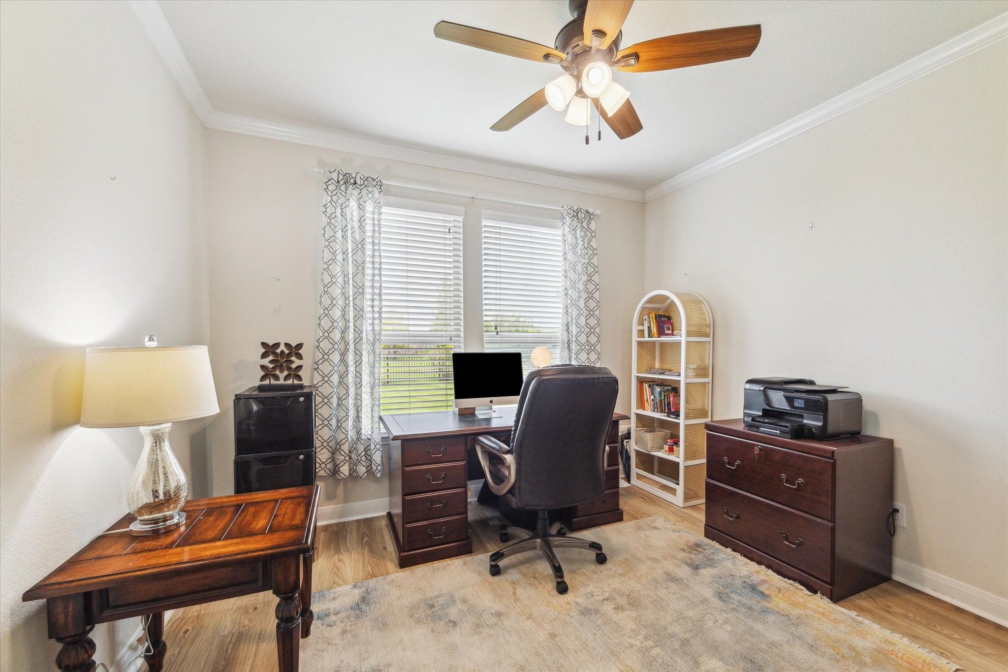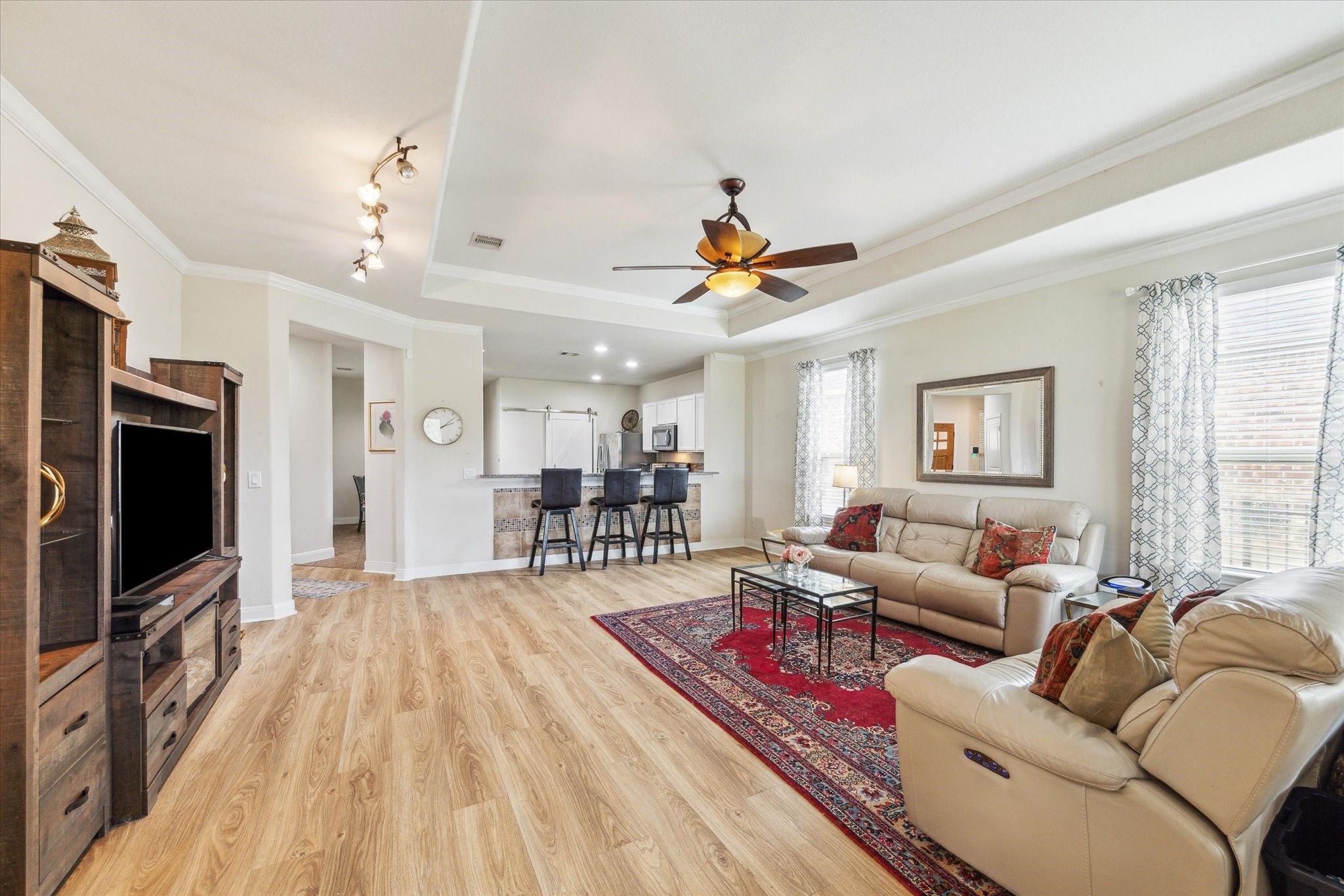 - Breakfast Bar, Crown Molding, Double Vanity, High Ceilings, Kitchen Island, Kitchen/Family Room Combo, Tub Shower, Window Treatments, Ceiling Fan(s), Programmable Thermostat