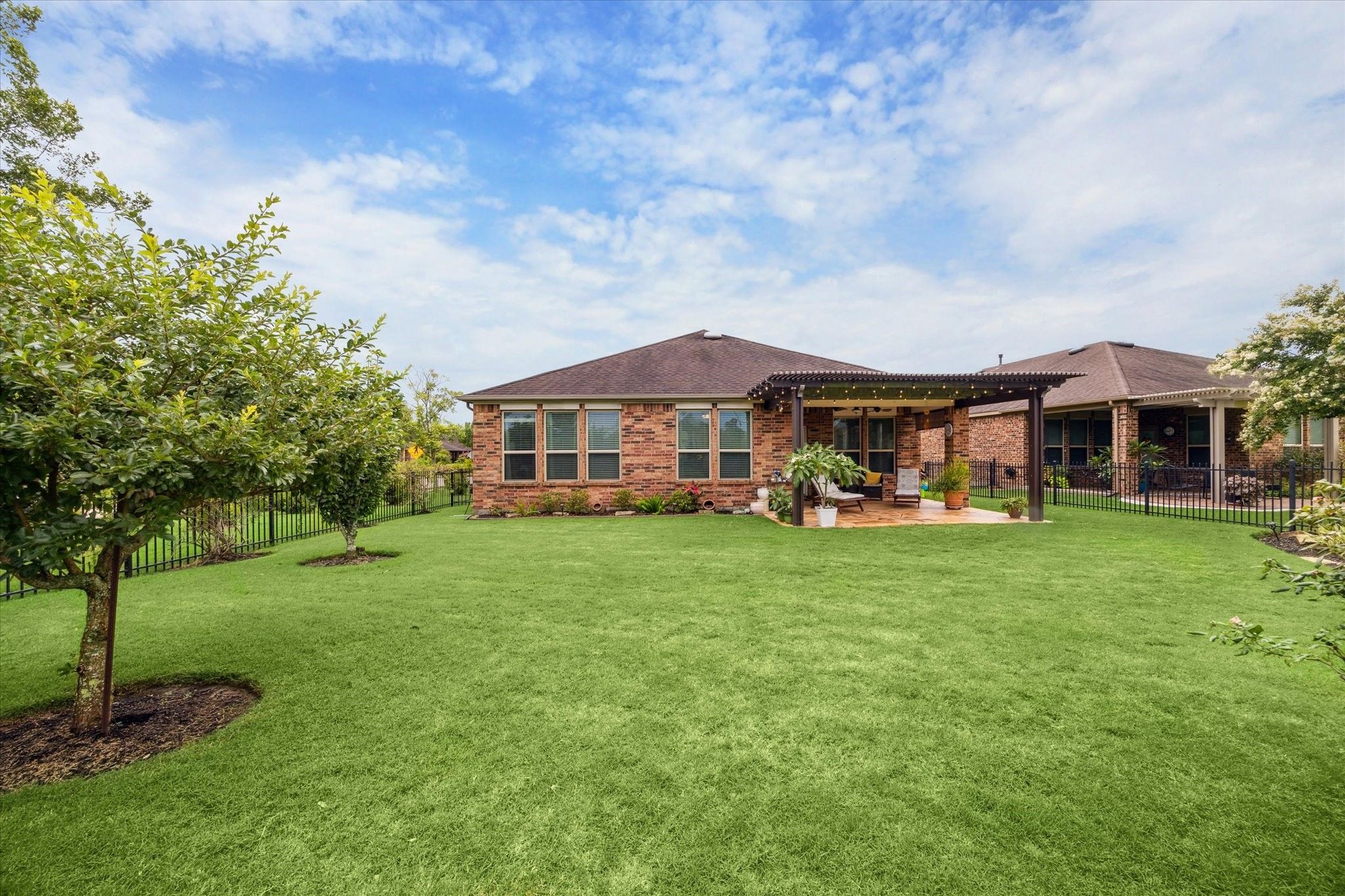 Welcome to this beautiful 2-bedroom, 2-bathroom home located in the sought-after 55+ community of Del Webb in Richmond. Situated on a desirable corner lot with no back neighbors, this home offers privacy and plenty of outdoor space. The spacious kitchen features granite countertops, stainless steel appliances, a center island, and a charming barn door pantry. Enjoy seamless indoor-outdoor living with an extended covered patio perfect for relaxing or entertaining. The meticulously landscaped backyard is a peaceful retreat with mature trees and a wrought iron fence overlooking green space. This home blends comfort, functionality, and community living at its best