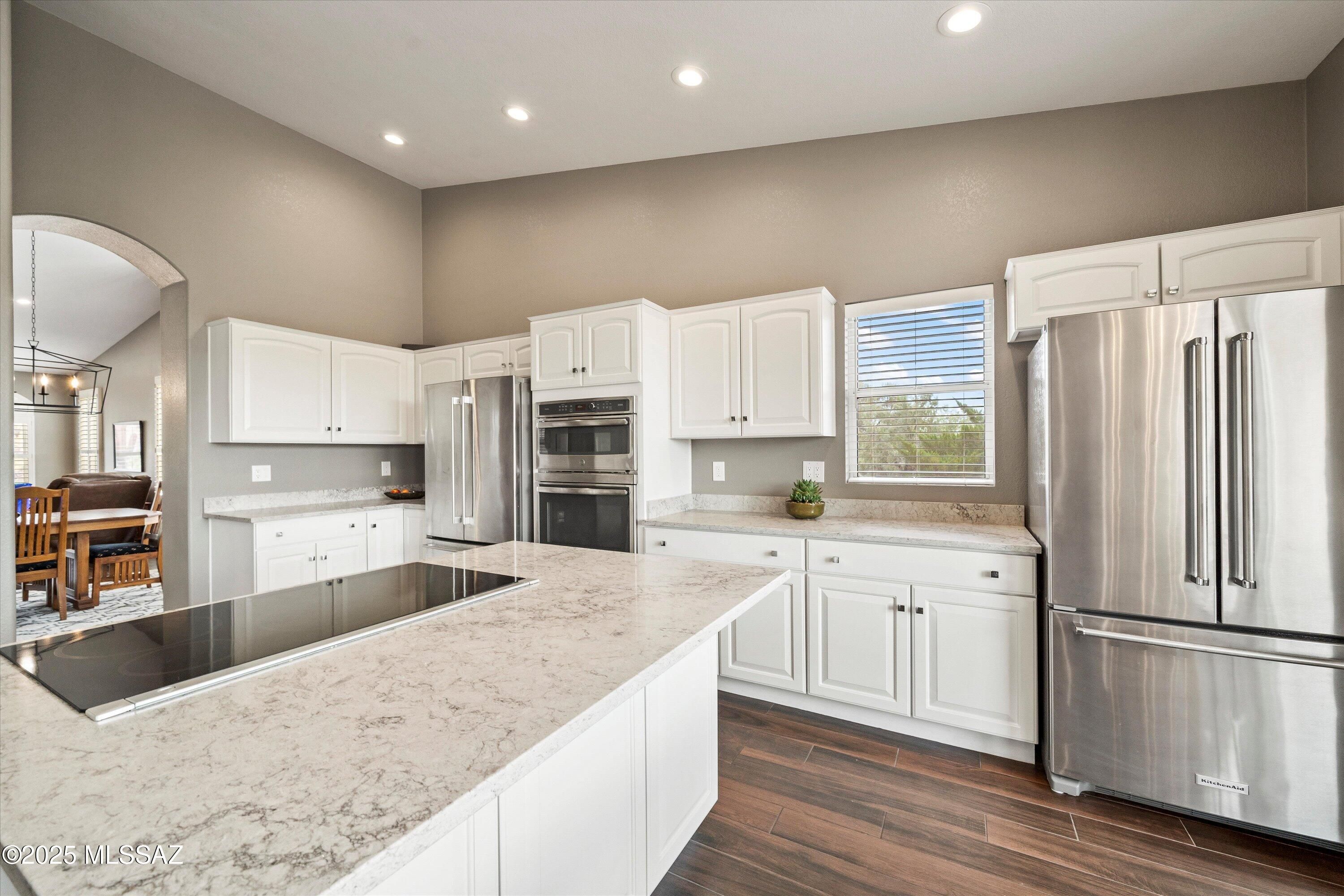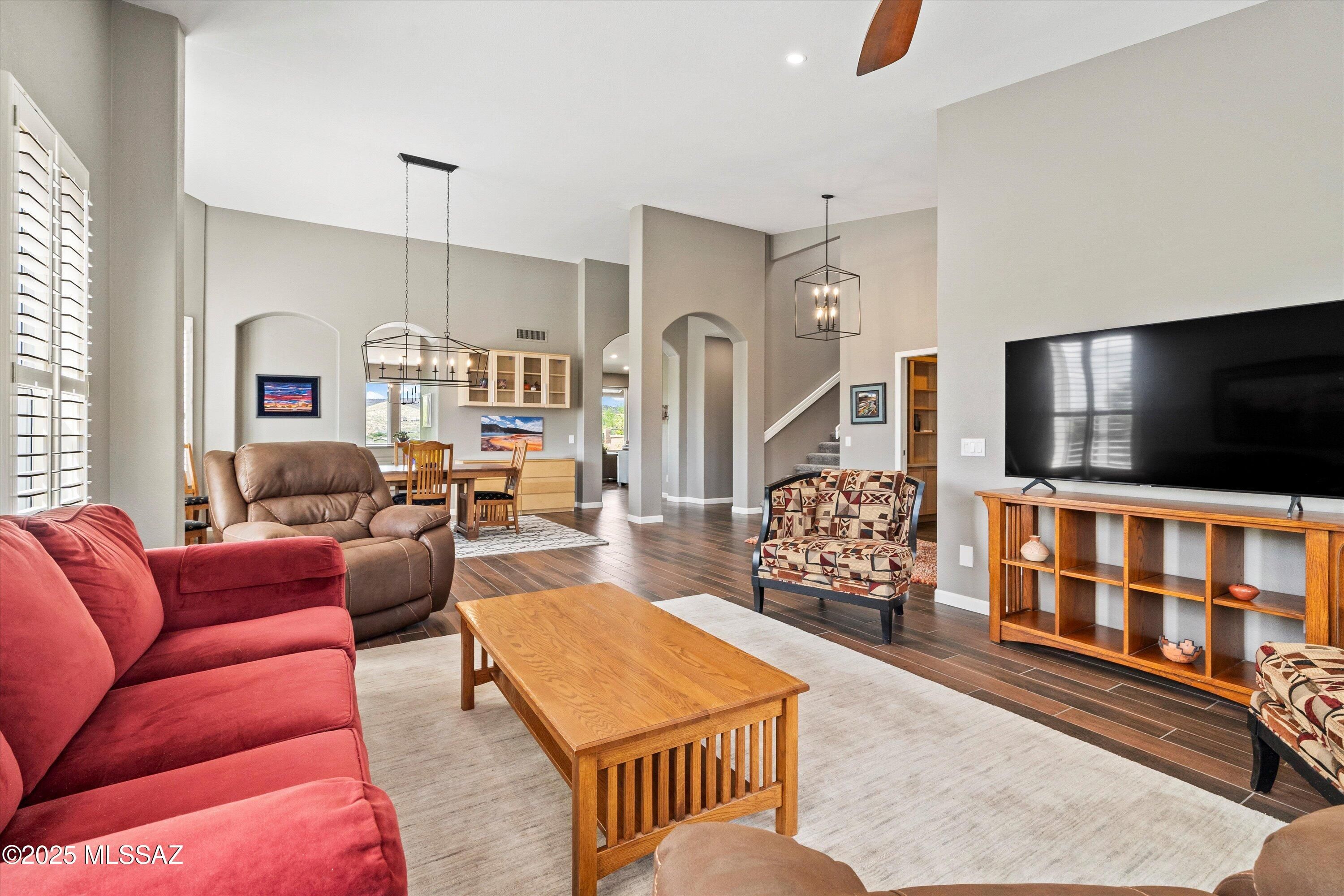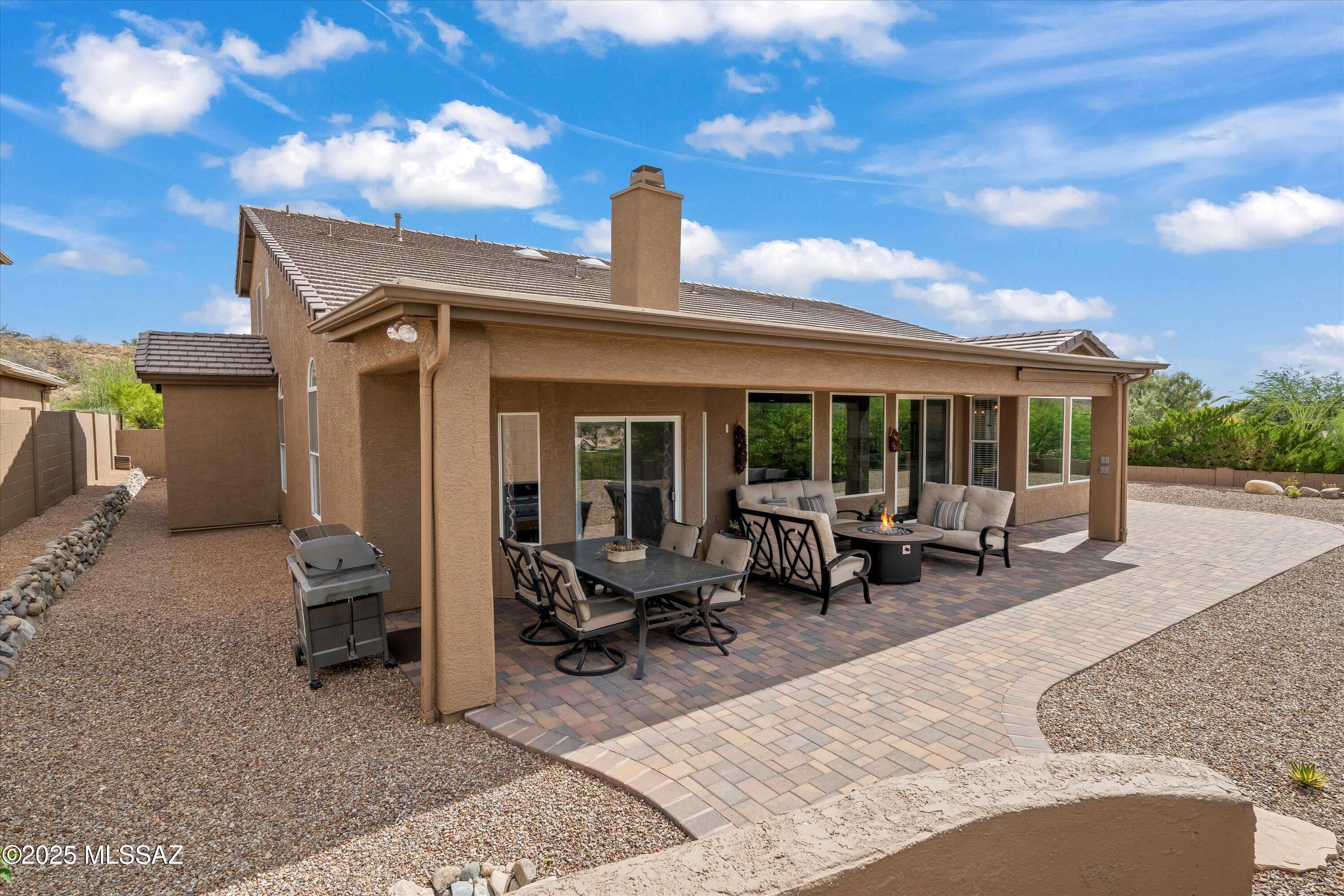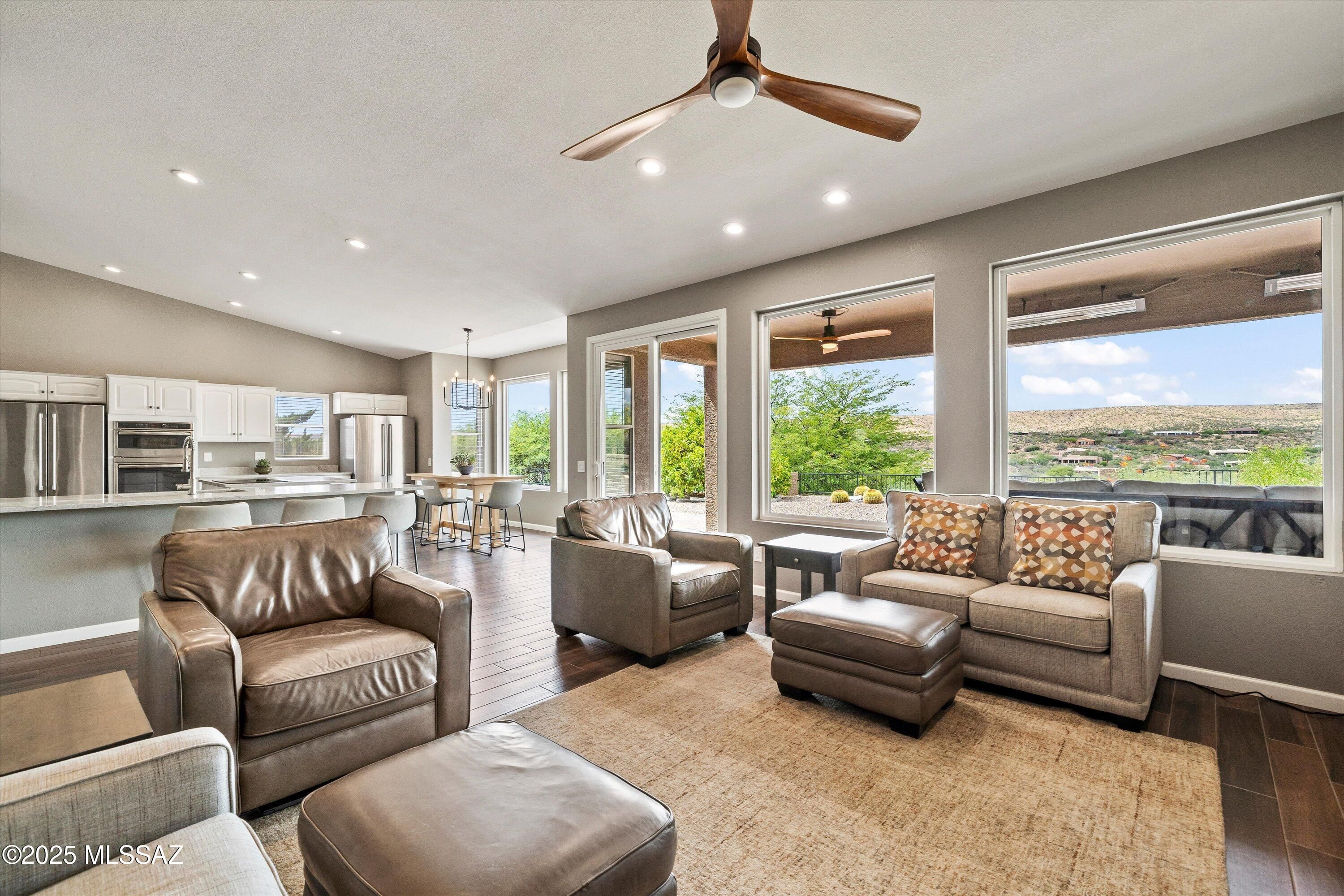 This beautifully renovated and upgraded Galleria model is ready for move-in. The double door entry leads to an inviting neutral color palette that enhances the spacious gathering and formal dining room. The island kitchen maximizes the open floorplan, offering ample cabinetry, two refrigerators, an induction cooktop, and views of the yard and surrounding open space. The expansive family room features a stacked stone fireplace, providing warmth during cool SaddleBrooke evenings. The owner's retreat includes a sitting area and an en-suite with double vanity, a walk-in shower, and double closets. Upstairs Casita offers two bedrooms and a bath, ensuring privacy and comfort for guests. Additional highlights include a convenient full bath in hallway, 4th bedroom downstairs, a den/office,
