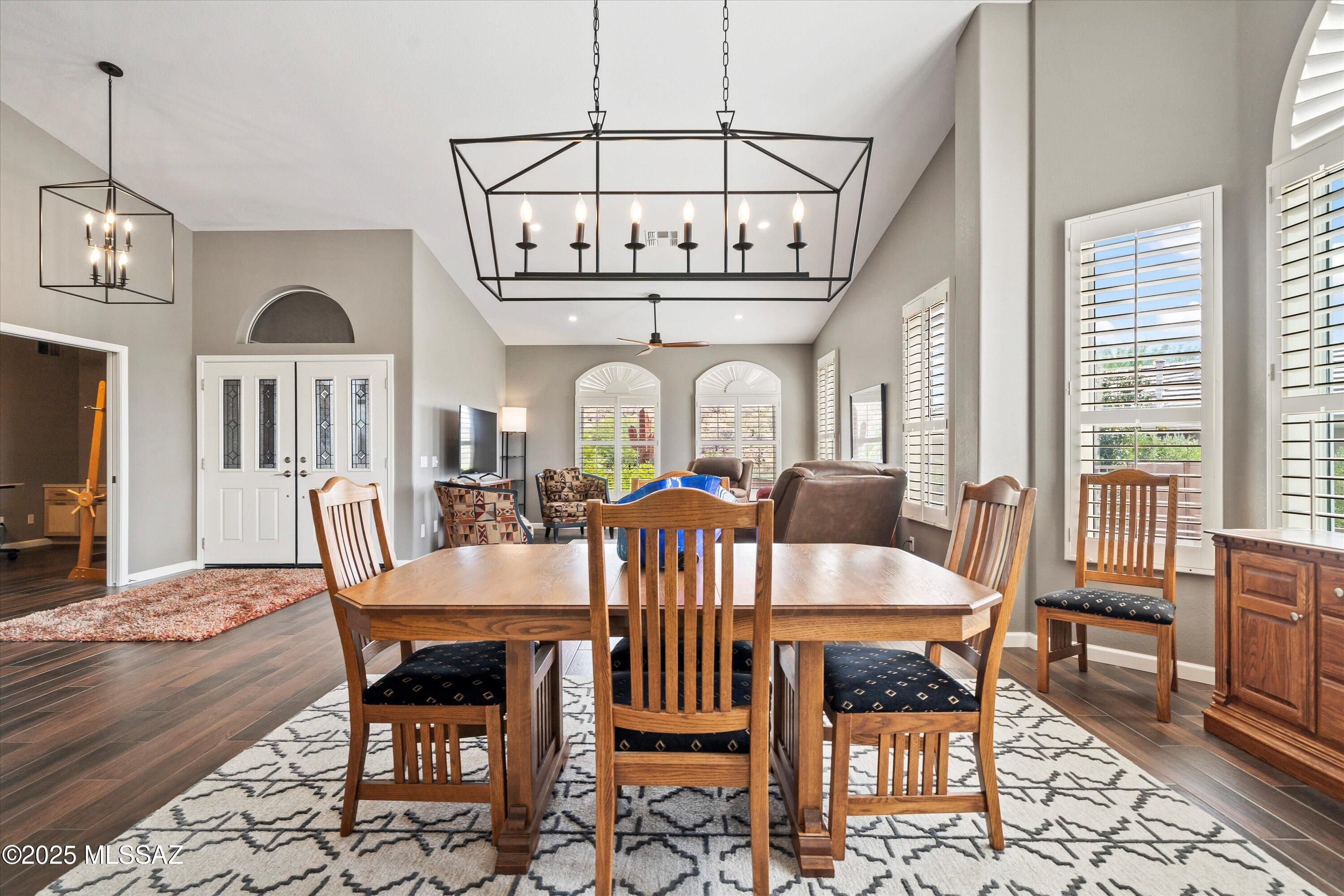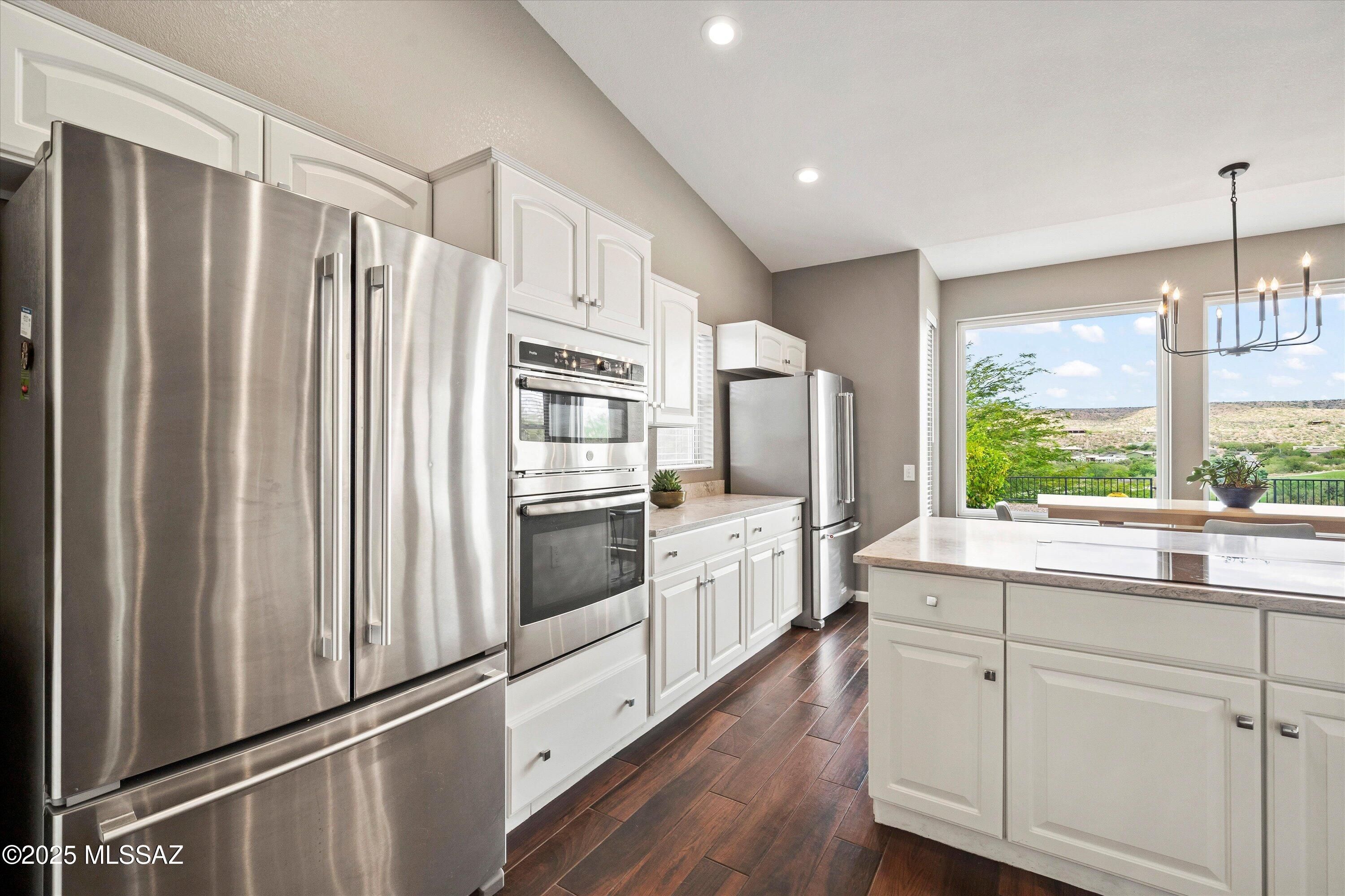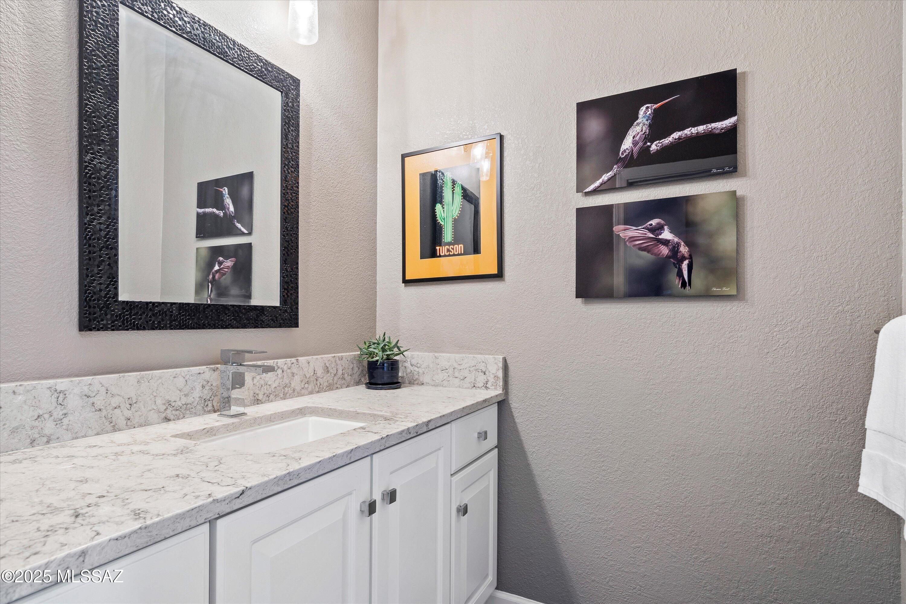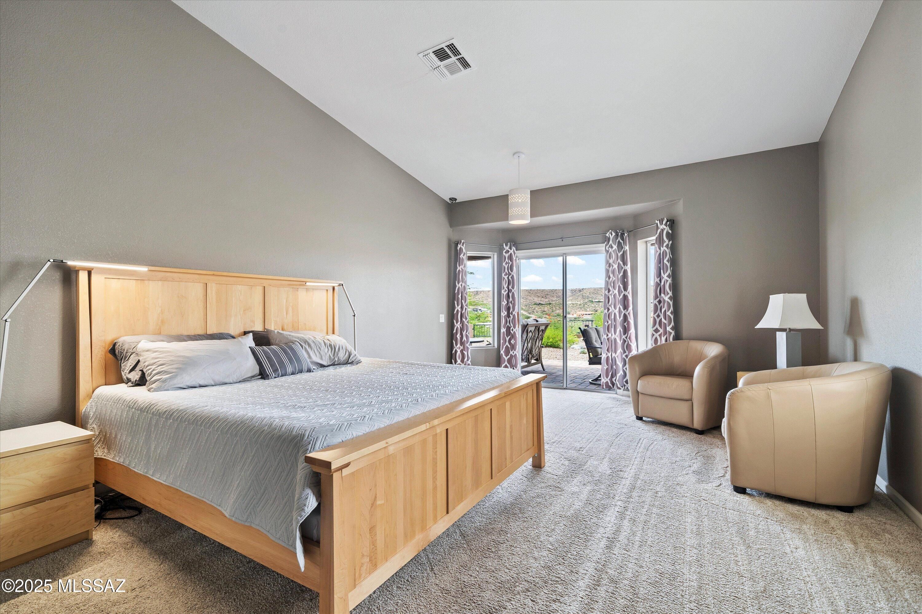 This beautifully renovated and upgraded Galleria model is ready for move-in. The double door entry leads to an inviting neutral color palette that enhances the spacious gathering and formal dining room. The island kitchen maximizes the open floorplan, offering ample cabinetry, two refrigerators, an induction cooktop, and views of the yard and surrounding open space. The expansive family room features a stacked stone fireplace, providing warmth during cool SaddleBrooke evenings. The owner's retreat includes a sitting area and an en-suite with double vanity, a walk-in shower, and double closets. Upstairs Casita offers two bedrooms and a bath, ensuring privacy and comfort for guests. Additional highlights include a convenient full bath in hallway, 4th bedroom downstairs, a den/office,