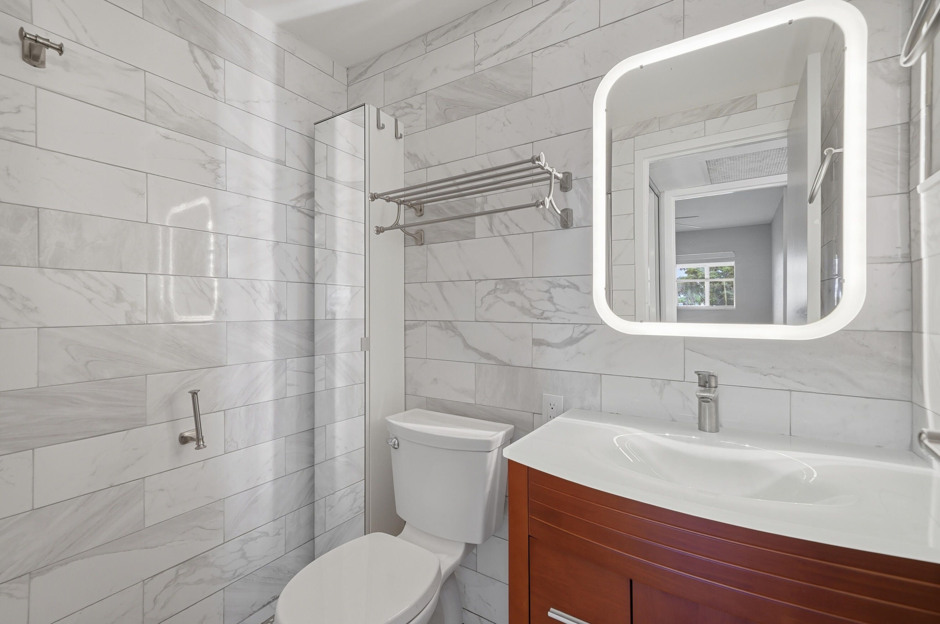 Golf Views & Fully Remodeled! Move right into this tastefully remodeled 2-bedroom, 2-bath condo in the desirable Tuscany section of Kings Point. Tile flooring runs throughout, complementing a fully updated kitchen with modern cabinetry, countertops, and backsplash. Both baths are beautifully renovated with updated fixtures, cabinetry, tile, and safety bars; the hall bath features a newer heat-controlled bidet toilet. Brand-new A/C and dishwasher add peace of mind. Relax on the spacious patio with full-size washer/dryer and panoramic golf course views. Second-floor unit with lift access. Enjoy resort-style 55+ living with clubhouses, pools, golf, tennis, pickleball, fitness centers, theater, dining, activities, and courtesy shuttles. Convenient to I-95 and Turnpike.
