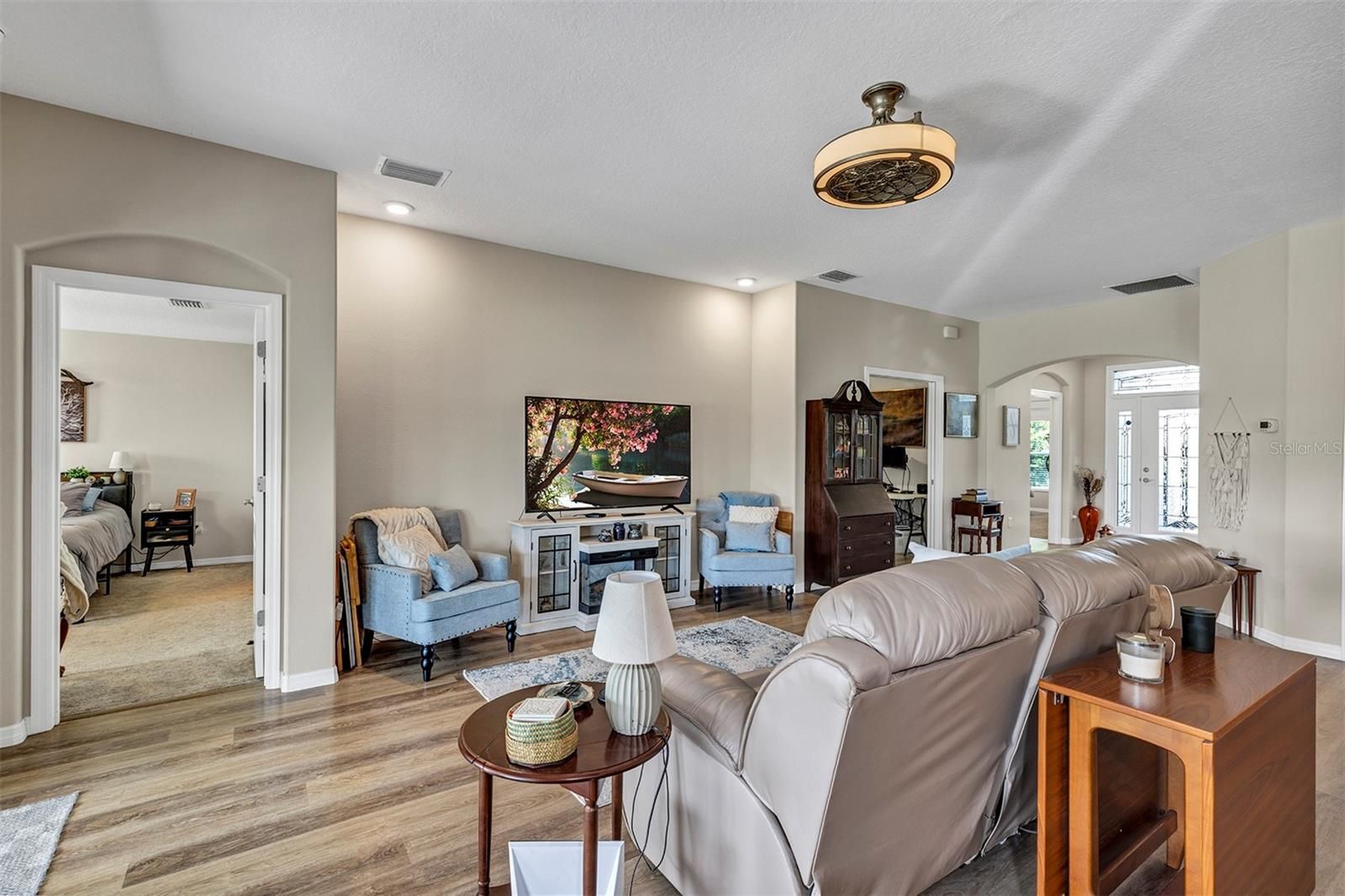 Welcome to a life that feels like vacation every day. Nestled in one of Central Florida’s most desirable resort-styled, guard-gated, active-adult golf communities, this beautiful golf-front low-maintenance 3-bedroom 2 bath home with over-sized 2 car+ garage built in 2019 is located on a quiet cul-de-sac and delivers the comfort, quality, and freedom you’ve been dreaming of all without the resort price tag. Every detail has been thoughtfully cared for giving you peace of mind and more time to enjoy the things you love. Step inside and feel the spacious flow of the 22x16 great room with high ceiling to enhance your sense of space is perfect for relaxed evenings or lively gatherings with friends. The chef’s kitchen is inspired with its natural gas stainless steel range, pantry, and 4-seat bar-top island that’s made for morning coffee and good conversation. The split-bedroom layout offers privacy for you and your guests, while the owner’s suite invites you to unwind with dual vanities, a walk-in shower, and a walk-in closet. The second bedroom also has a private bath. Step out to your golf-front screened lanai with power privacy shades and breathe in the tranquility of the pond and surrounding greenery while sipping your morning coffee or afternoon margarita. With solid block and stucco construction, high elevation, and insurance savings for wind and flood protection, this home offers strength and serenity in equal measure. But what truly sets this home apart is the lifestyle. Arlington Ridge is more than a community it’s a way of living. Spend your mornings on the championship 18-hole golf course, your afternoons at the heated pools or fitness center, and your evenings with neighbors at the on-site restaurant, tavern, or free movie theater. Enjoy tennis, pickleball, billiards, or a peaceful stroll along golf cart-friendly streets lined with sidewalks and manicured landscapes. And with a remarkably low HOA of just $124/month, you’ll enjoy included lawn care, high-speed internet, Wi-Fi, and over 200 cable channels. With hardly any yardwork to worry about, What will you do with all your free time? Conveniently located near shopping, dining, medical services, and a short drive to Orlando’s attractions and both coasts’ beaches, this home blends resort-style living with everyday practicality. Don’t just buy a home, embrace the lifestyle you worked hard for and deserve. Schedule your private showing today and start living your best Florida life at Arlington Ridge. Retirement is not the end, it’s a new chapter just beginning.