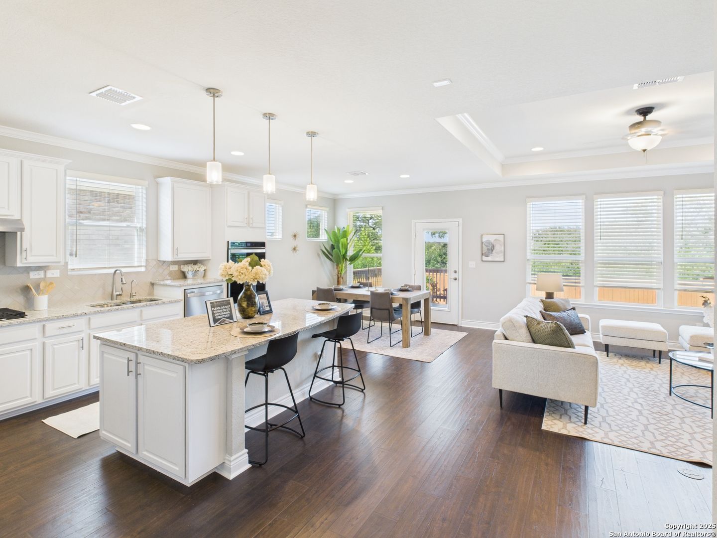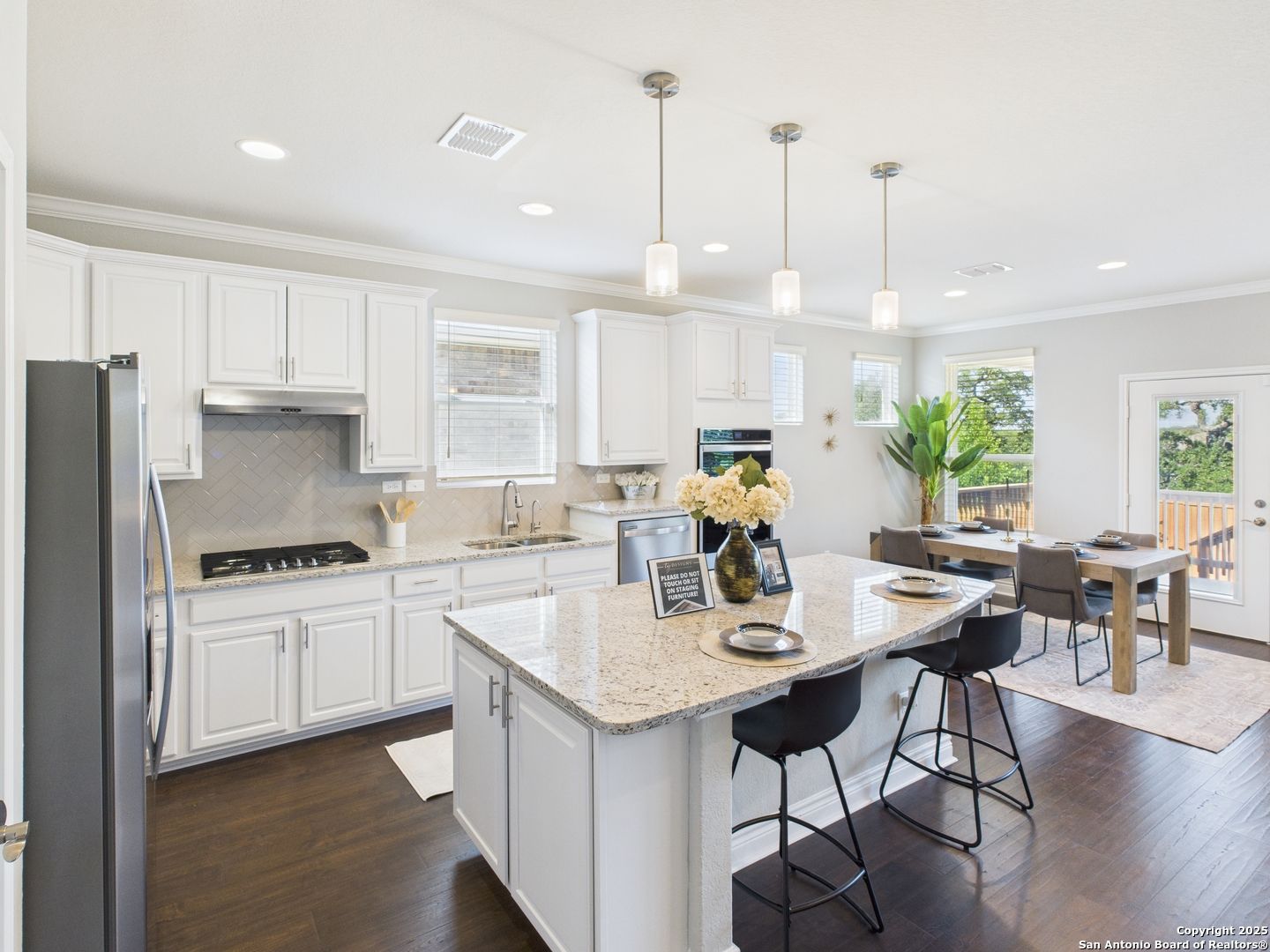 Welcome to easy living in the sought-after Hill Country Retreat by Del Webb! This beautifully maintained single-story home offers 1,720 sq. ft. of comfortable space, featuring 2 spacious bedrooms, 2 full baths, and a private study perfect for a home office or flex room. Enjoy a wide open layout with high ceilings, wide hallways, and no interior steps-designed for convenience and accessibility. The gourmet kitchen showcases rich cabinetry with pull-out shelving, granite countertops, gas cooking, and a large island that seamlessly connects to the dining and living areas. The private primary suite provides a quiet retreat, and the covered patio is ideal for relaxing or entertaining year-round. Outside, mature trees, manicured landscaping, and a greenbelt backdrop offer added privacy and tranquility. Residents can enjoy multitude of amenities, clubs, state of art gym and multiple pools and hot tubs (inside pool is being redone soon!) Plus, miles of nature trails throughout this lovely community. Move-in ready and thoughtfully upgraded-this is resort-style living at its finest!