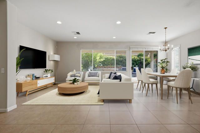 Sun City Palm Desert - St. Maarten. This beautiful home offers exceptional curb appeal with extended hardscape and stunning desert landscaping that create a warm and welcoming first impression. The east-facing rear yard feels like a private garden retreat, featuring an expansive paver patio, lush landscaping, mature citrus trees, an alumawood patio cover, and an above-ground hot tub--perfect for relaxing mornings or entertaining under the desert sky. Inside, the home offers 2 bedrooms, 2 bathrooms, and a versatile den. Tile flooring runs throughout all but the bedrooms, while upgraded baseboards and recessed lighting enhance the great room's open, inviting feel. The den/office sits just off the great room and includes built-in shelving and a solar tube that fills the space with natural light. The kitchen is both stylish and functional with slab granite counters, stainless steel appliances, an island with breakfast bar, pantry, and cabinetry with convenient pull-out shelves. The primary suite provides a peaceful retreat with an ample walk-in closet featuring built-in storage. The ensuite bathroom includes dual sinks and a stall shower with textured glass doors. The guest bedroom offers its own walk-in closet and a Murphy bed for flexible use of space, while the guest bath includes a shower/tub combination. Additional features include a water heater replaced in 2017 and a garage with epoxy flooring and built-in storage. This thoughtfully upgraded St. Maarten blends comfort, efficiency, and inviting indoor-outdoor living in one of the desert's most desirable active adult communities.