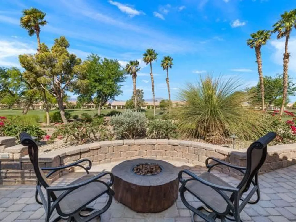 Located in the best 55+ community in the valley, this Orrefors model ON THE GOLF COURSE, has 2 bedrooms, 2 bathrooms and a 'flex room' that could be a nice office but is now used as a bar. Furnishings and the golf cart are available outside of escrow. There are plantation shutters and transom windows throughout. The exterior was freshly painted recently in soothing desert tones. The living room has a double-sided fireplace and a sliding door out to the back patio. The kitchen has Corian counters with a bar and it opens to the family room with fabulous golf course and mountain views. The master bedroom has a bay window with that amazing view and a bathroom with a skylight, walk-in closet, and a walk-in shower. The guest bedroom is adjacent to the other full bathroom and is very inviting. The owner went all out on the backyard patio!! Enjoy the new desert landscaping for lovely outdoor entertaining, or just relax in the hot tub, or sit by the firepit. It has beautiful brick pavers, raised gardens, and several sitting areas to enjoy the awesome sunsets and golfers. The garage has epoxy coating, NEWER HVAC SYSTEM, a laundry area including the washer and dryer, storage cabinets, and a fridge. This home, in this location, is a must see! SUN CITY PALM DESERT IS ALL ABOUT LIFESTYLE!! It has many clubs, activities, amenities, and low HOA dues. Play at 2 championship 18-hole golf courses and practice facilities, pickle ball, tennis, softball, bocci ball, 18-hole miniature golf course, an honor library, arts and crafts, a ballroom for special entertainment, and 4 saltwater pools kept at 87 degrees, with hot tubs. Enjoy 2 great restaurants, a martini/coffee bar, and even a post office. There is a newly renovated classy indoor/outdoor bar with fire tables to enjoy the awesome views and our beautiful desert weather.