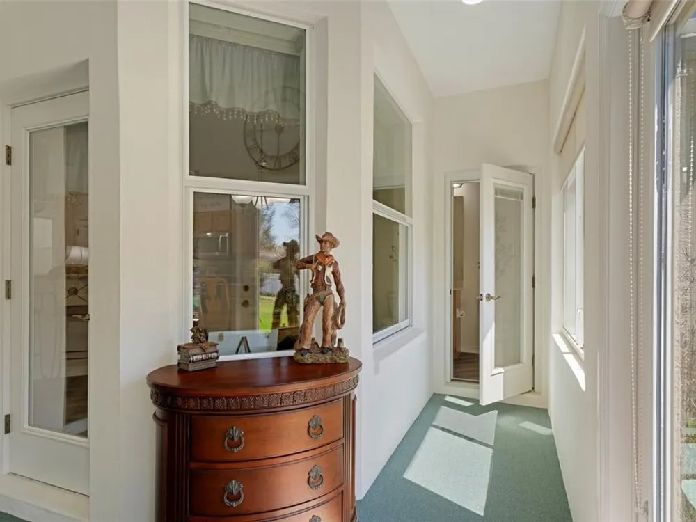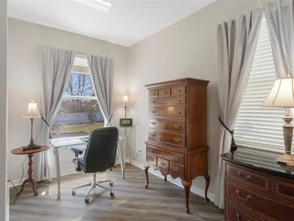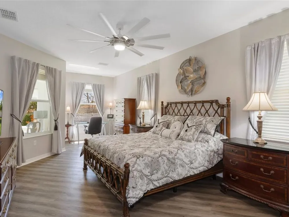 - Ceiling Fan(s), Eat-in Kitchen, High Ceilings, Open Floorplan, Main Level Primary, Solid Surface Counters, Stone Counters, Thermostat, Walk-In Closet(s), Window Treatments