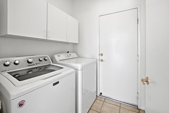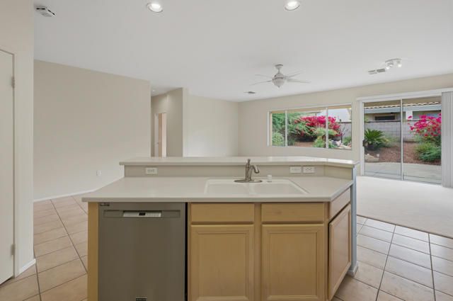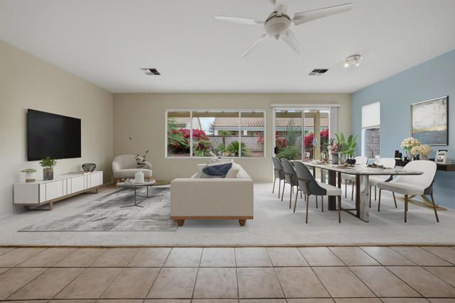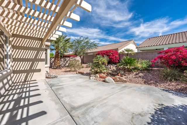 Sun City Palm Desert - St. Maarten. This sought-after St. Maarten greatroom floorplan offers 2 bedrooms, 2 bathrooms, plus a den. The spacious east-facing backyard features an extended patio with alumawood cover and lush desert landscaping for outdoor enjoyment. Updated exterior paint and vibrant flowering cacti enhance curb appeal. Inside, tile flooring extends throughout the main living areas, while the great room opens directly to the rear patio through sliding glass doors. The kitchen includes a chef's island with breakfast bar, Corian counters, a bright recipe window, and a pantry. Off the hallway, a generous den makes the perfect office or hobby space. The primary suite offers a bay window, large walk-in closet, and bathroom with sitting vanity and glass-enclosed shower. A guest bedroom with walk-in closet is adjacent to the full guest bath with tub/shower combo. Additional highlights include a laundry room with built-in storage, a 2-car garage with cabinetry, and a newer AC unit installed in 2019.