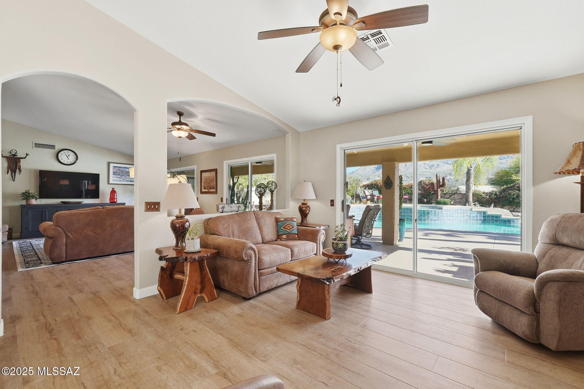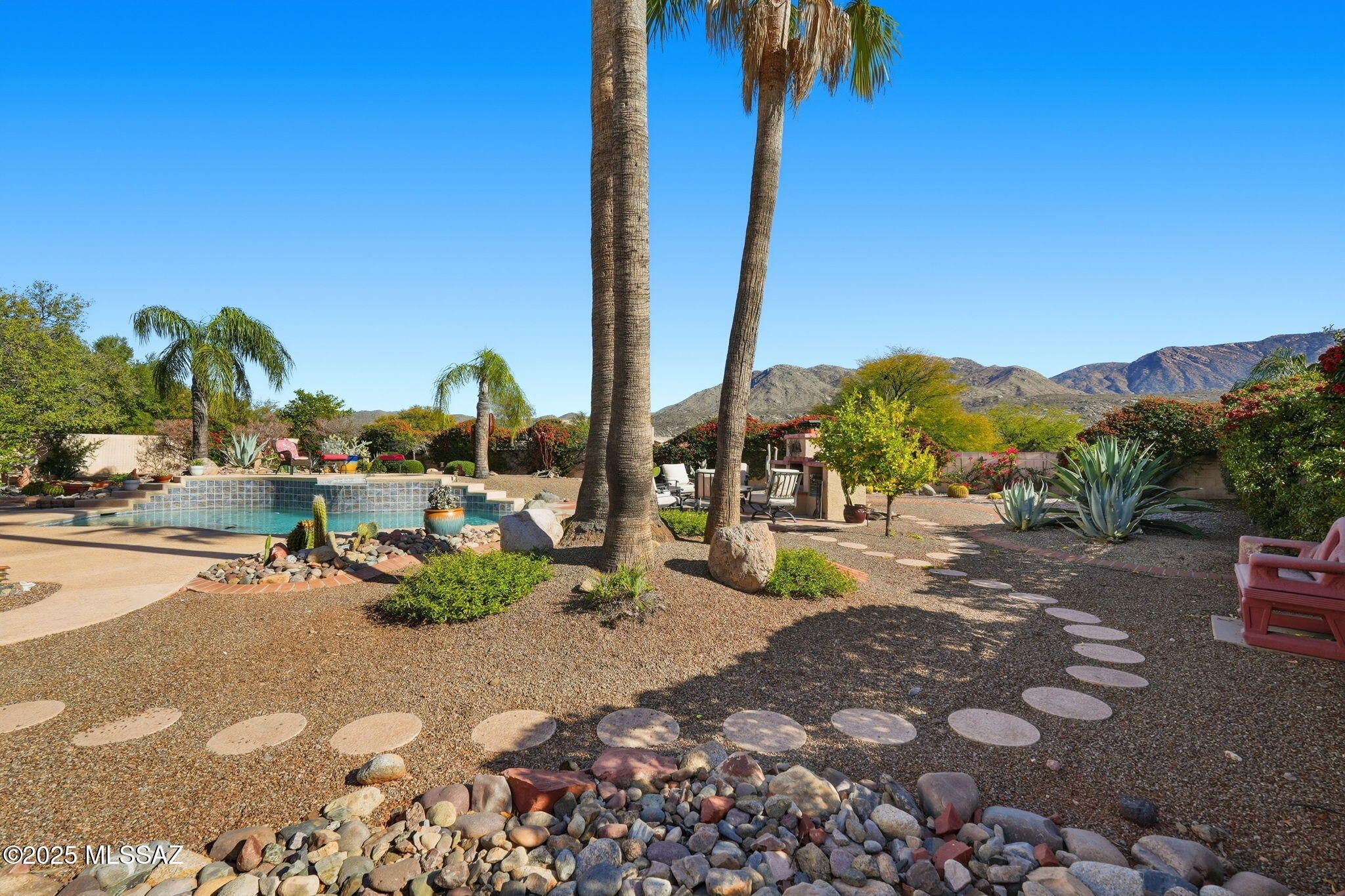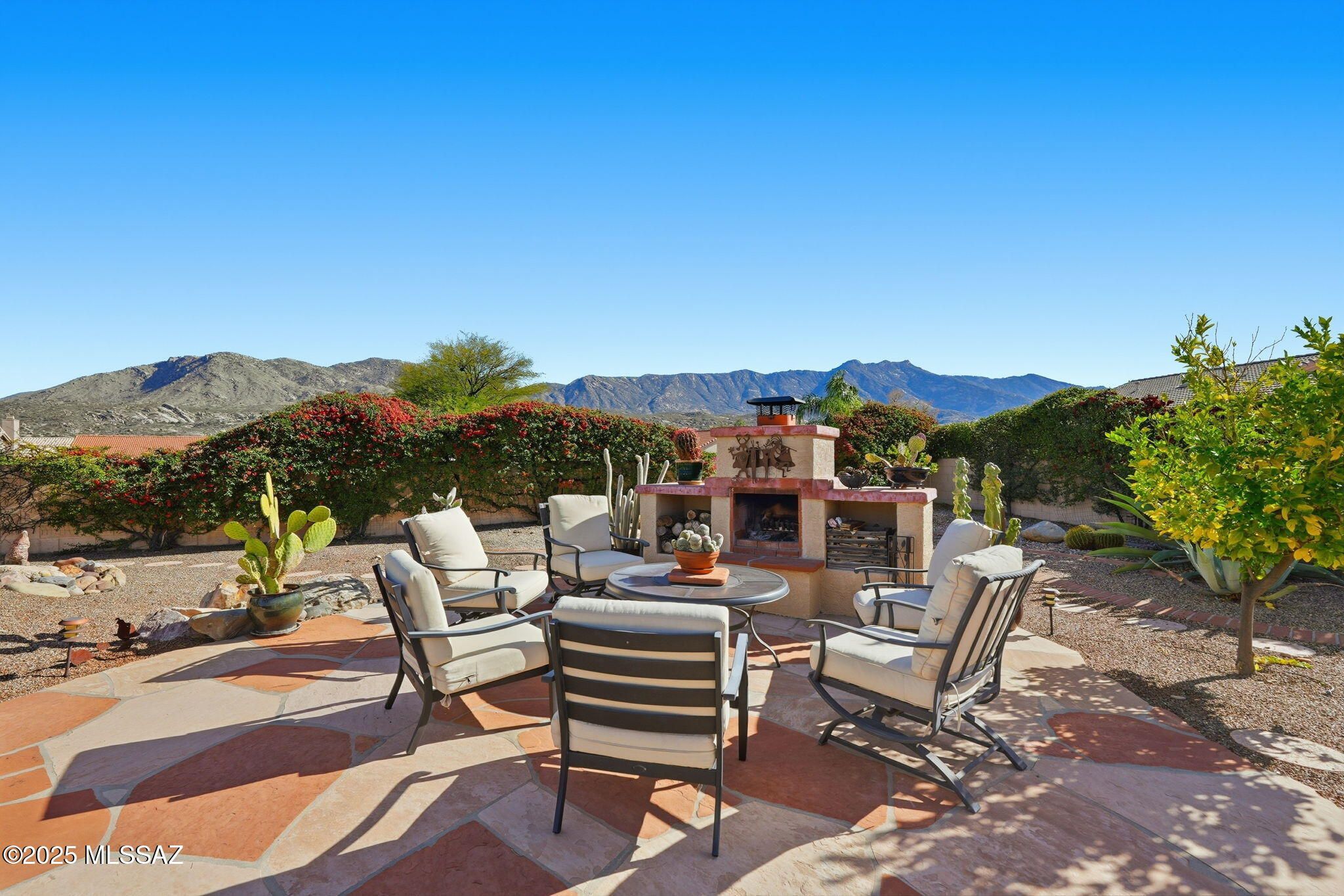 Beautiful Topaz floor plan with dual primary suites and private casita, offering exceptional flexibility and comfort - with spectacular mountain views plus heated pool and spa. Roof underlayment replaced (11/25) providing peace of mind. The kitchen features granite countertops, two wall ovens plus MW/convection, opening to light-filled dining area with bay window. Spacious living and family rooms showcase a stacked rock gas fireplace and sliding doors that frame the views and connect seamlessly to the back patio for indoor/outdoor living. Primary bedroom includes slider to the patio, ideal for enjoying the scenery and private oasis. Large laundry room doubles as butler pantry. Luxury vinyl through living spaces, carpet in two bedrooms, and casita has ceramic tile floor for easy care.